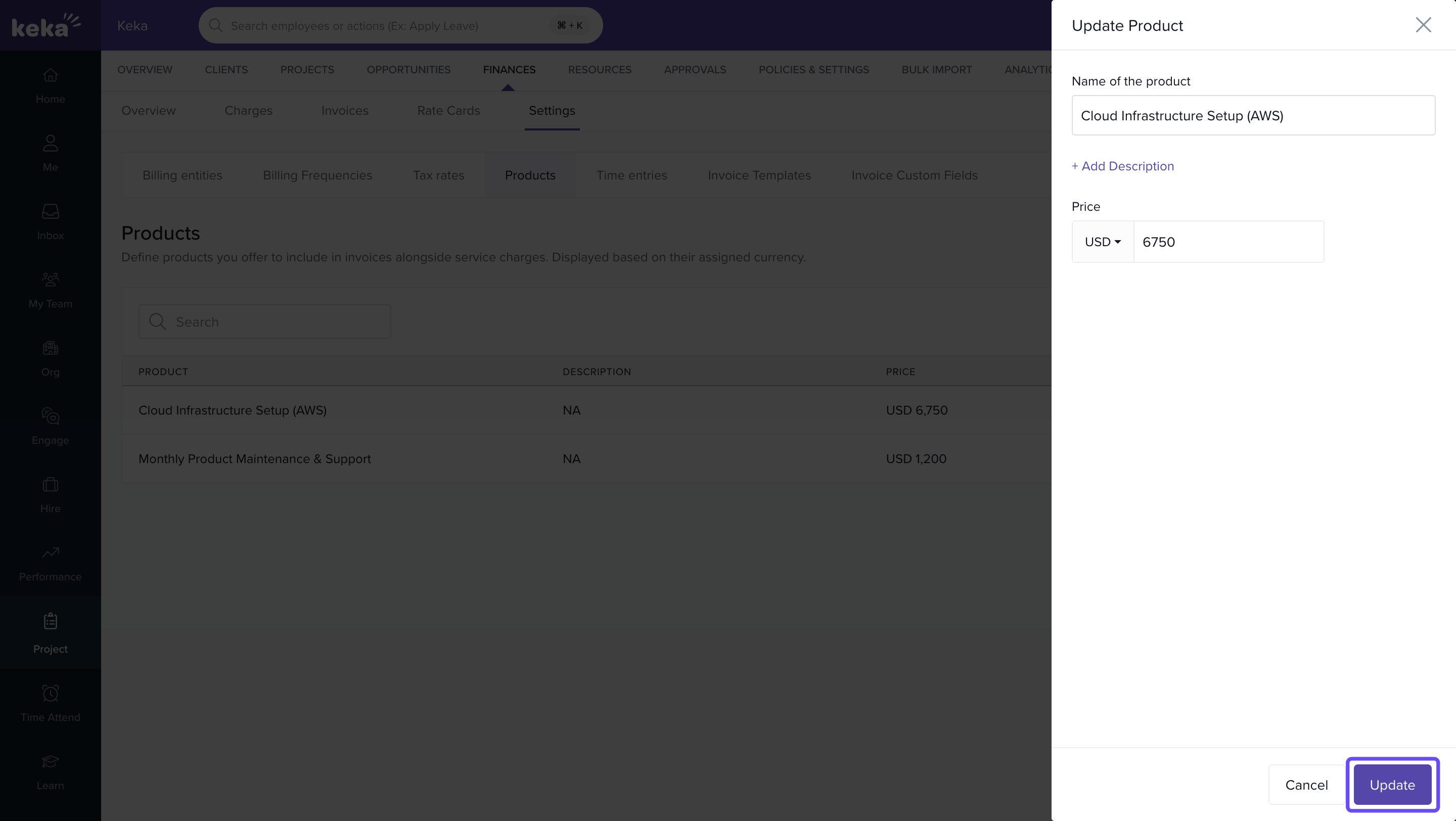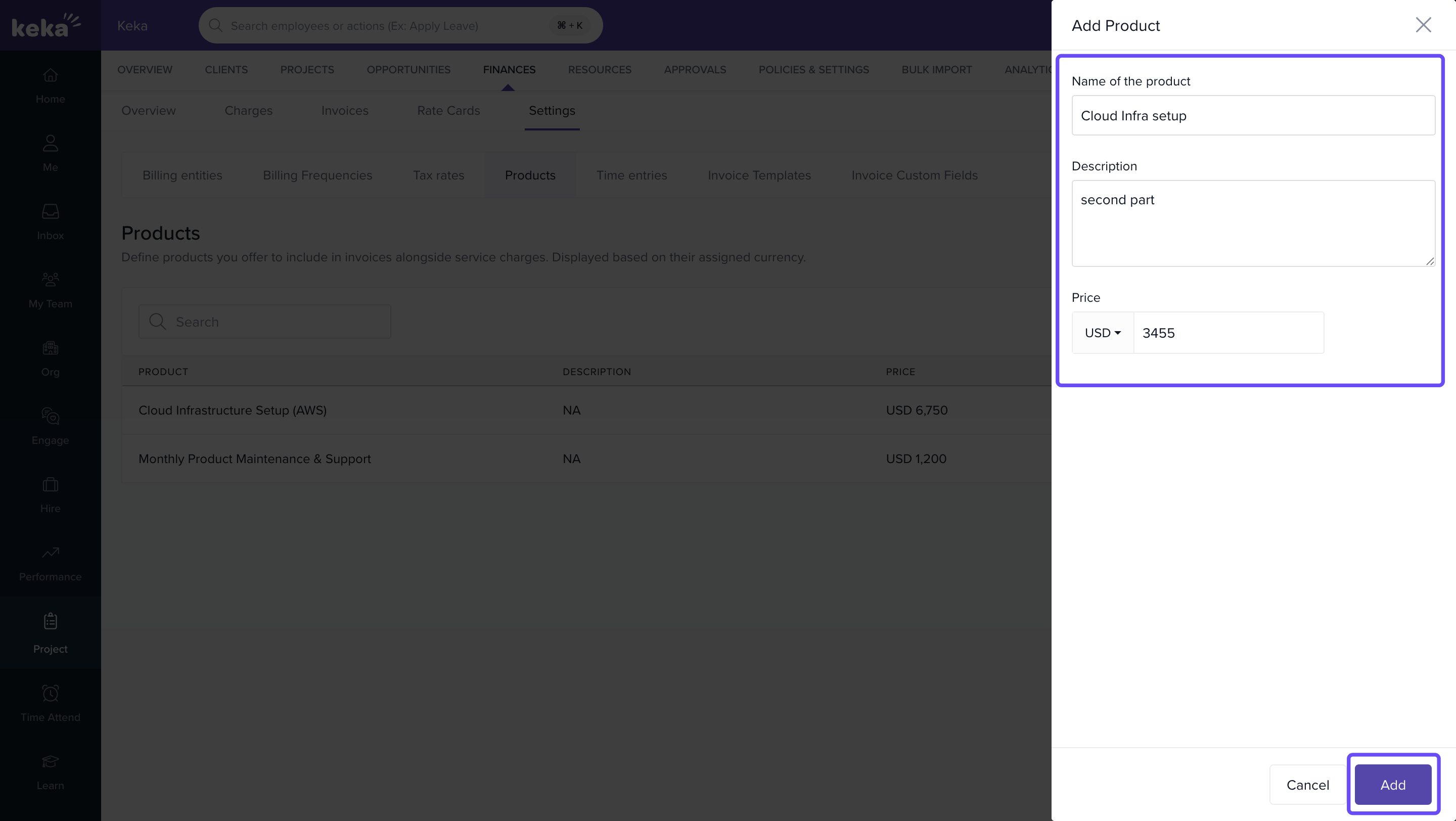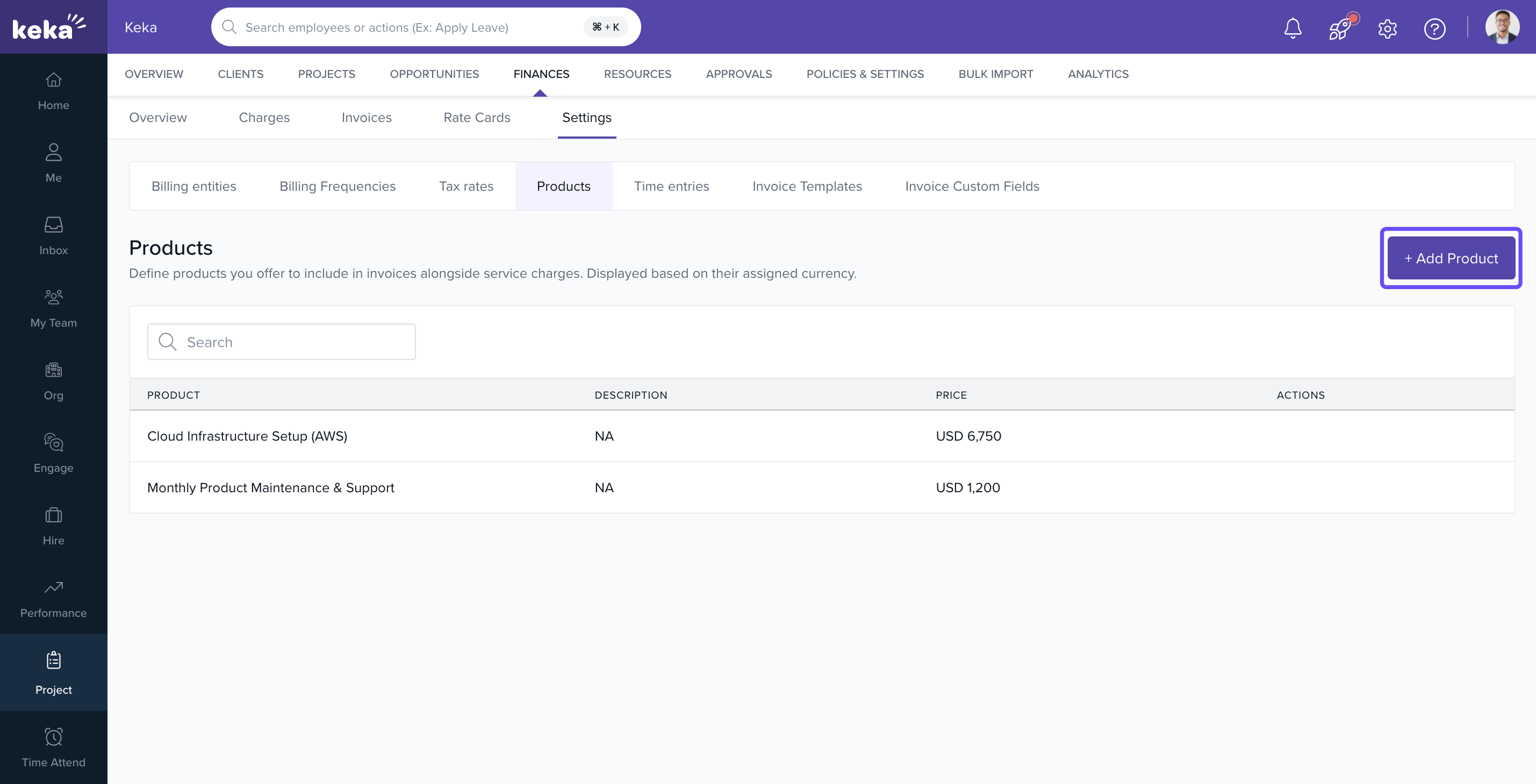 This article explains how to add, view, edit, and delete product subscriptions in Keka PSA. These product entries can be included in project invoices and are useful for billing clients for tools or services used during project delivery.