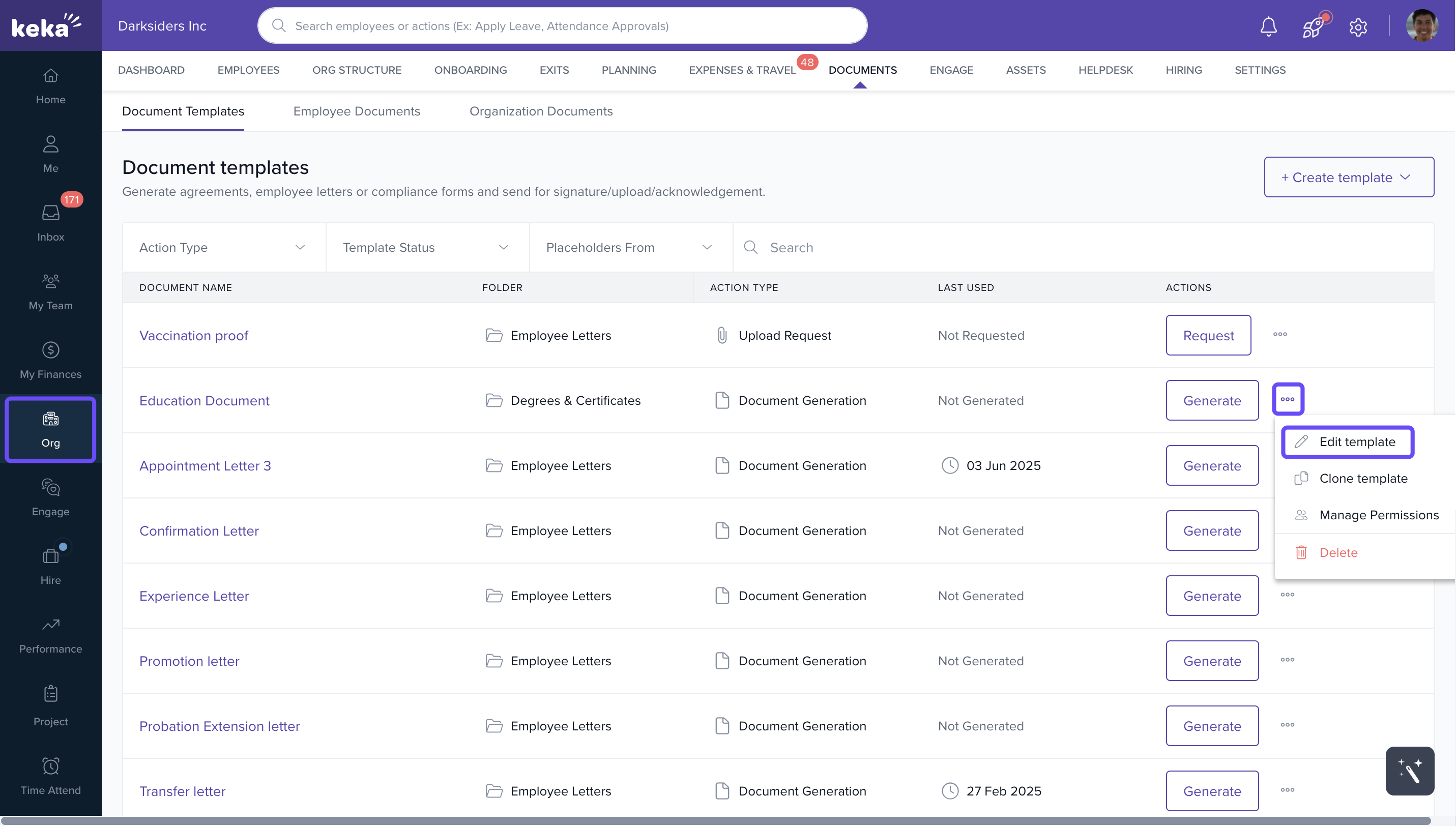 - Go to Org from the left navigation panel and select the Documents tab. Make sure you’re on the Document Templates tab. Here you can view all existing letter templates. You can either edit an existing one or add a new template.