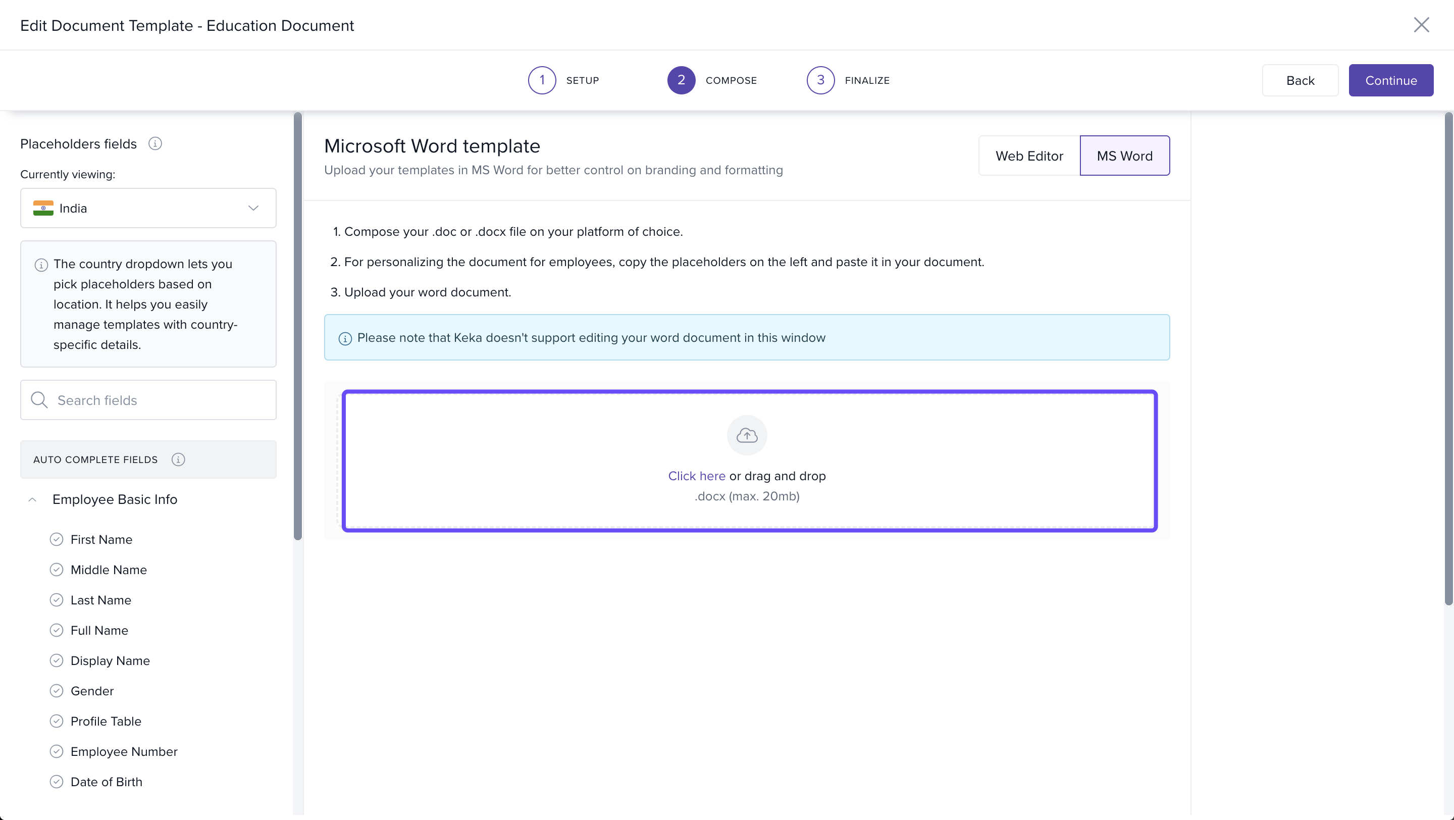 - In the Compose section, open a Microsoft Word file and write your letter content. You can use placeholders from the list shown on Keka — hover over a placeholder to copy it, then paste it into your Word file. These placeholders will auto-populate with employee details during letter generation. Save the Word file once done.