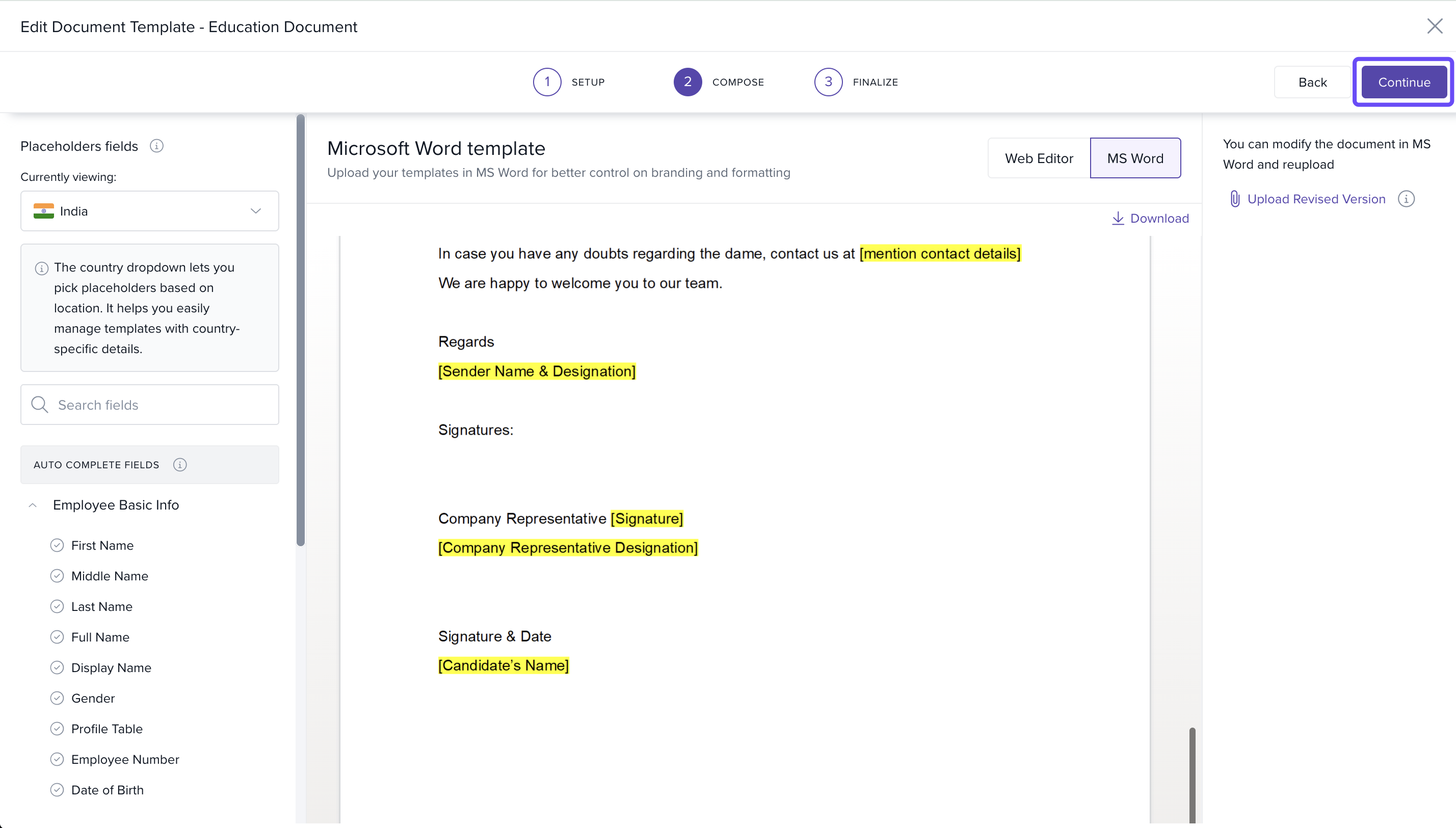 - Click on MS Word to upload your file. Keka will automatically check for any errors, such as invalid placeholders. Fix any detected errors in your Word file, then click Upload Revised Version to re-upload.