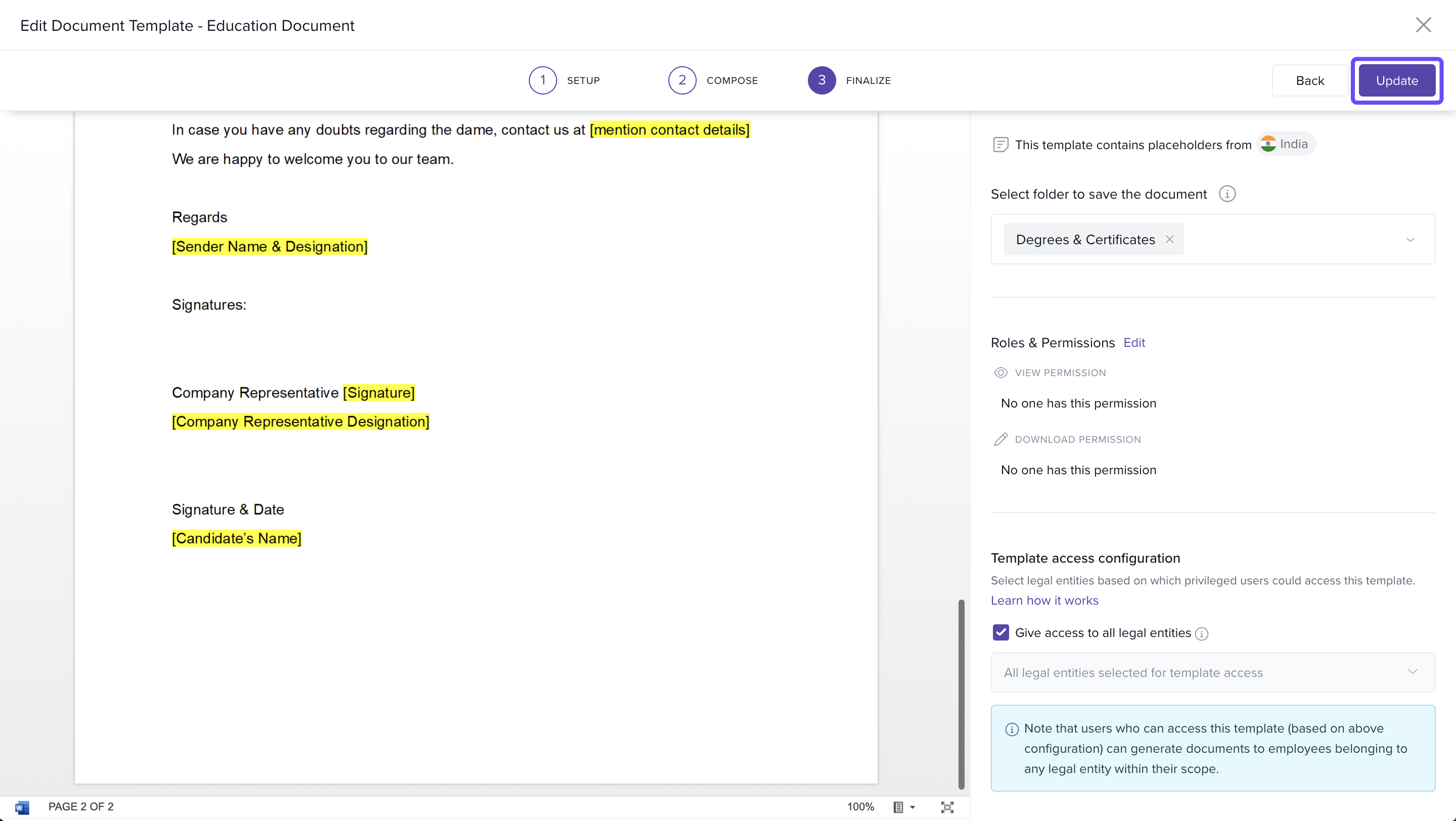 - On the Finalize page, preview the uploaded letter template. You can edit viewing and download permissions and choose the folder where this template should be saved.