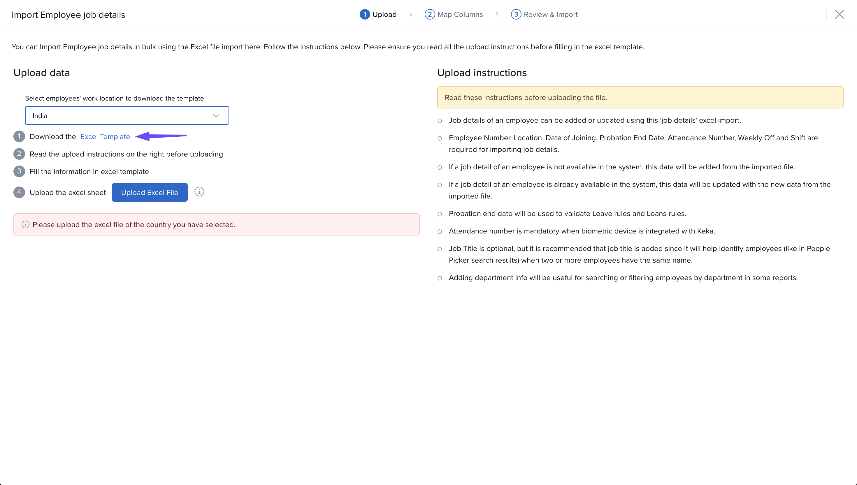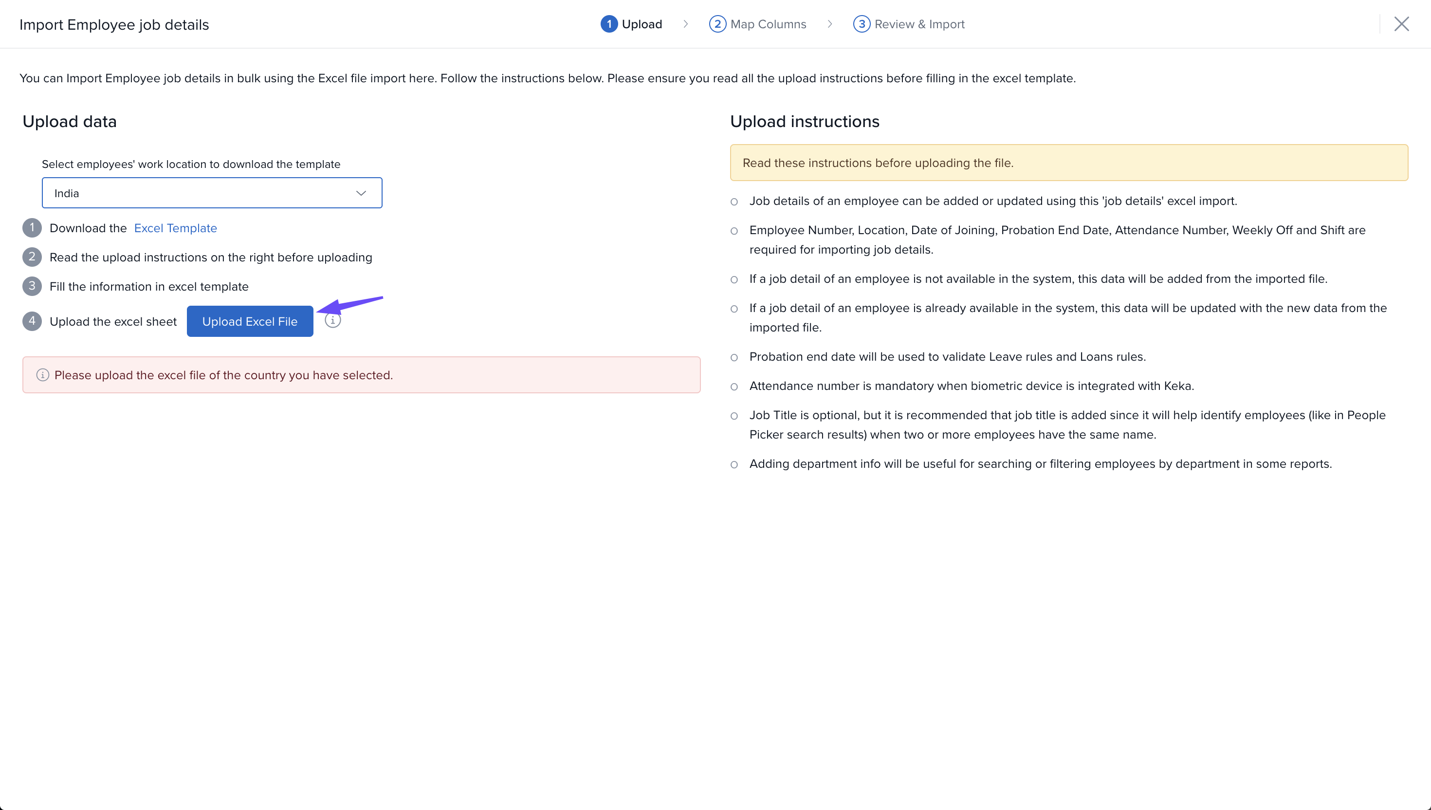 After updating the file, go back to the Keka portal and click on the Upload Excel File button to upload the updated file.