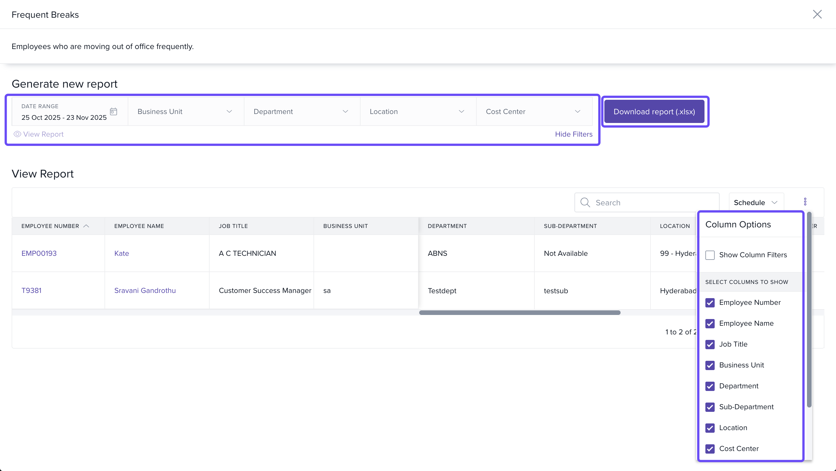 - Select Frequent Breaks – Employee Moving Out of Office Frequently or Least Hours Worked – Worked Less Than Effective Hours.