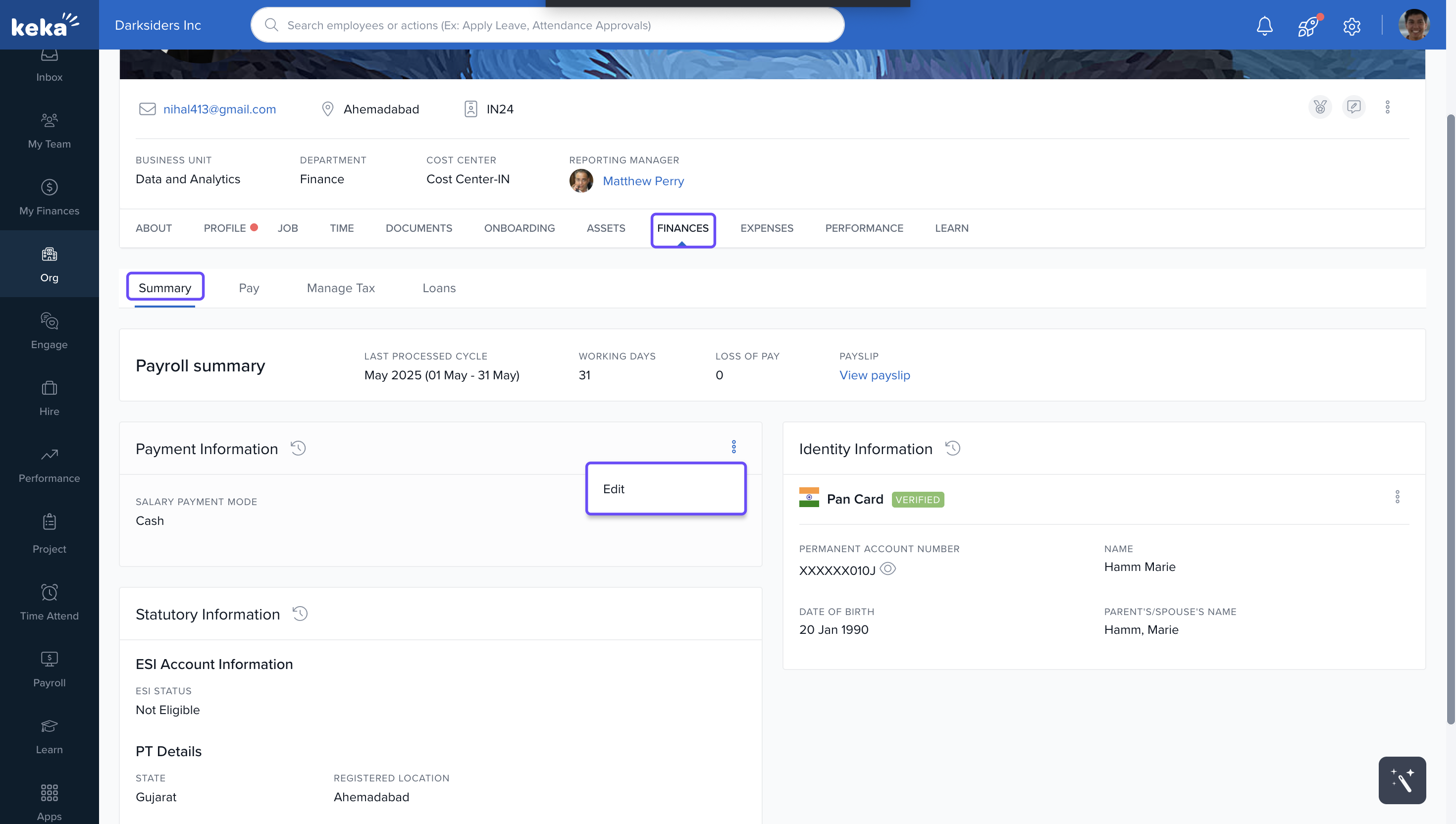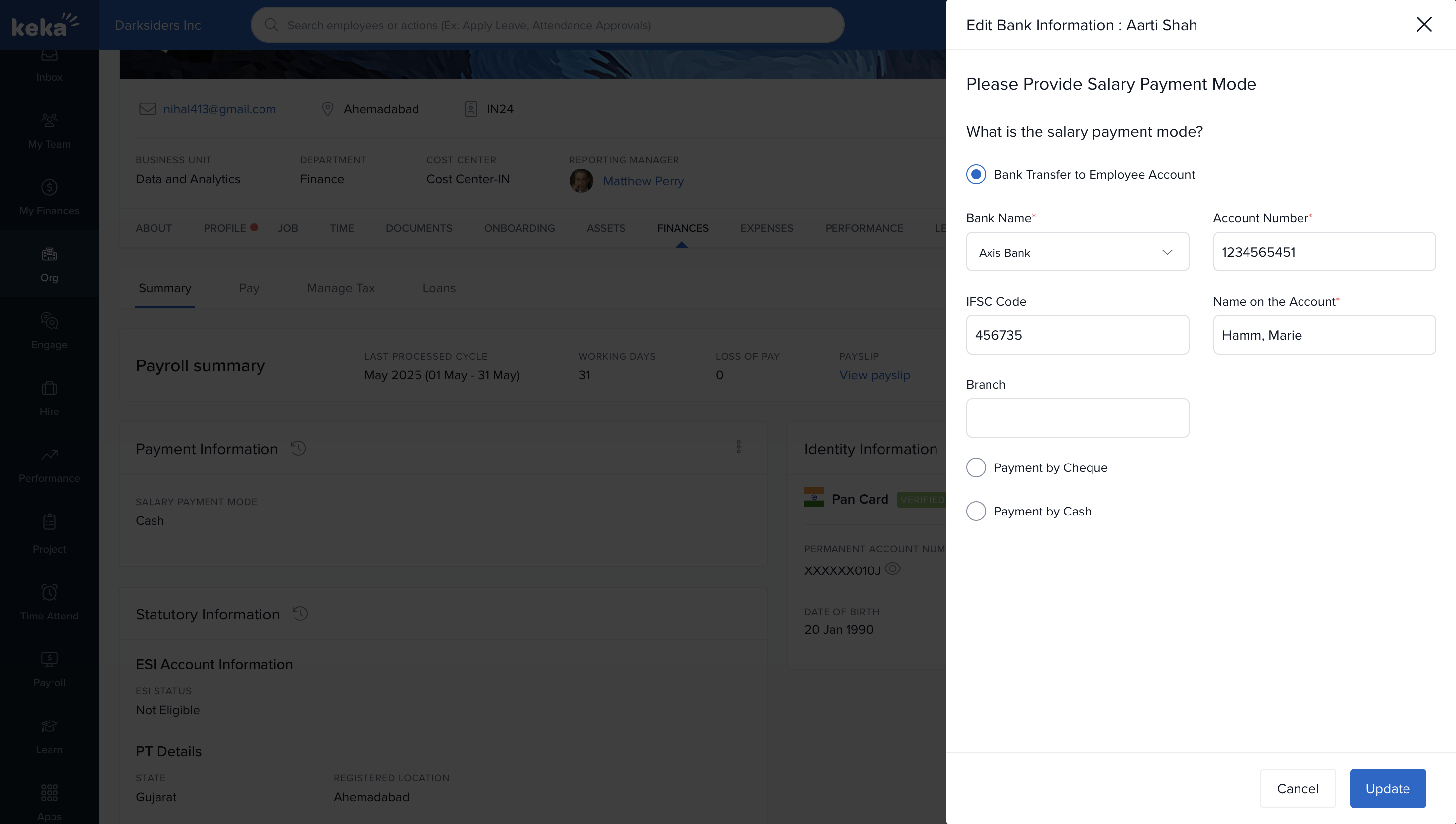 When an employee joins an organization, their financial information—such as salary payment mode and bank account details—is collected and updated in Keka.