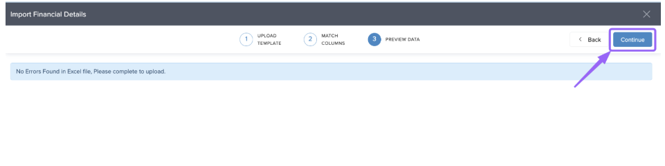 Click Continue → Preview Data → Complete to finalize the upload.