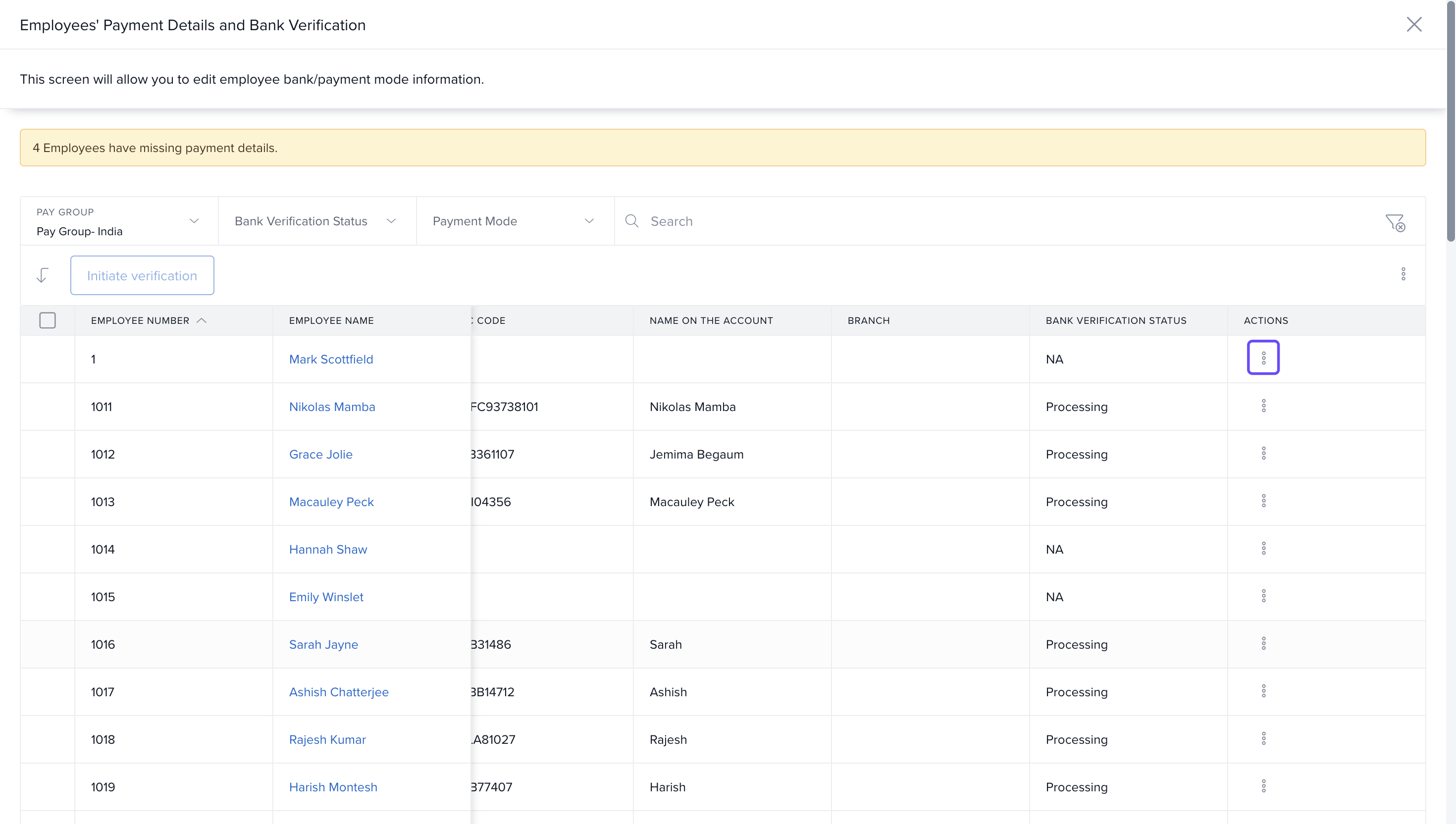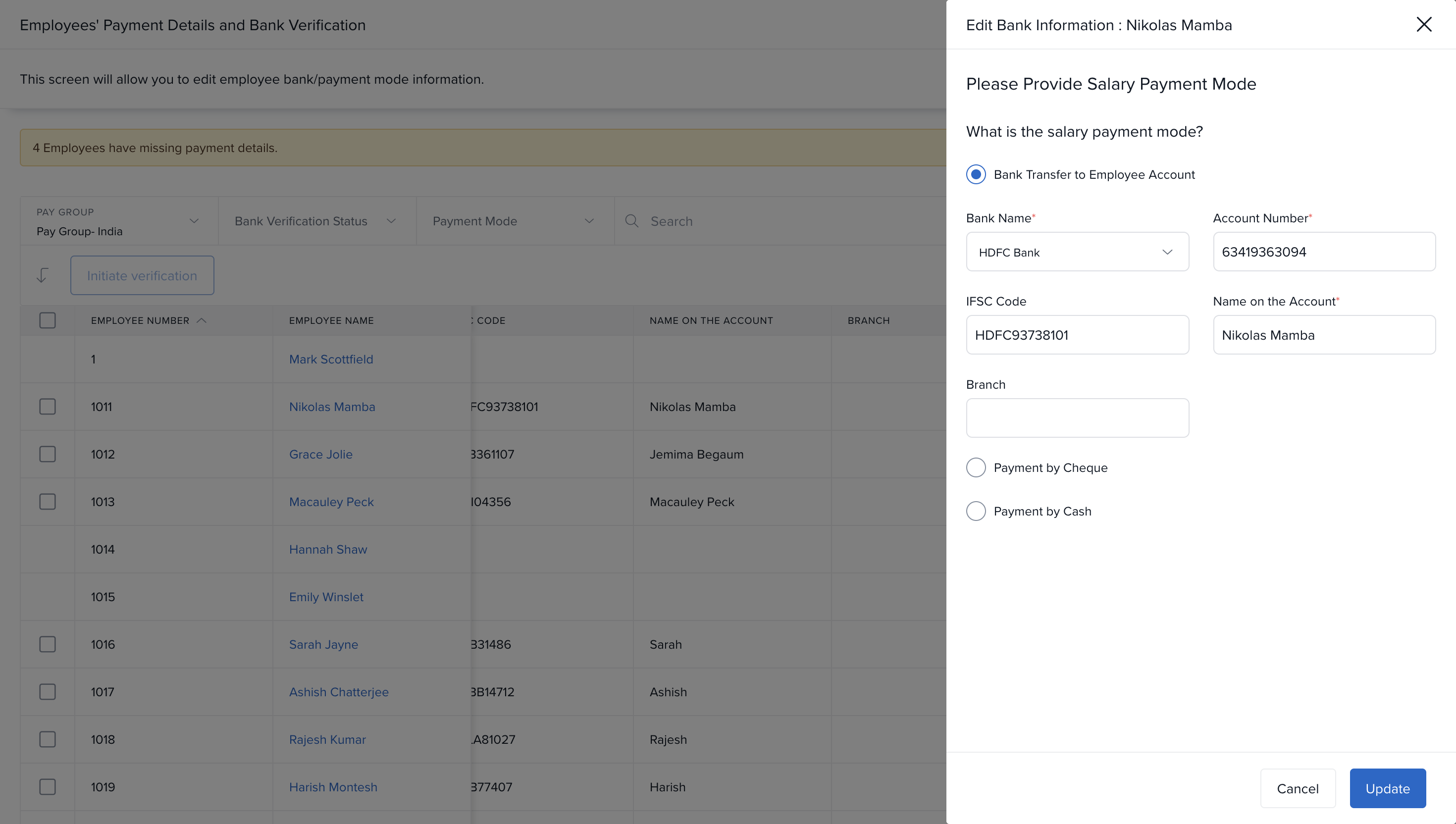 Over time, employees may switch banks or the organization may partner with a new bank for salary disbursement. In such cases, you can easily update bank details for one or multiple employees.