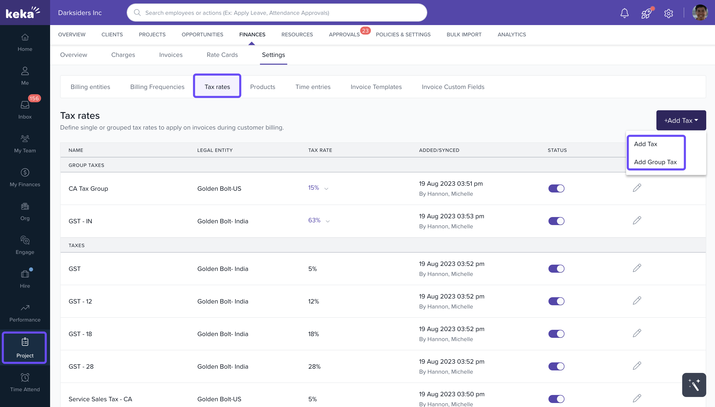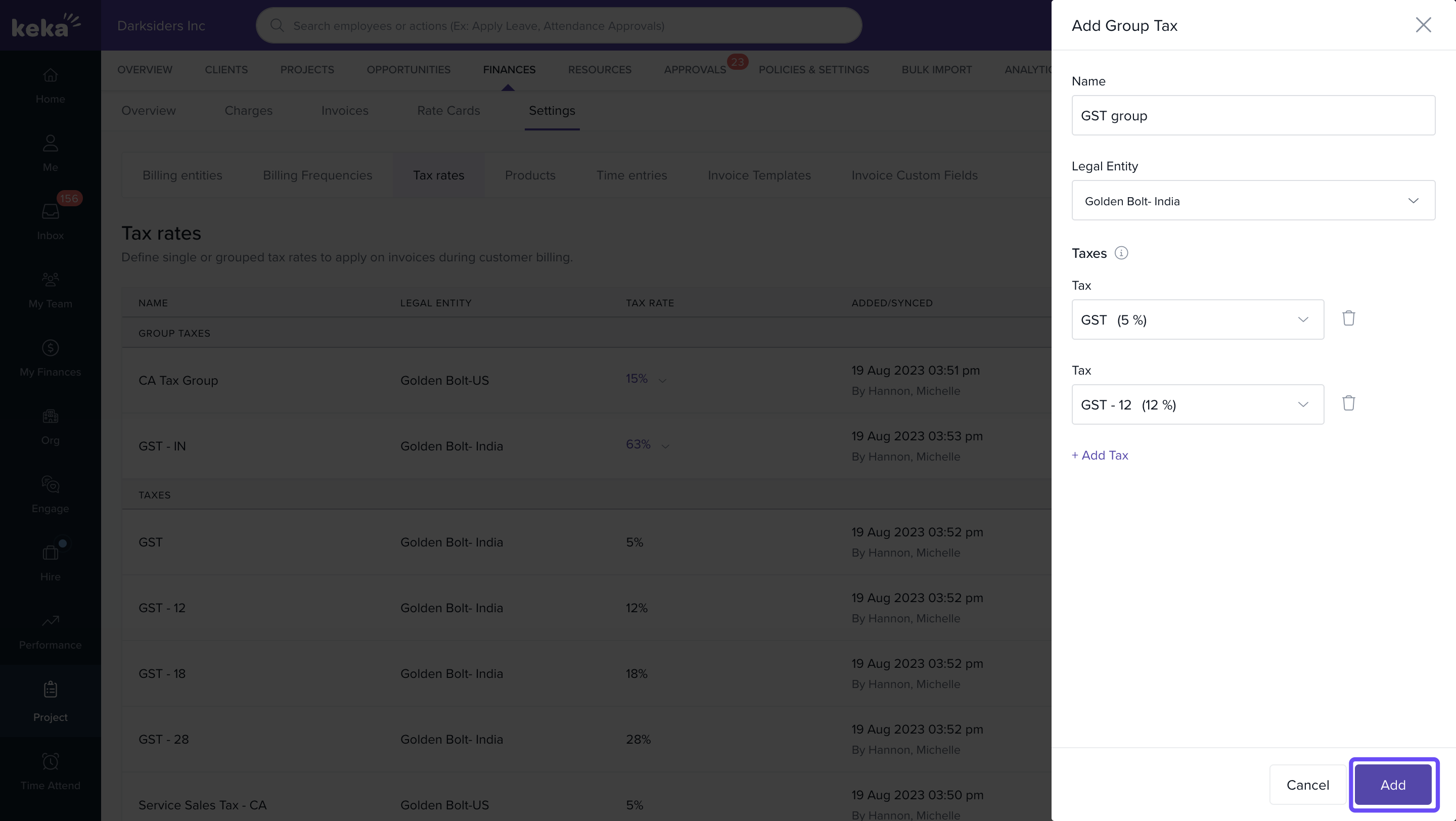 - To add a group tax, click Group Tax, provide the Tax Group Name, select the Legal Entity, and list the applicable Taxes under the group.
