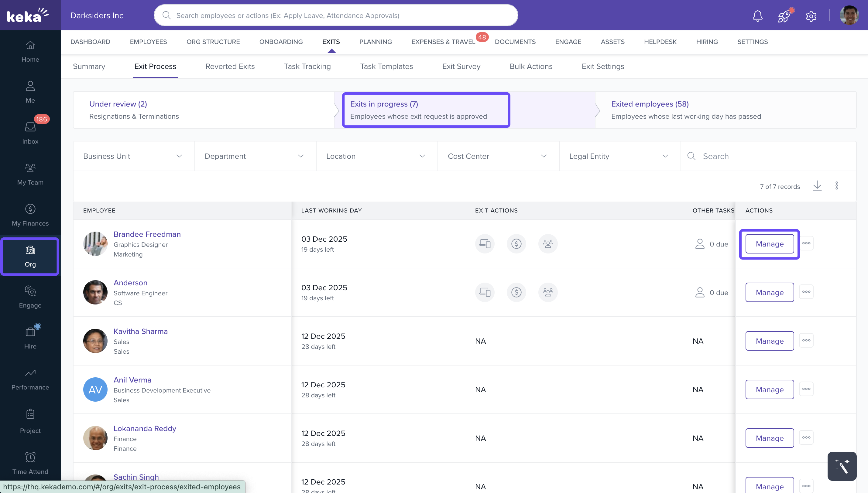 - Go to Org > Exits > Exit Process > Exits in Progress to view the list of employees whose resignations have been approved or accepted.