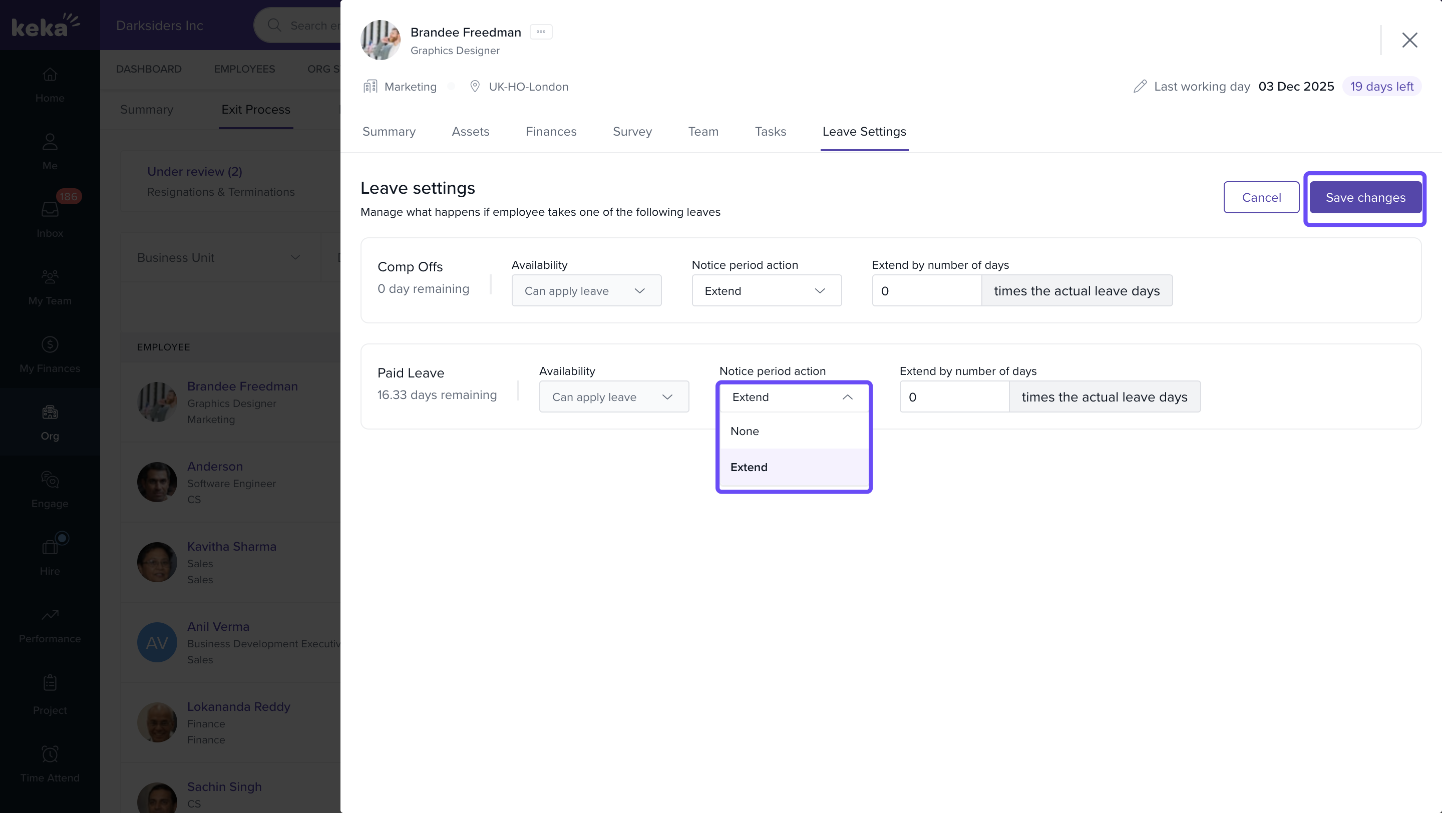 - In the Notice Period Action dropdown, select None for the leave type where you want to remove the extension.