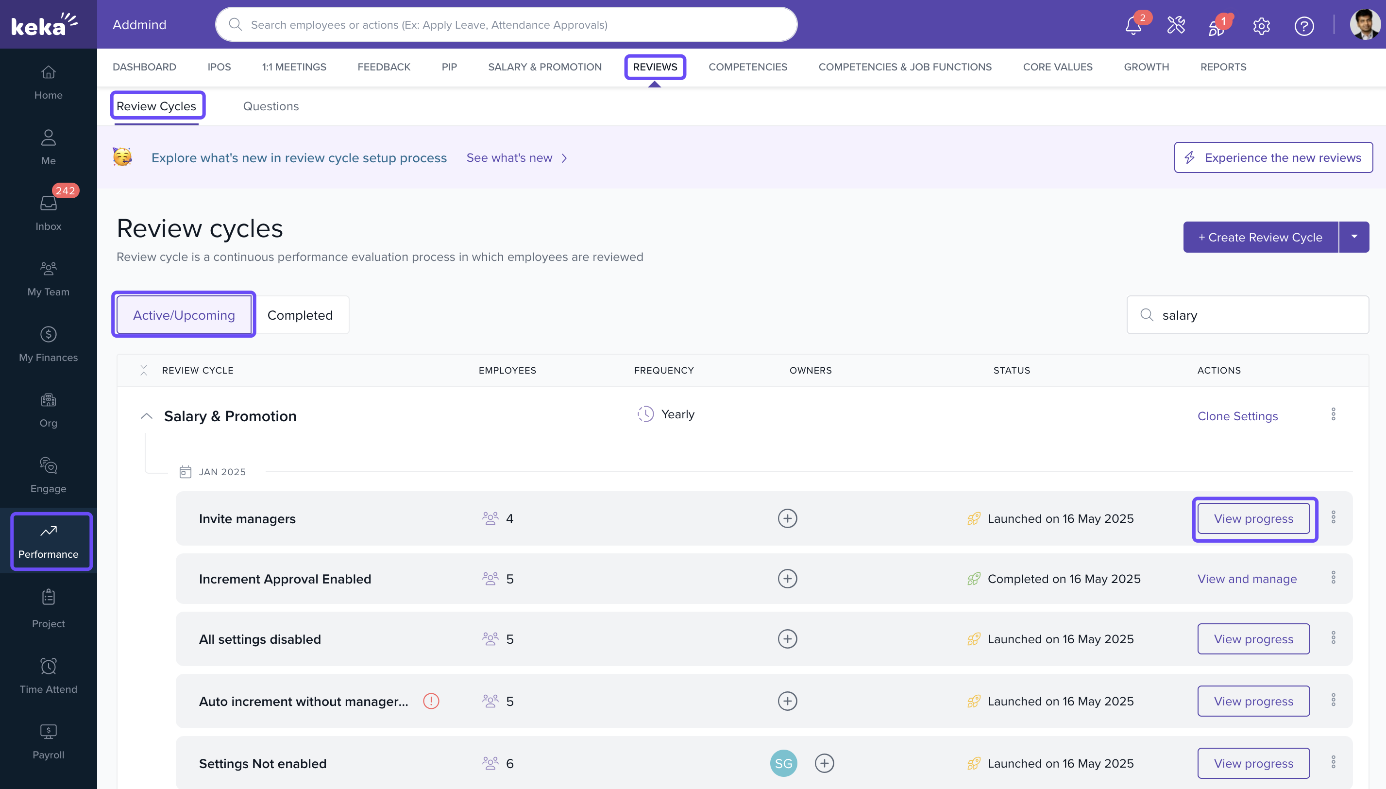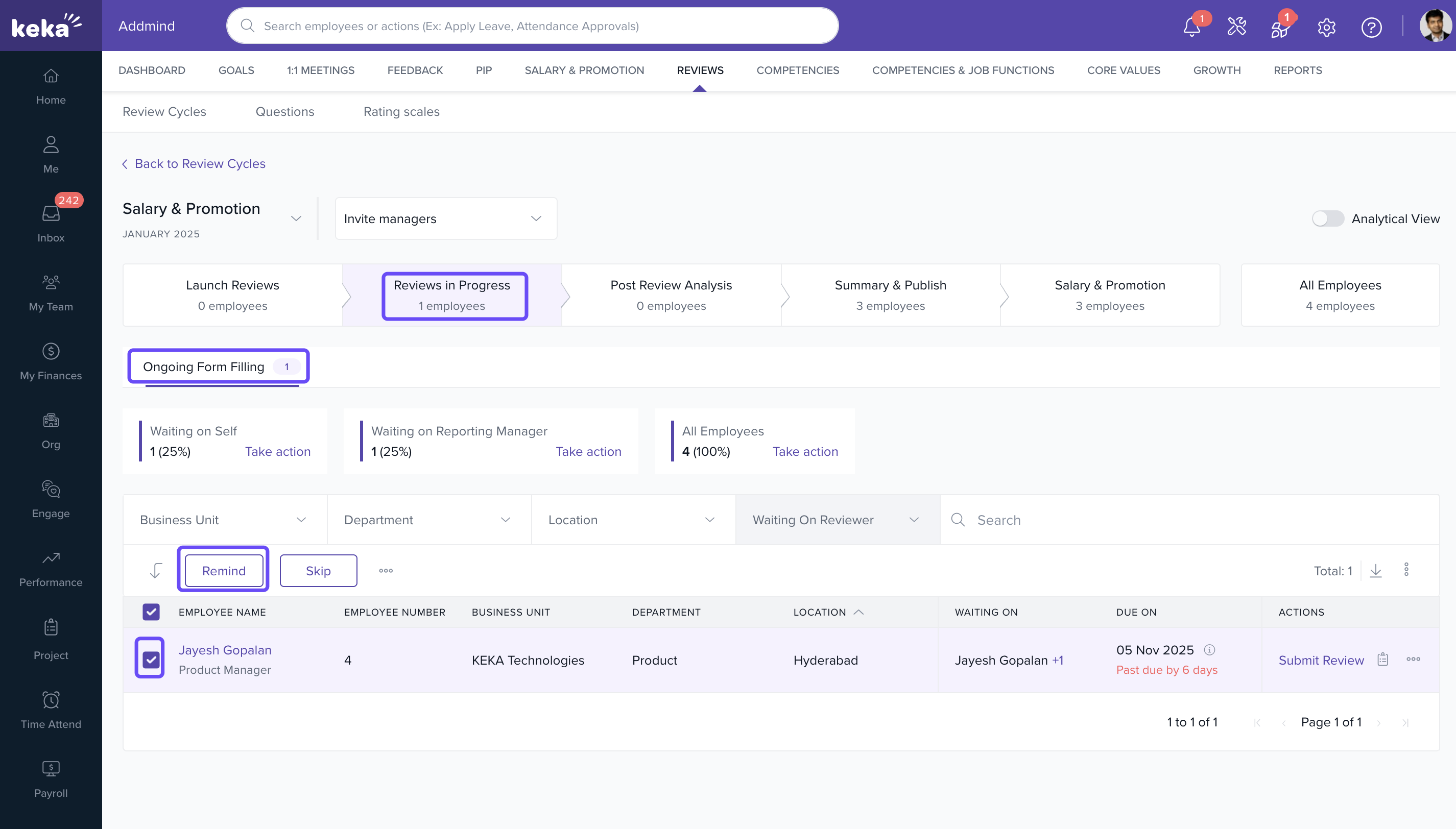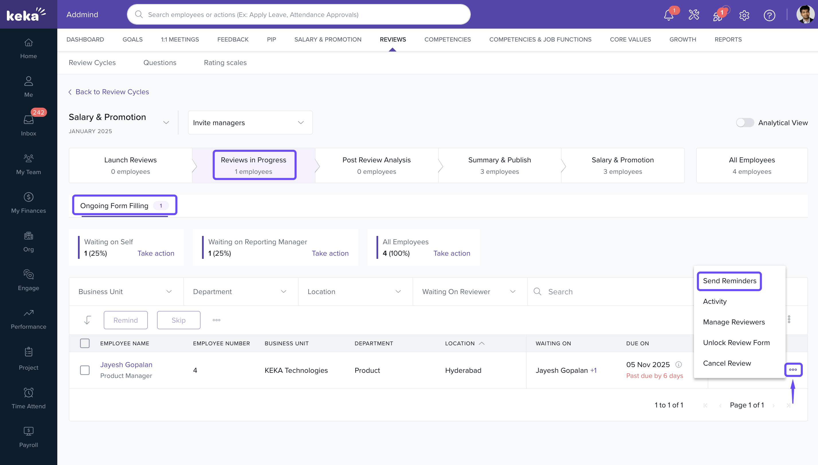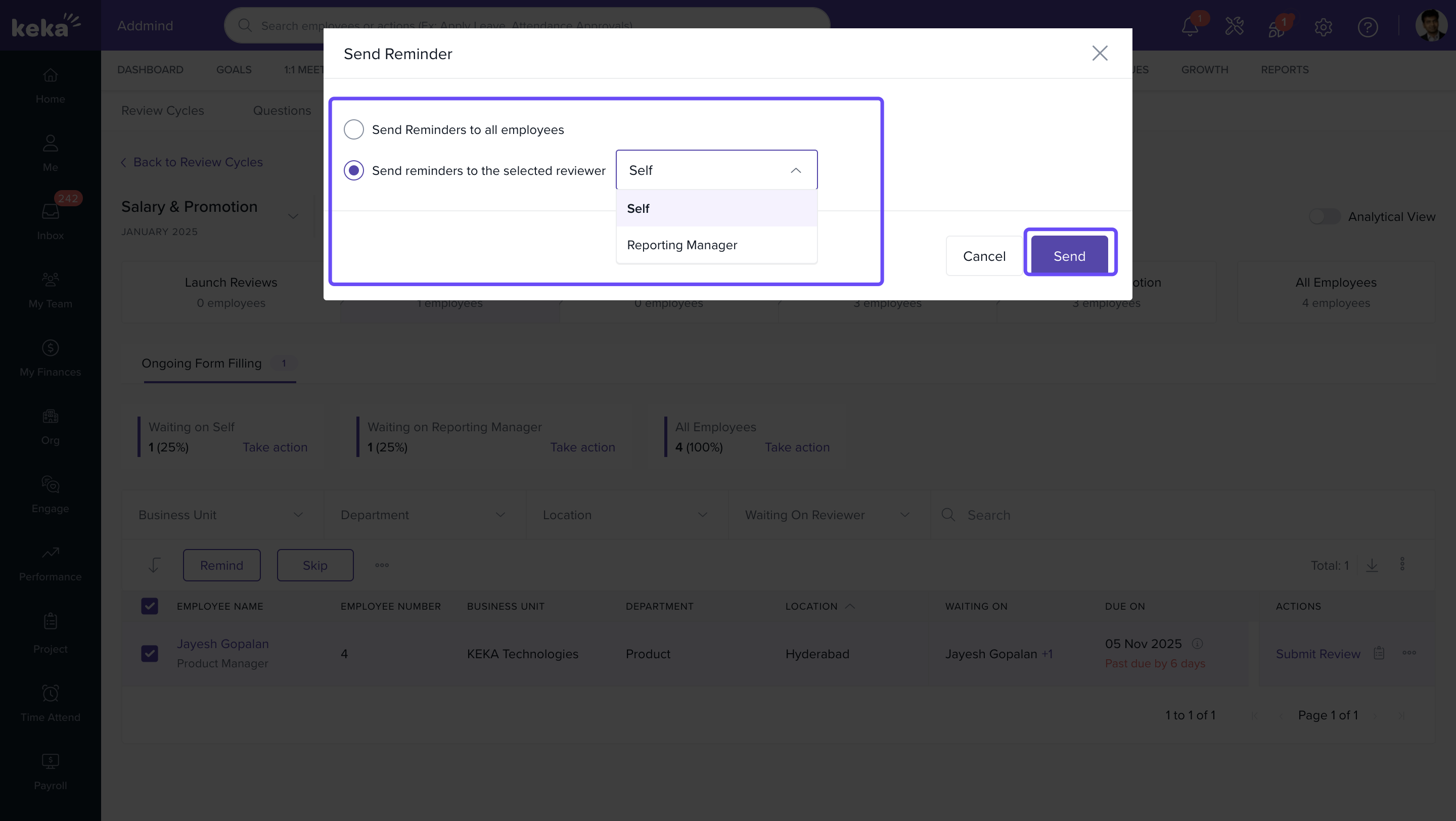Sometimes employees may miss submitting their review forms during a review cycle due to unforeseen circumstances. Keka allows Performance Admins to send reminders—helping keep the process on track.
