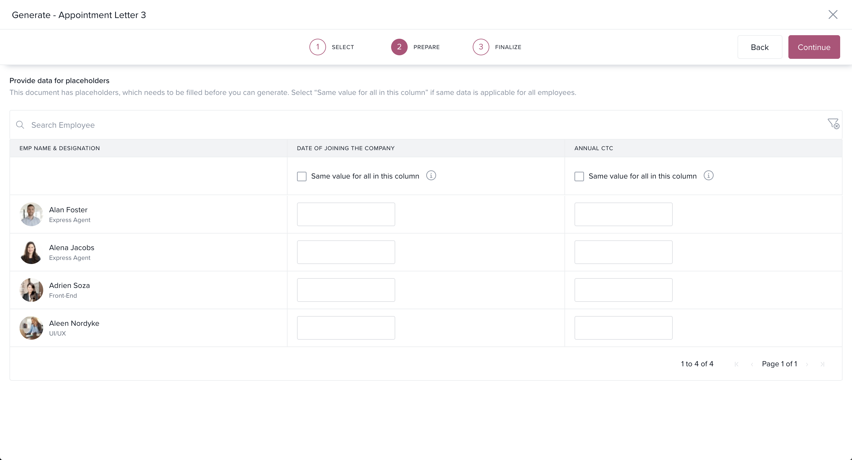 - Provide the necessary data that must be included in the letter for all employees during the second step, Prepare, and then proceed by clicking Continue.