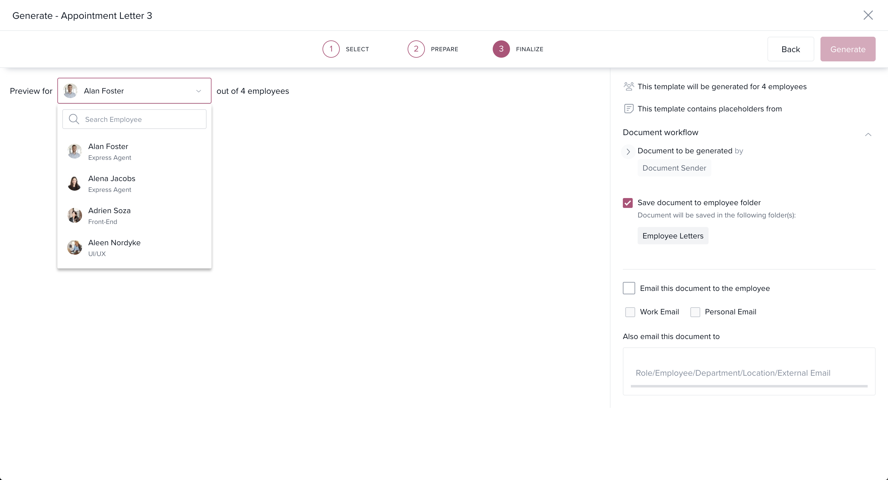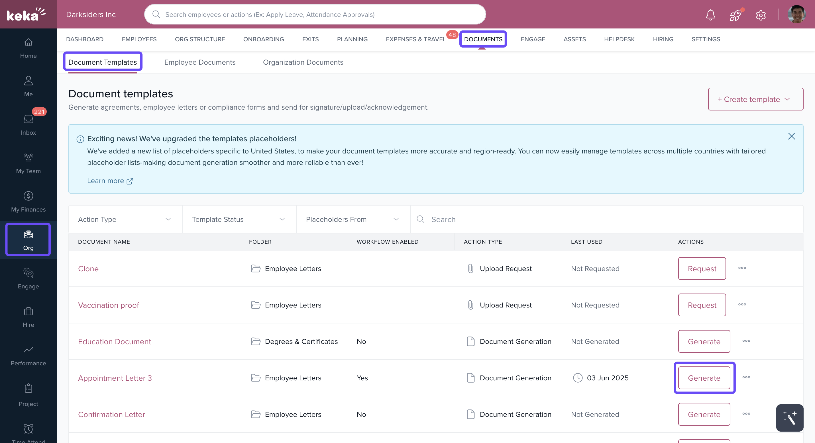 Keka provides you the option to generate letters like offer letters, appraisal letters, appointment letters, etc., through the portal itself in a very seamless manner. As admins do not need to draft and generate it separately for all the employees.