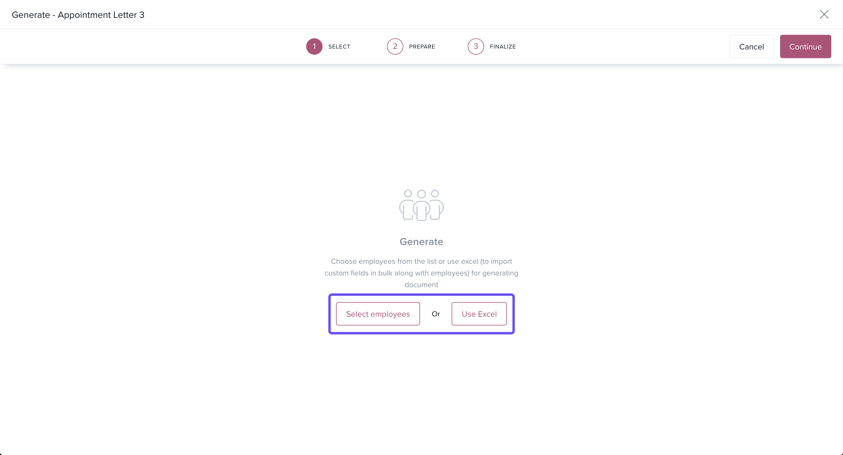 - In the first step, select the employees by clicking on Select Employees or Use Excel. Then, click on Continue.
