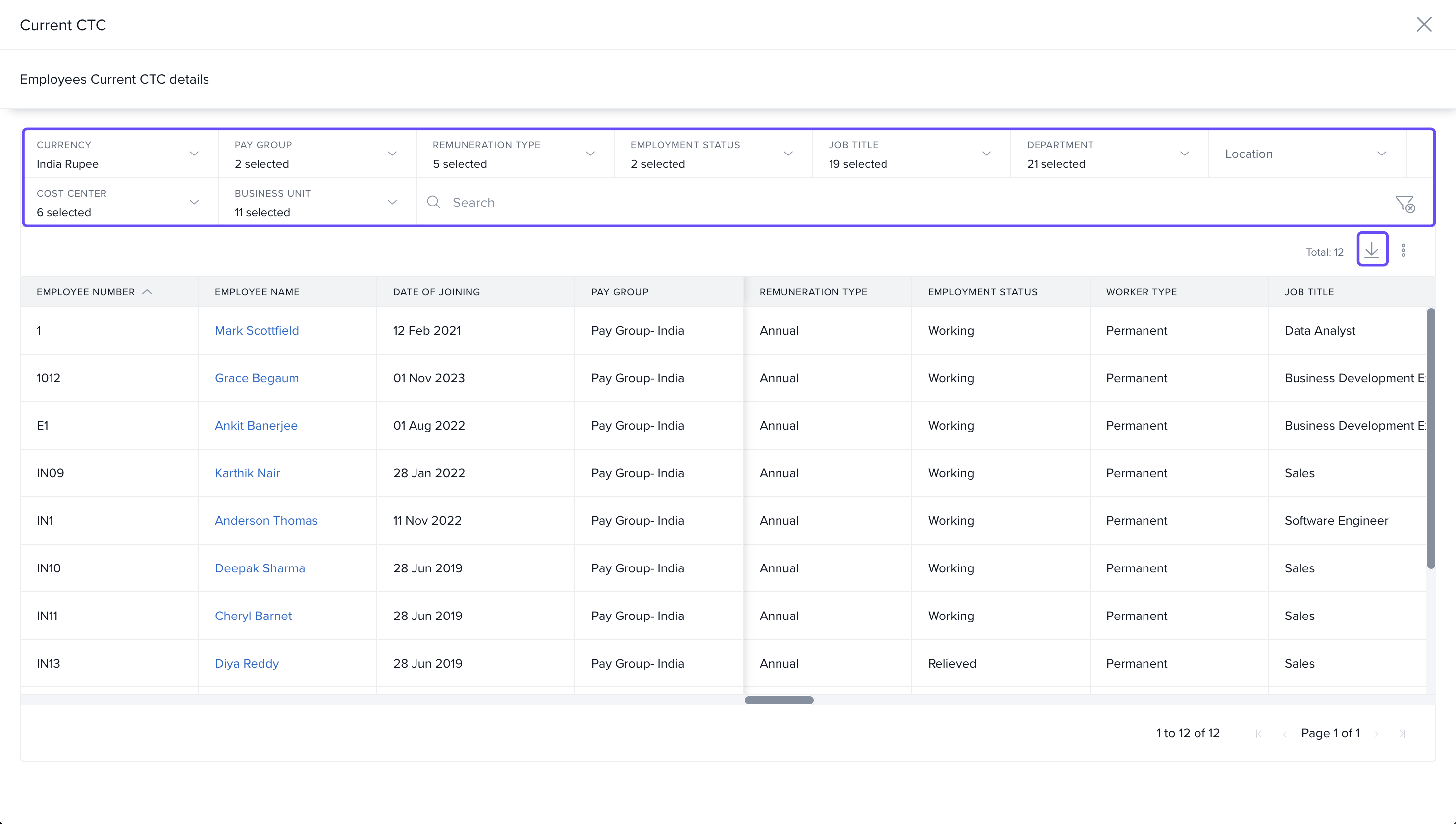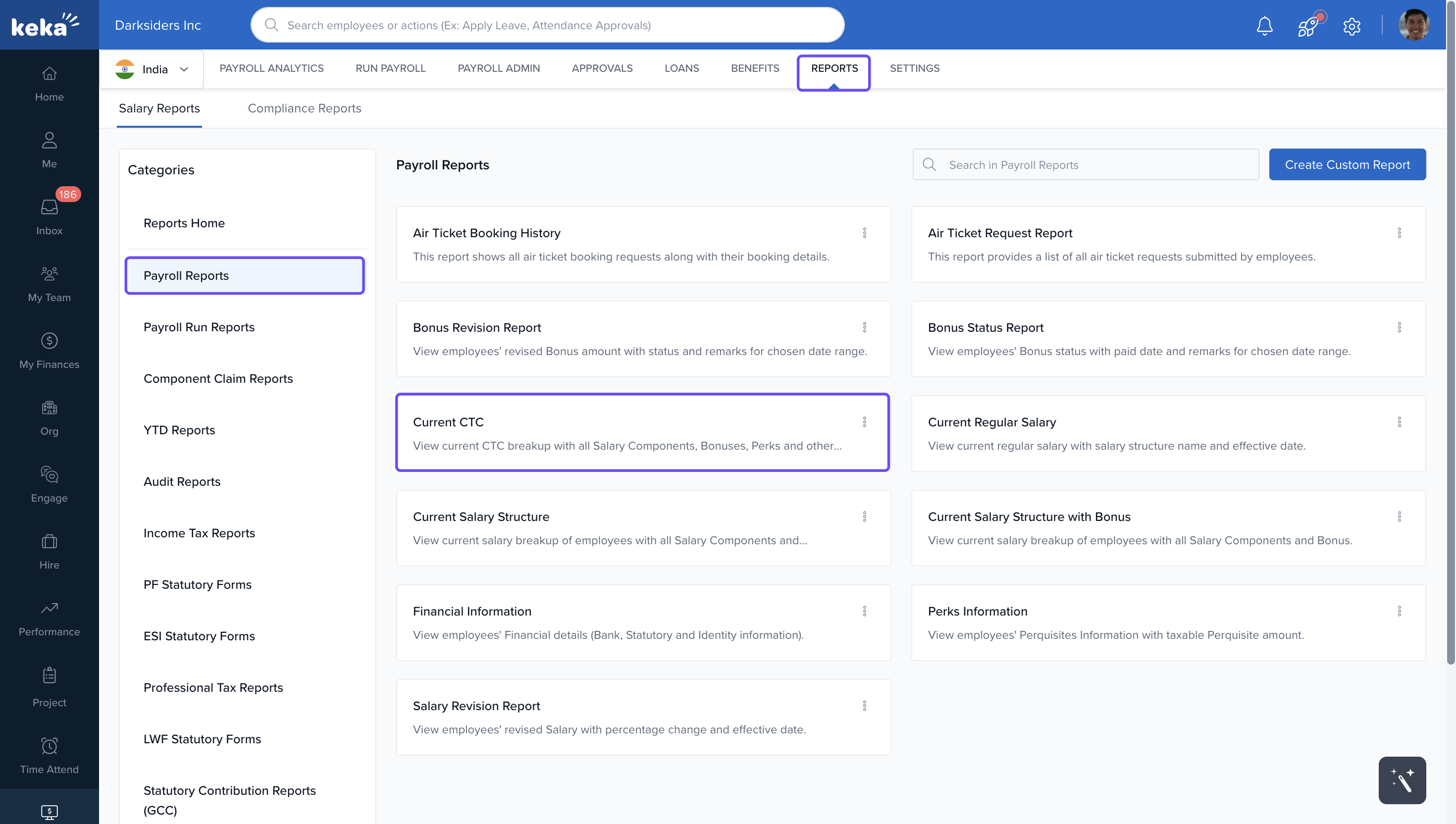 At times, HR or Admin teams may need to view the Annual CTC (Cost to Company) of all employees — for appraisals, budgeting, or financial planning. Instead of checking each employee’s profile manually, Keka lets you generate a Current CTC Report quickly for all employees across pay groups.