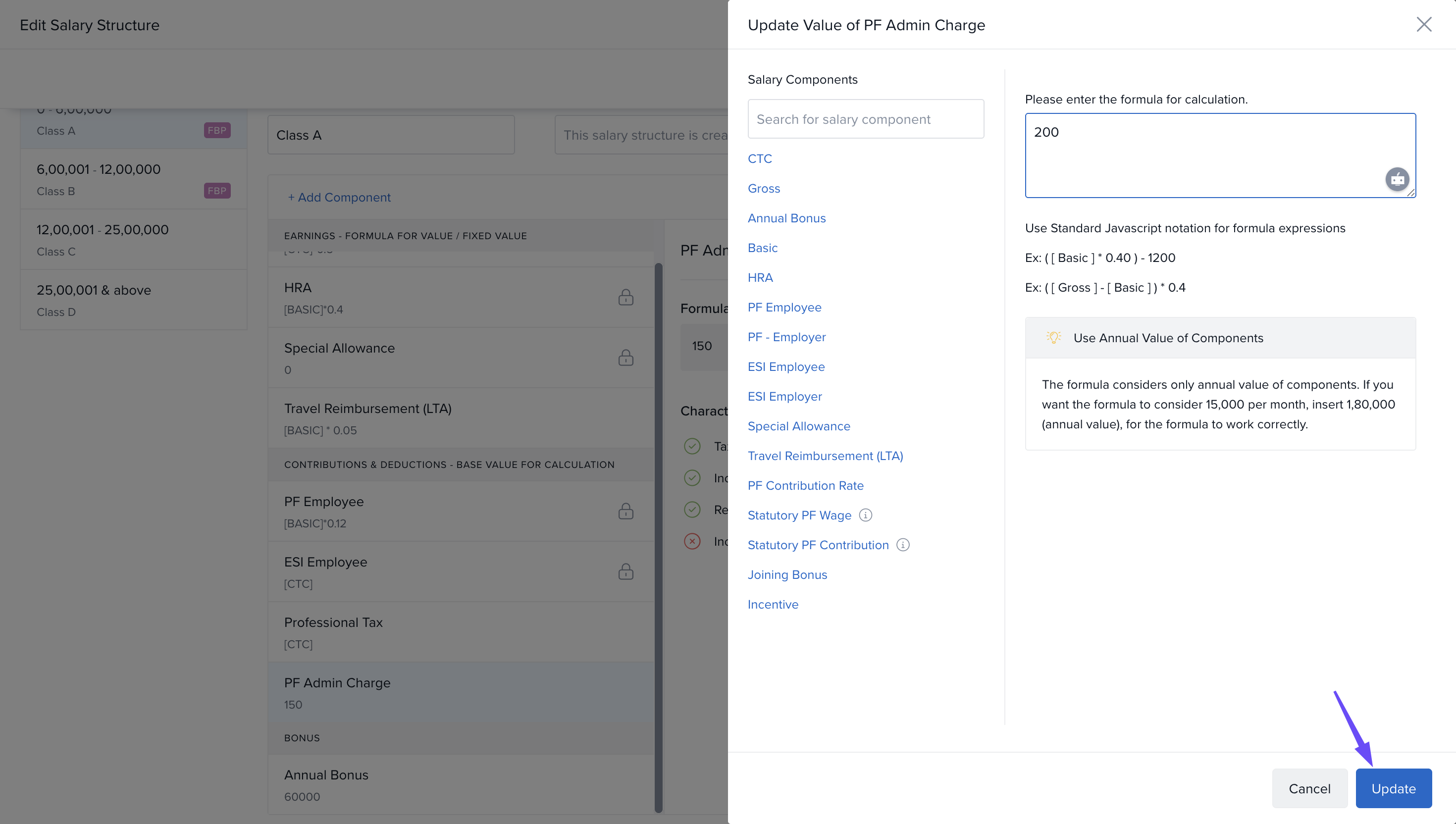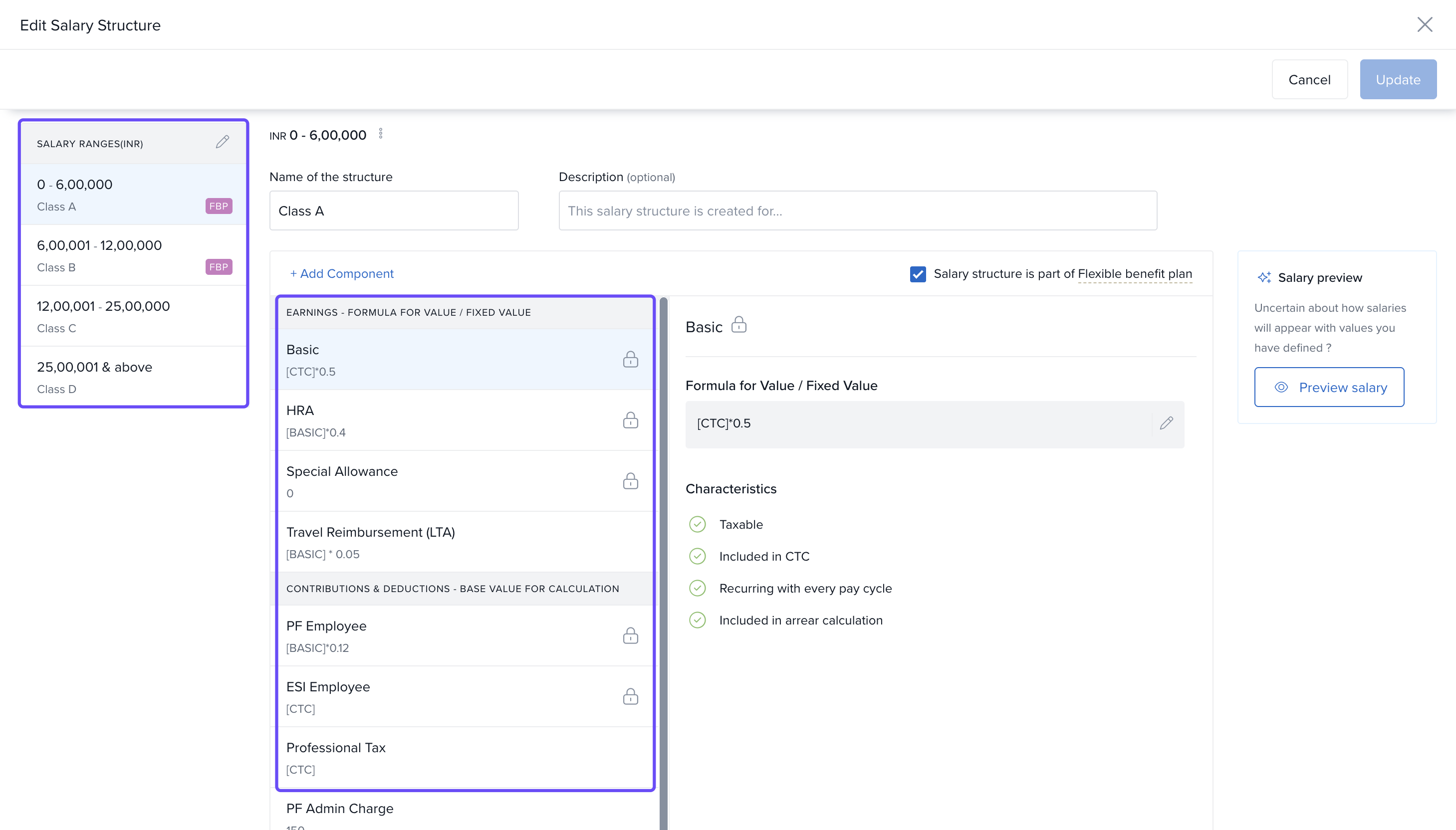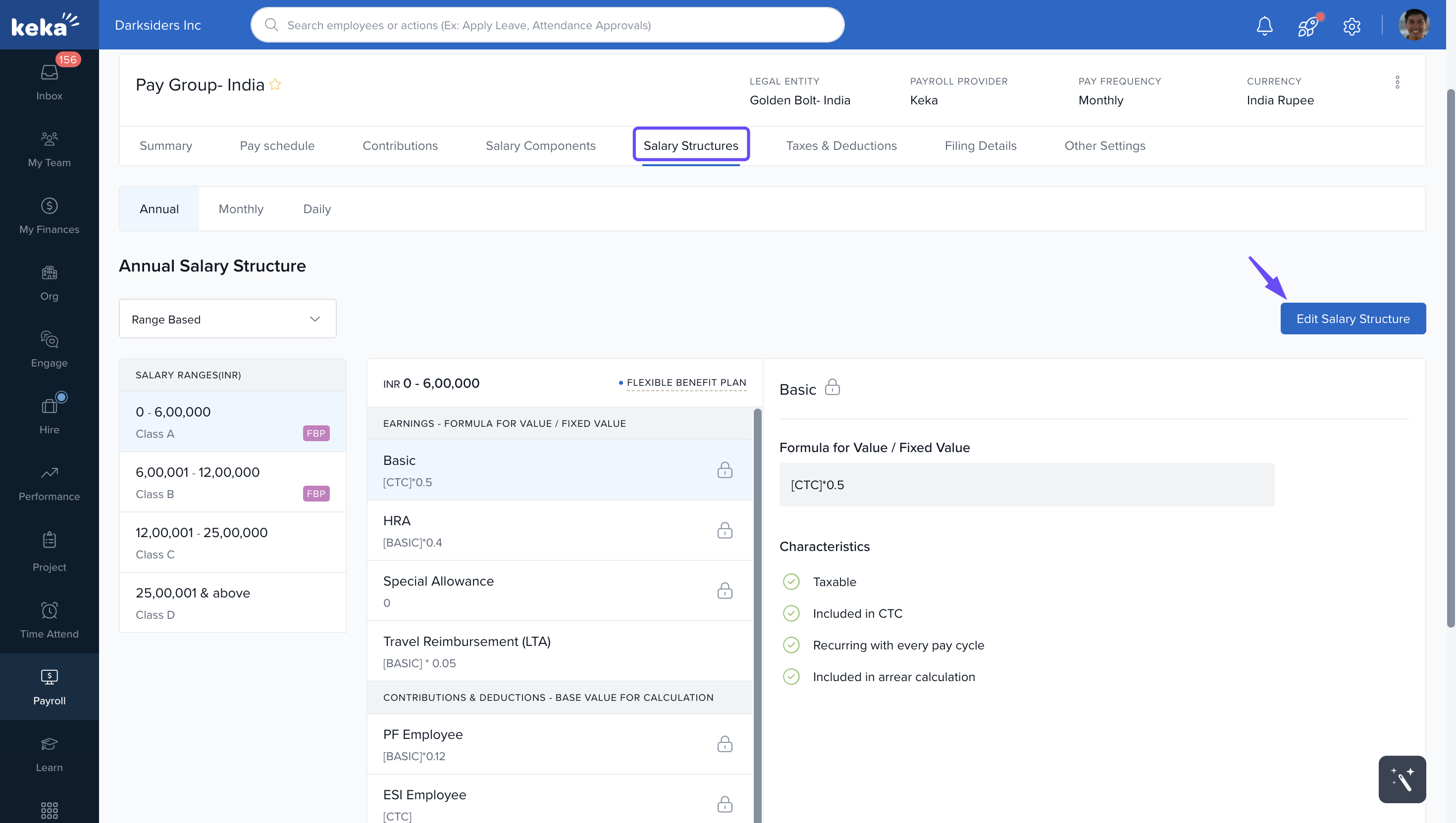 On Keka, you can easily modify your salary structure by adding or changing formulas for components. For example, you can add a new component as 10% of the employee’s Basic Pay using formulas.