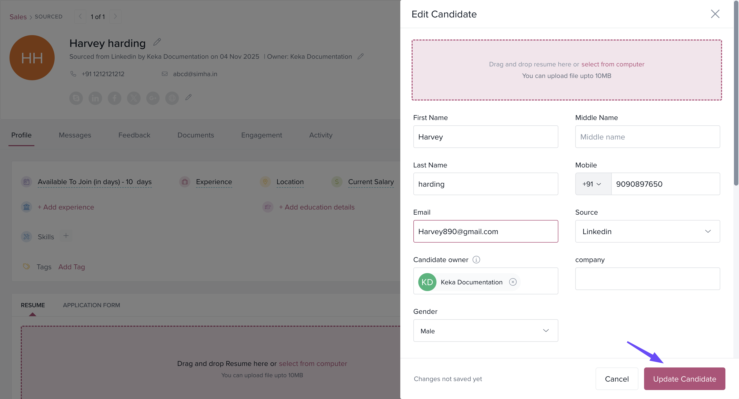 After making the necessary changes, click Update Candidate to save the changes.