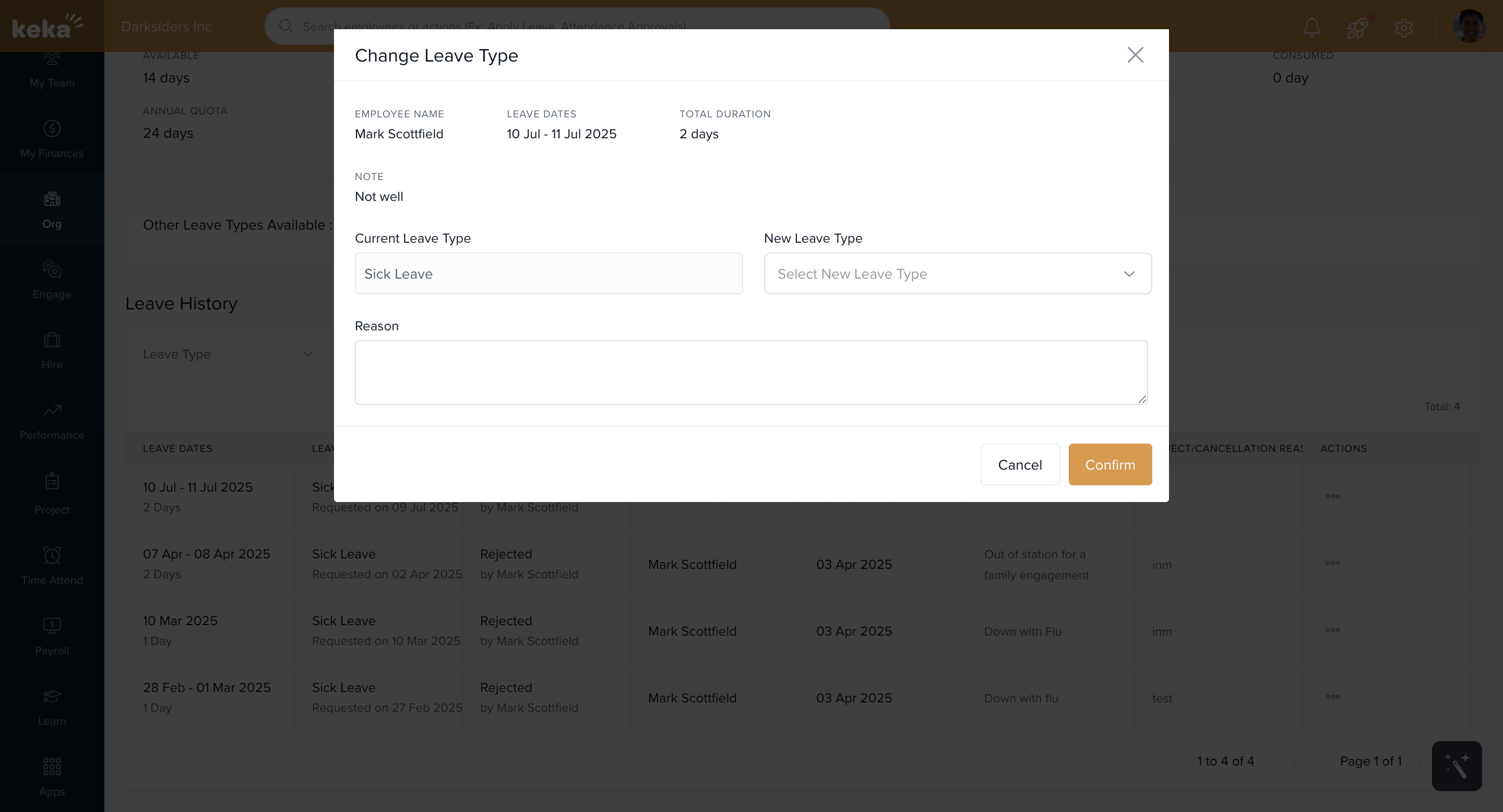 In the window that appears, select the new leave type from the drop-down menu, provide the reason, and confirm.
