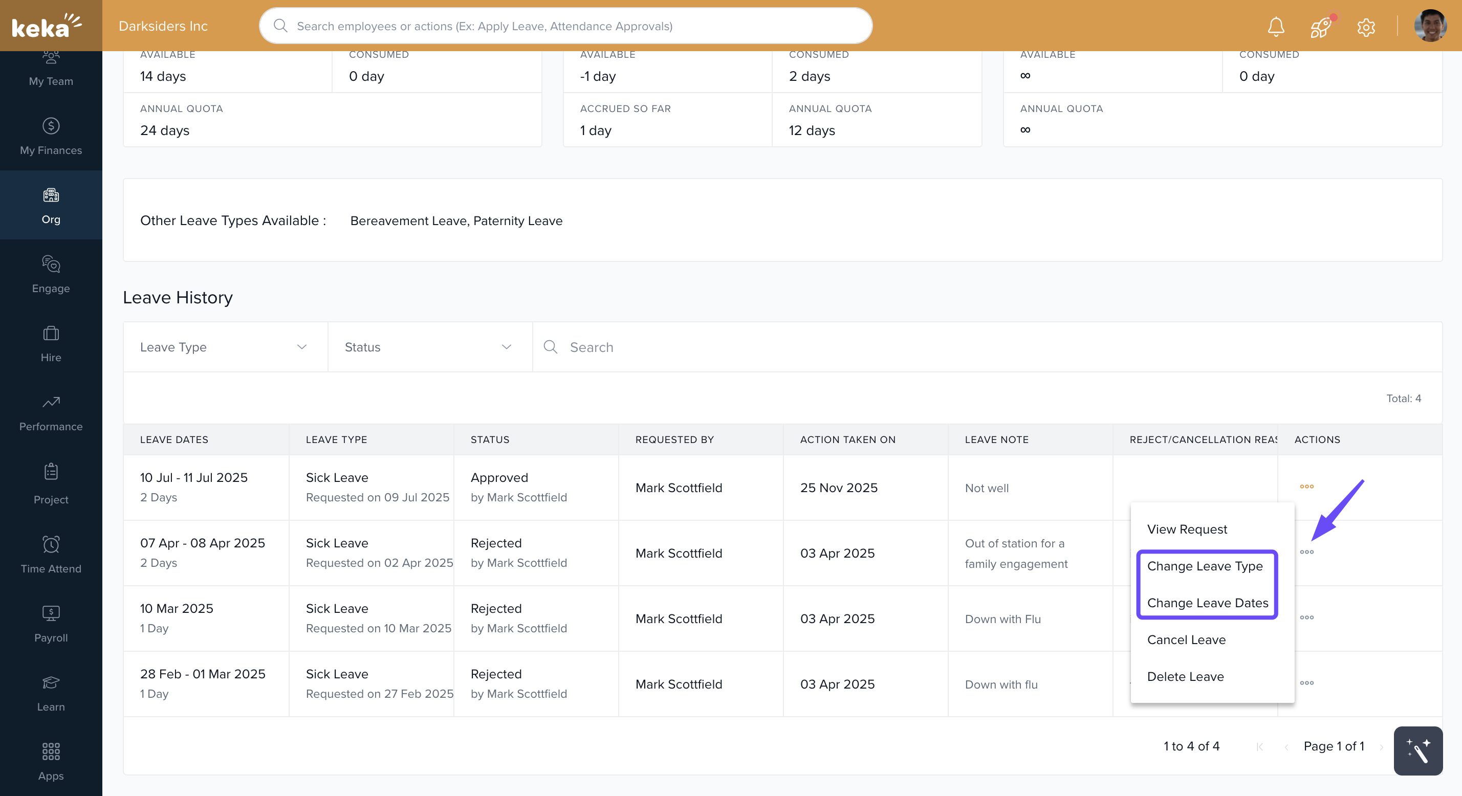 In any organization, managing employee leave is crucial to ensure smooth operations. Employees are typically provided with various types of leave such as Earned/Privileged leave, Sick/Casual leave, etc. These leave types can differ in terms of eligibility, encashment, and carry-forward options. There may also be situations where an employee wishes to change the type of leave they've applied for, or adjust the dates of approved leave. This guide outlines the process for managers, HR, or admins to make such changes in the employee’s leave records.