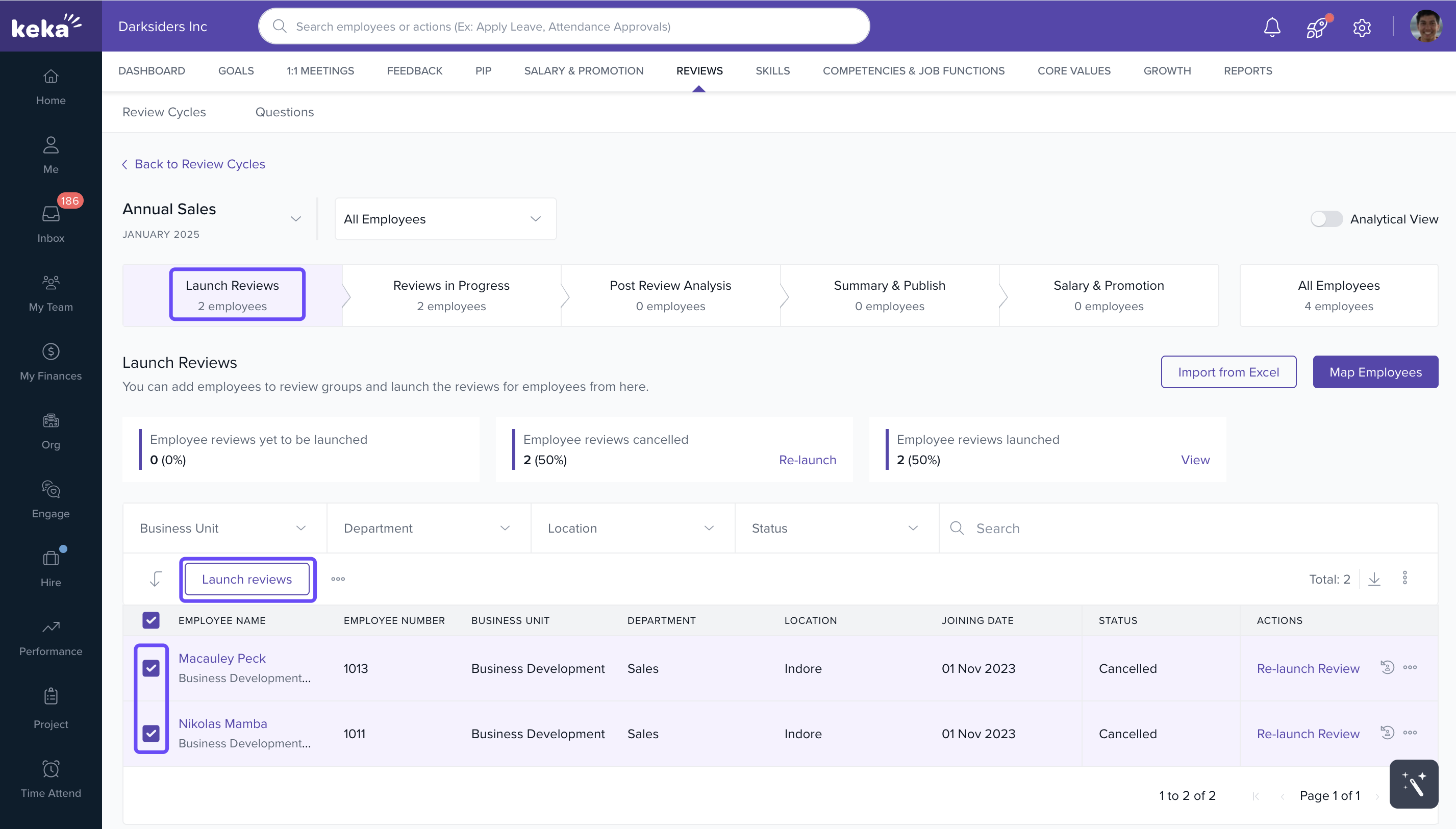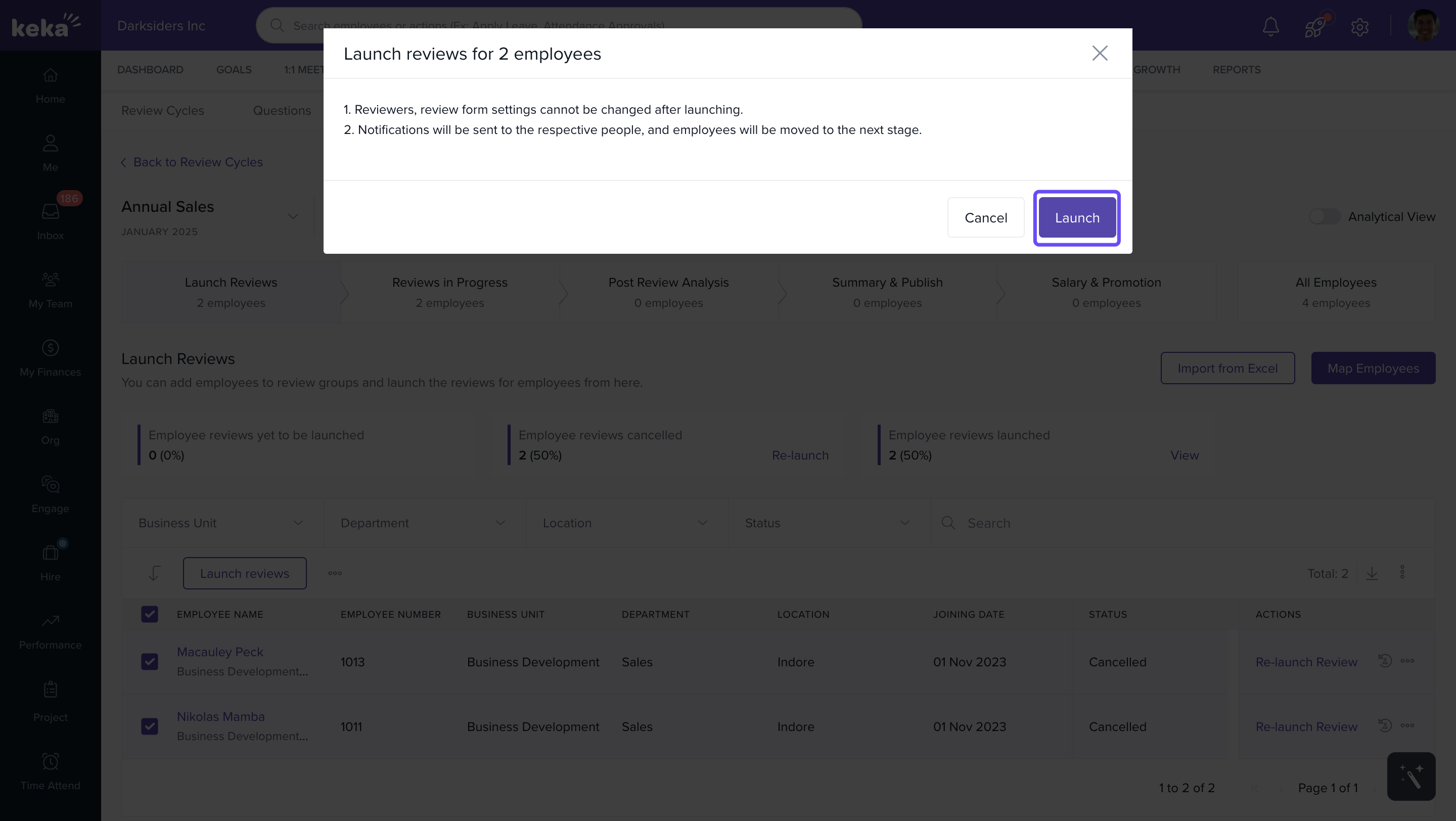 In the Launch Reviews step, you’ll see a list of employees.