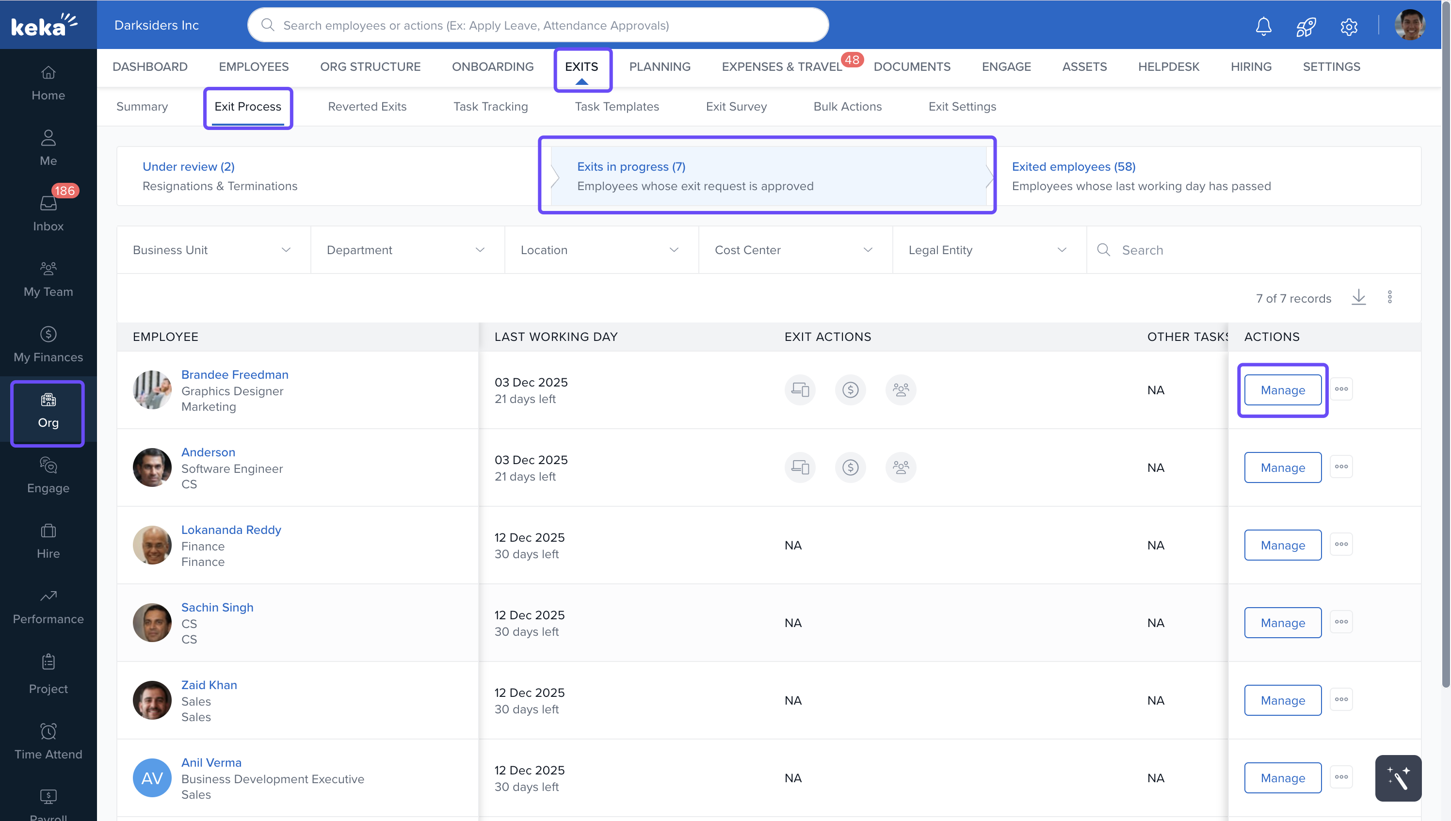 Under the Exit Process, select the employee for whom you want to process the Full & Final settlement.