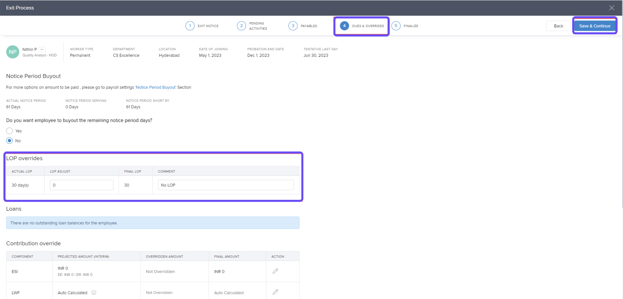 The Full & Final settlement is processed separately from the regular payroll and is where all final adjustments, like ad-hoc payments, deductions, leave encashment, and LOP (Loss of Pay), are made.