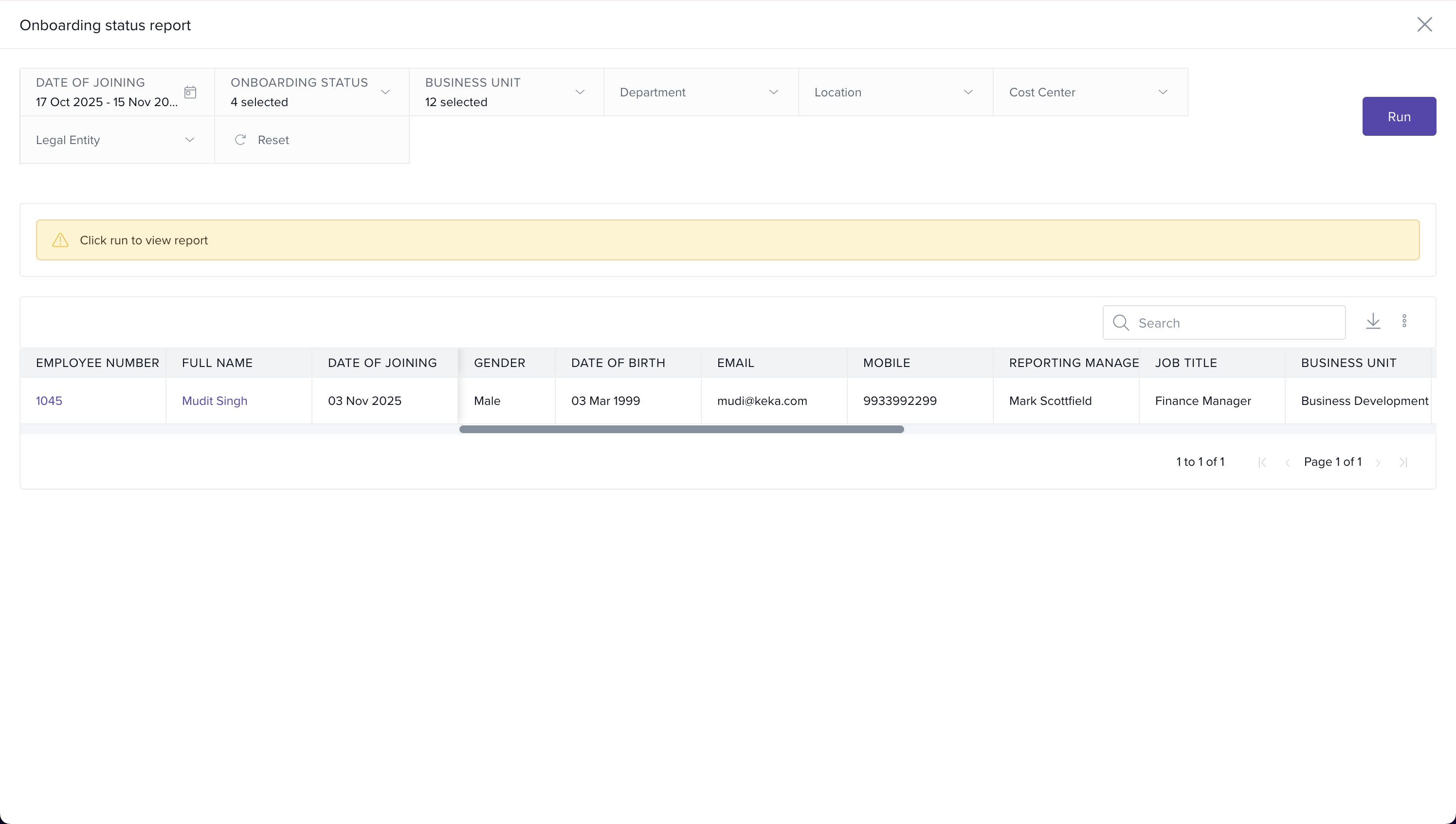 Use filters like Joining Date, Business Unit, Department, Location, and Onboarding Status, then click Run.