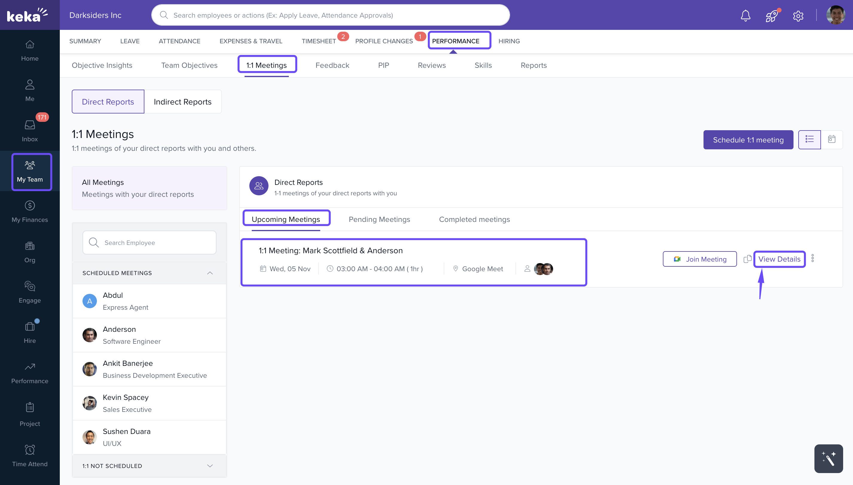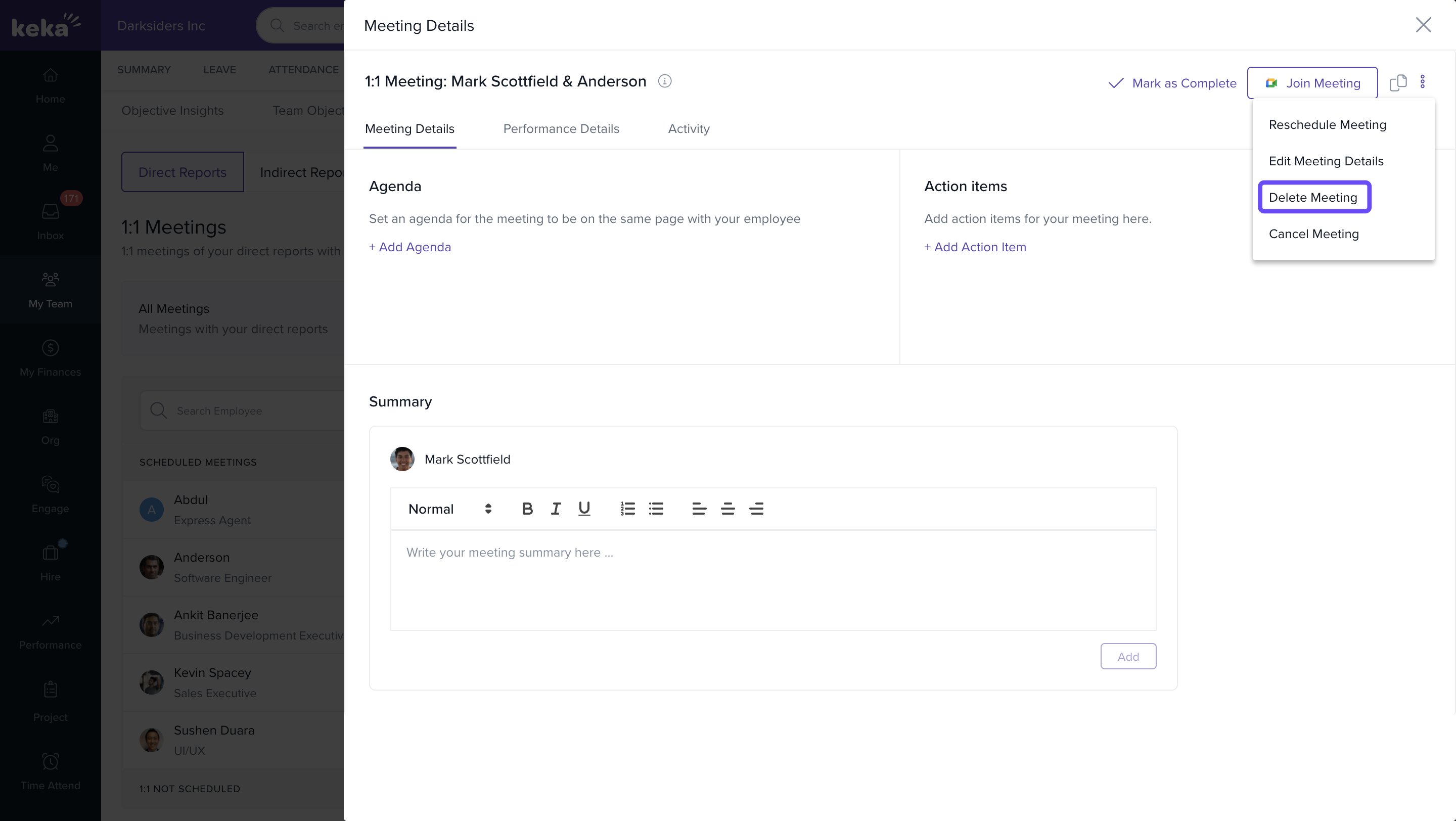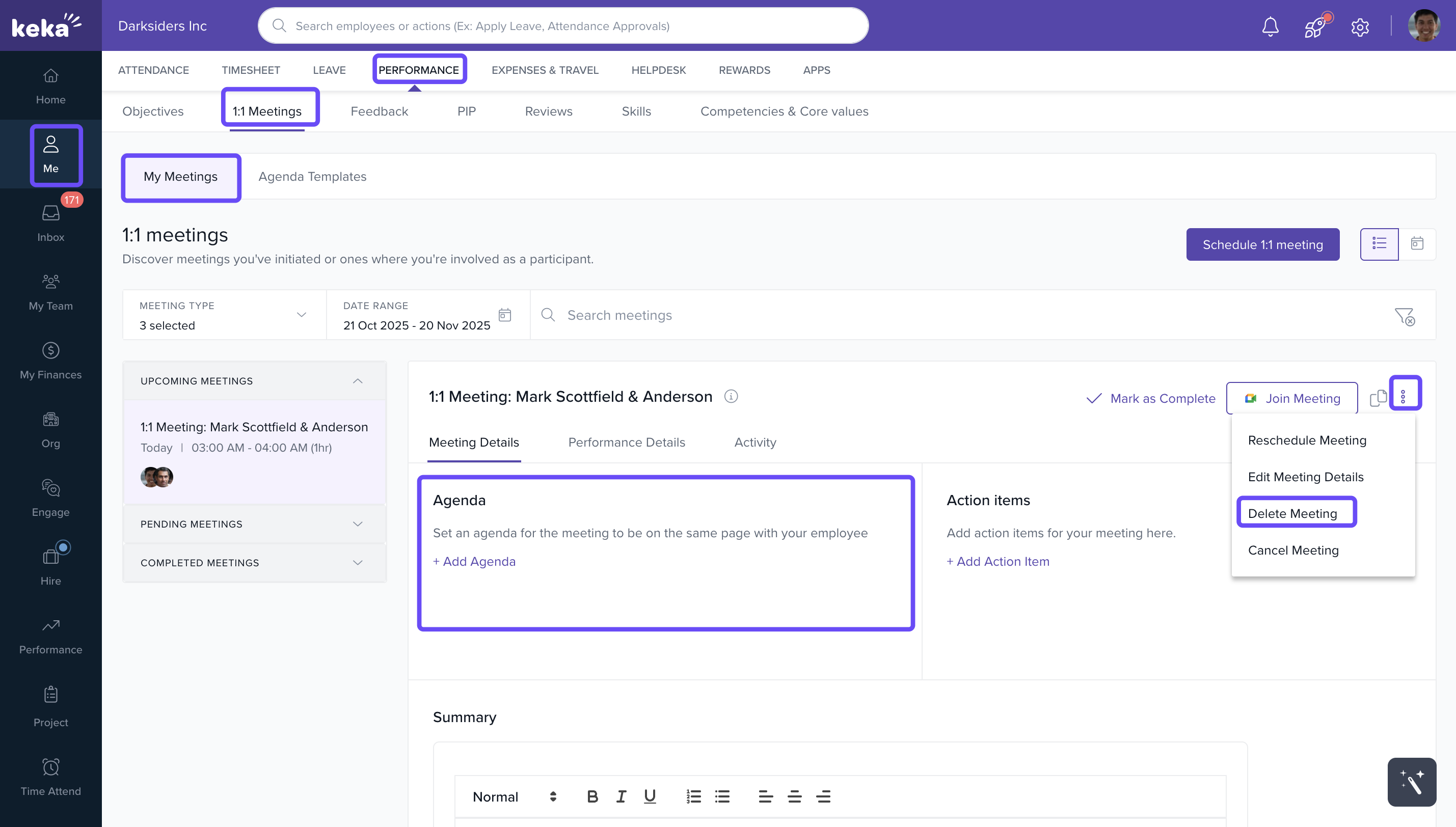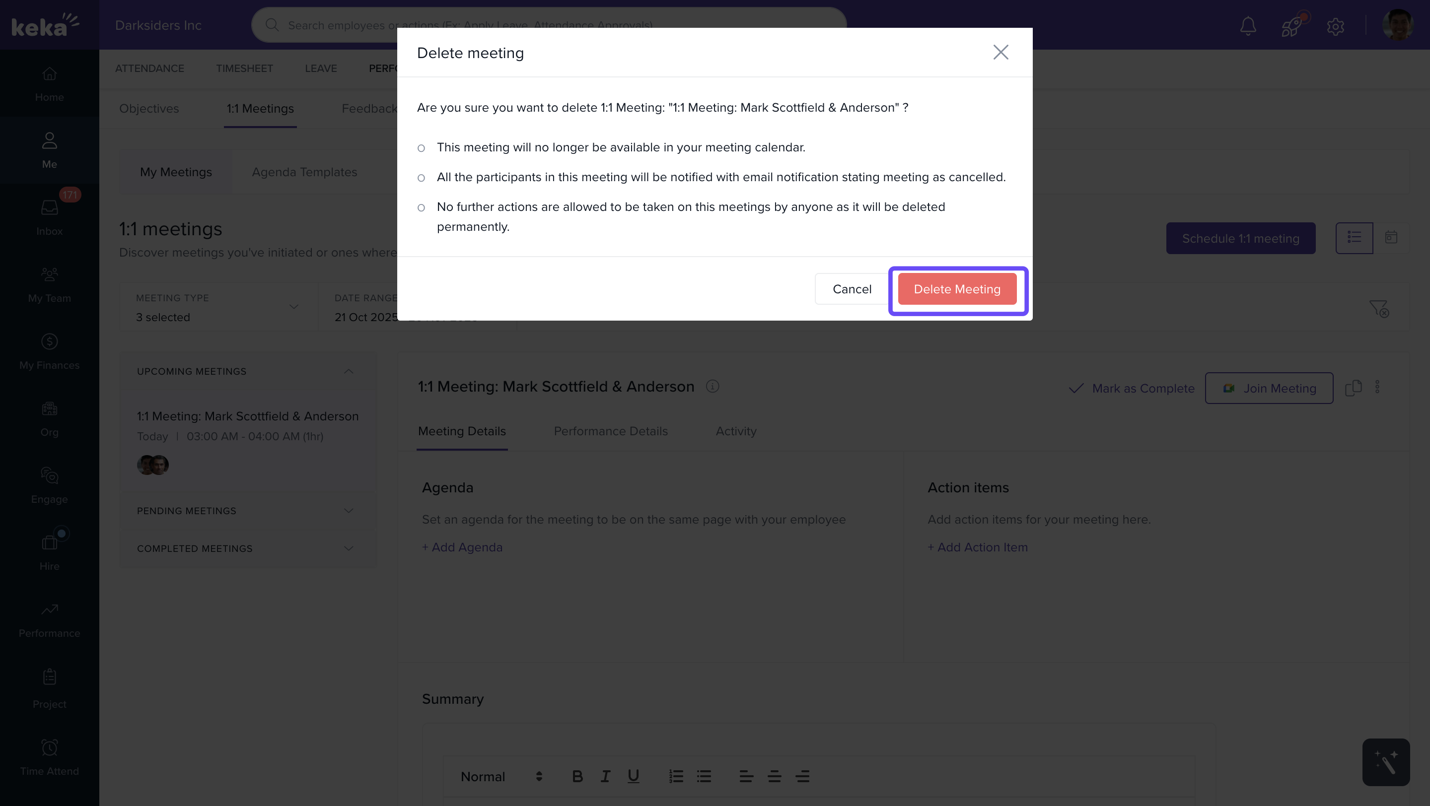 1:1 meetings are discussions between employees and their managers, focusing on performance feedback. These meetings can be easily scheduled and tracked through Keka. If the meeting is no longer relevant, it can be deleted. Here’s how: