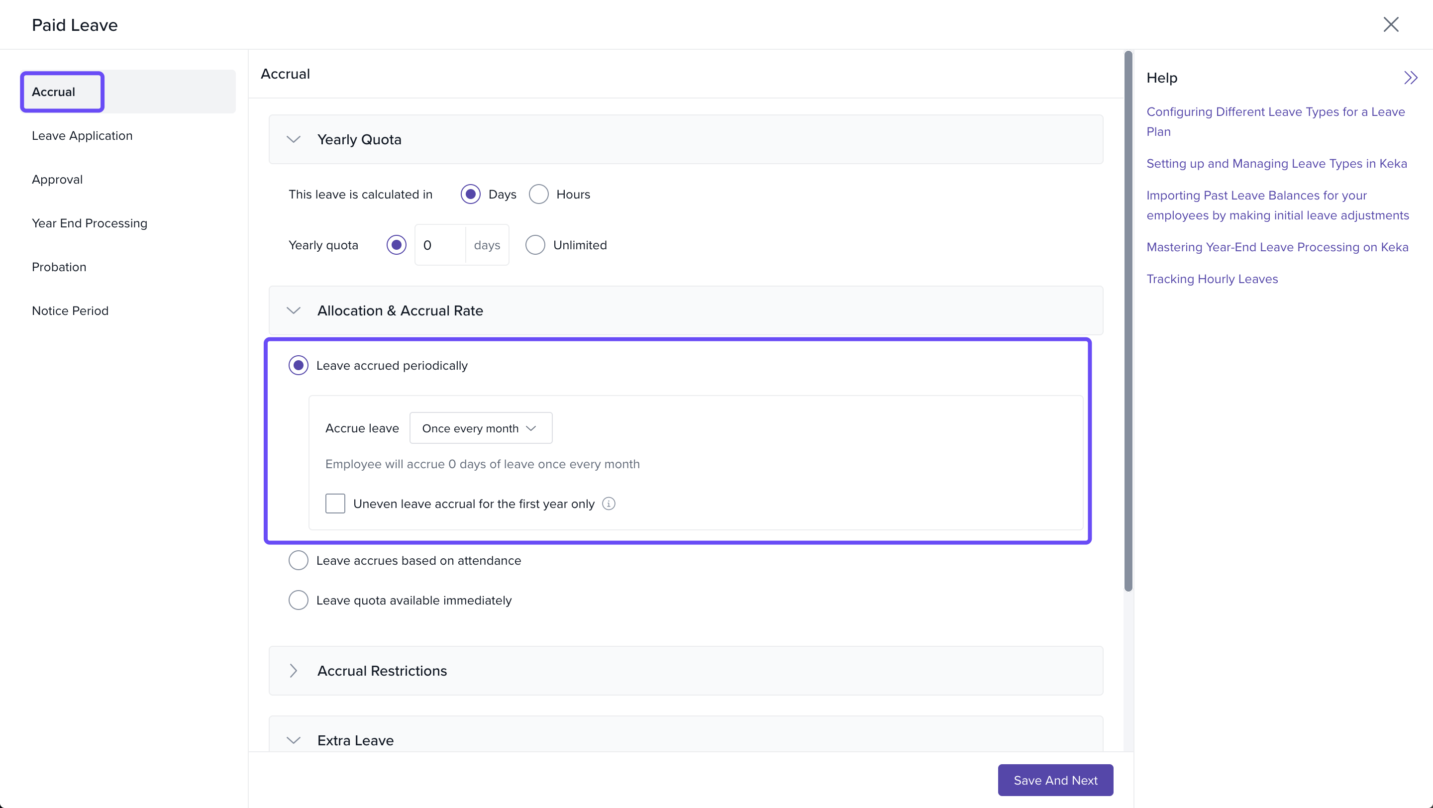 - Select Allocation & Accrual Rate from the dropdown and choose Leave accrued periodically.