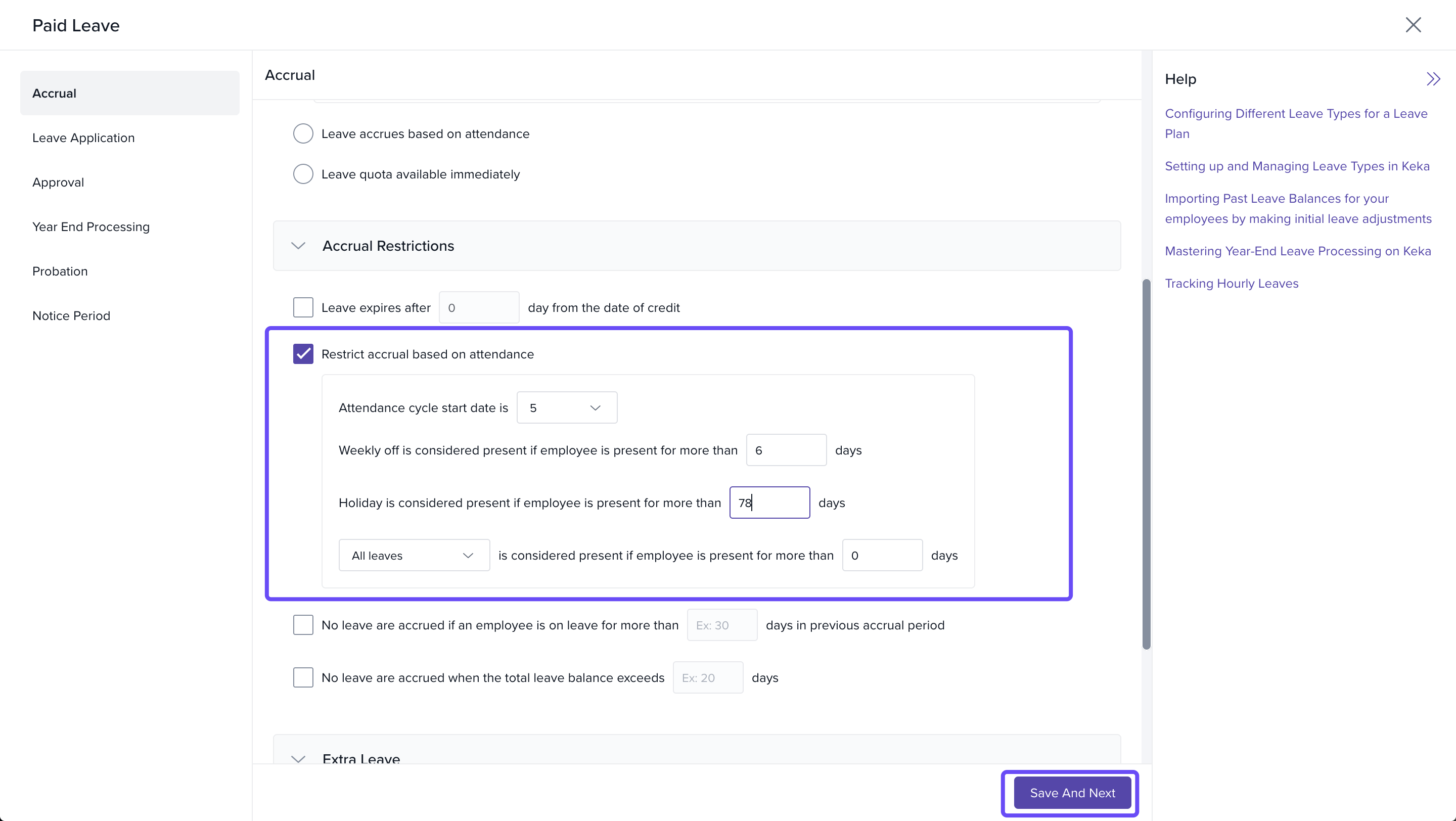 - Under Accrual Restrictions, tick the checkbox for Restrict accrual based on attendance.