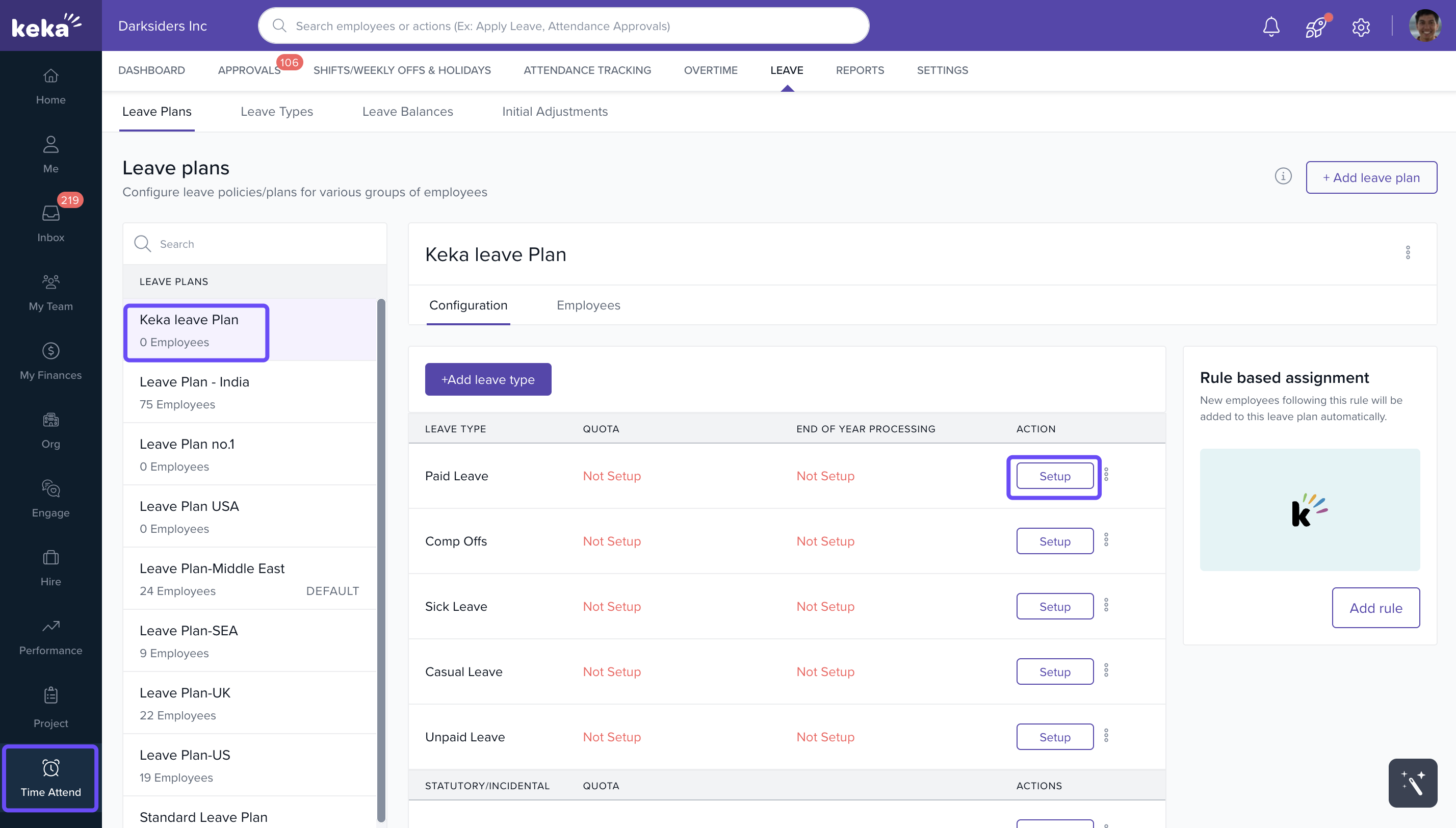 - In the Configuration tab, click on Setup for the specific leave (e.g., Paid Leave) under which accrual needs to be enabled.