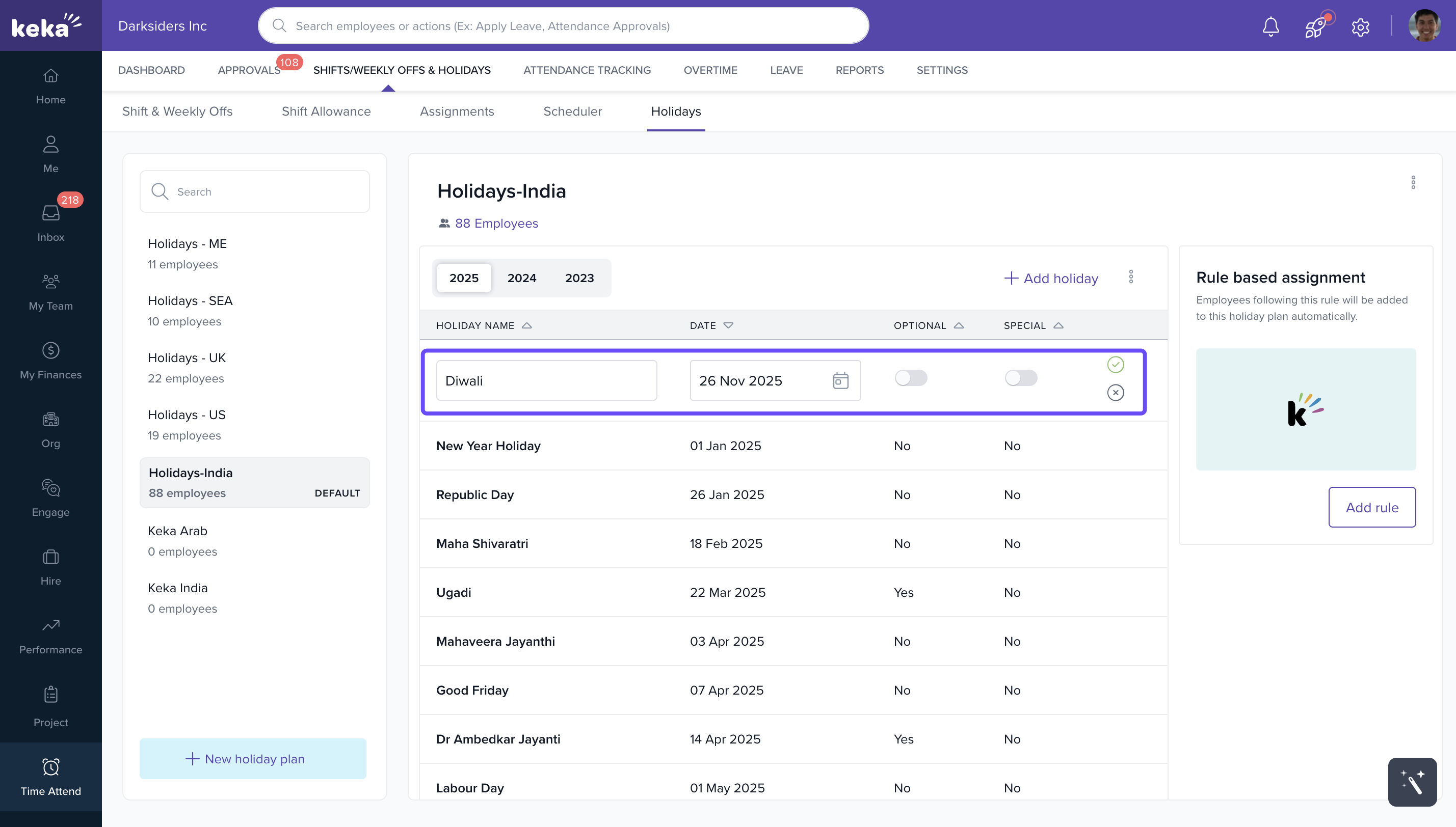 - Go to Time Attend > Shifts/Weekly Offs & Holidays.