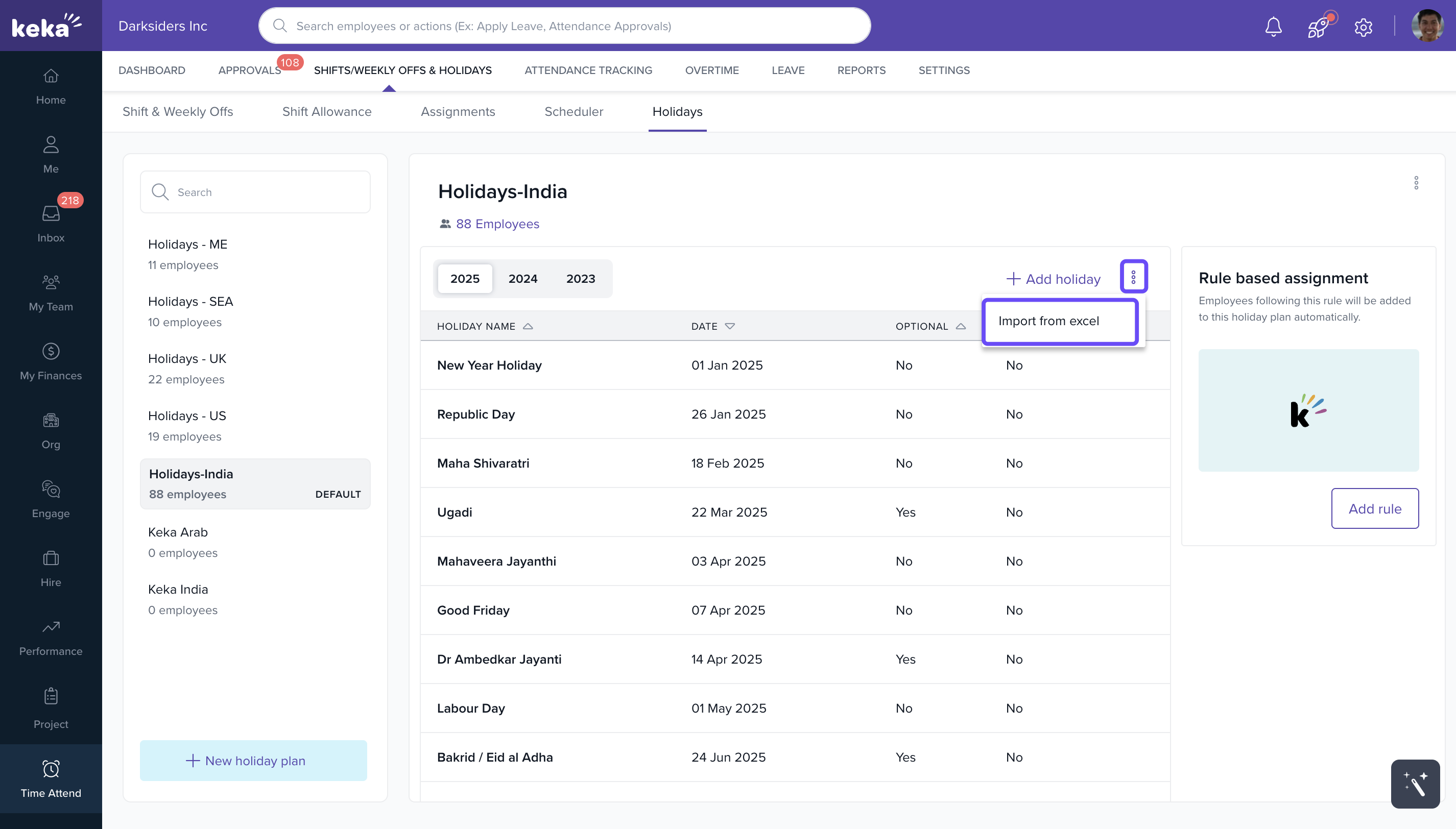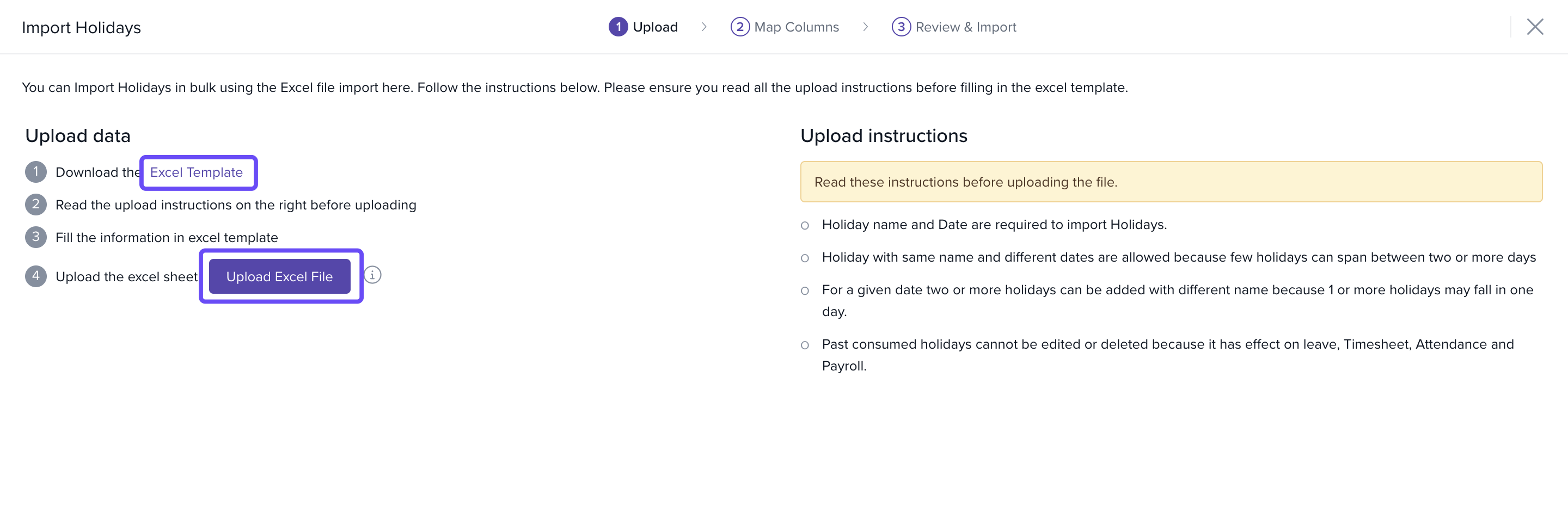 - Click the 3-dot menu next to +Add Holiday and select Import from Excel.
