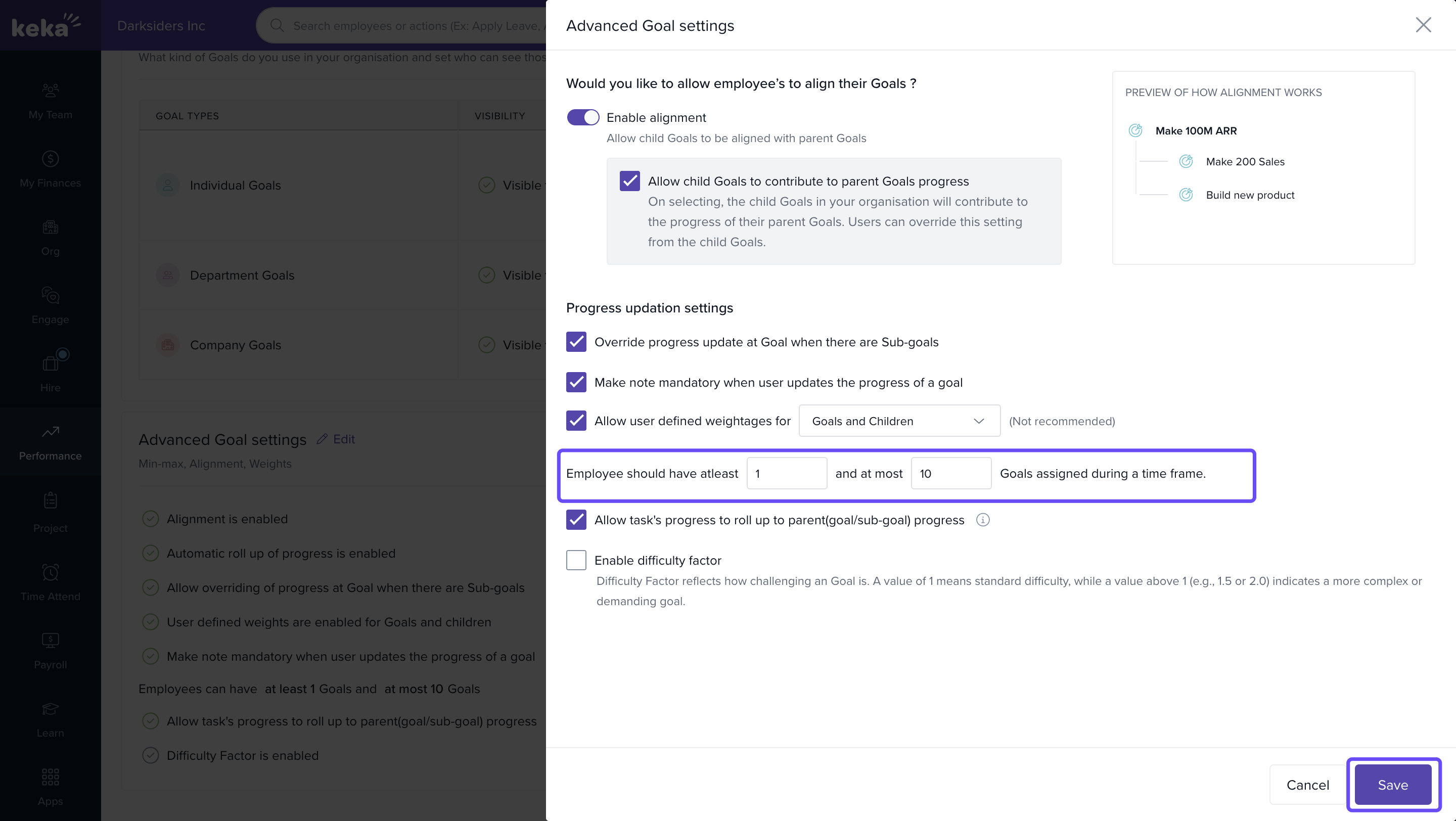 To maintain consistency and ensure goal alignment across teams, Keka allows you to define minimum and maximum limits for the number of objectives (or goals) that can be assigned to employees.
