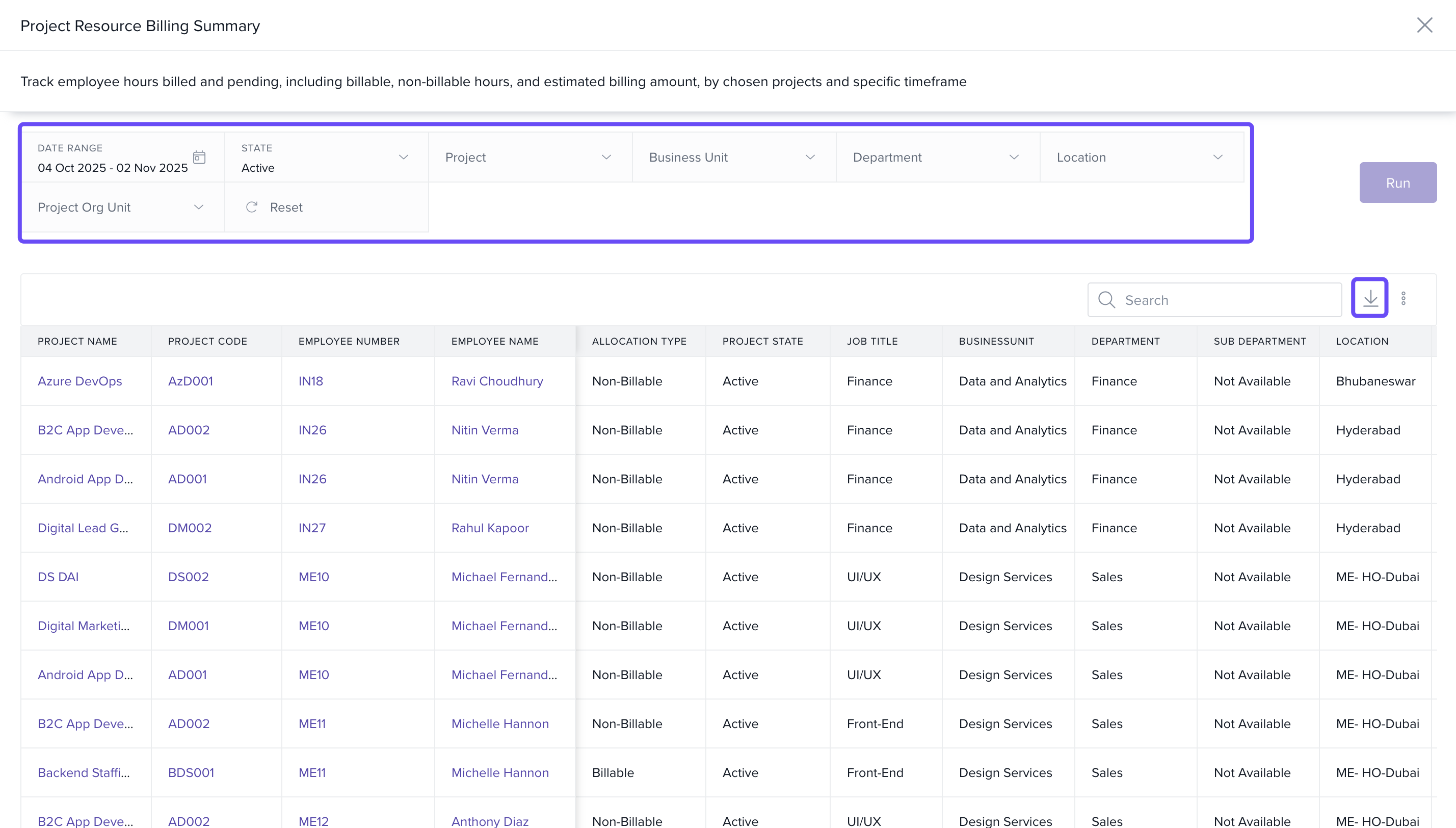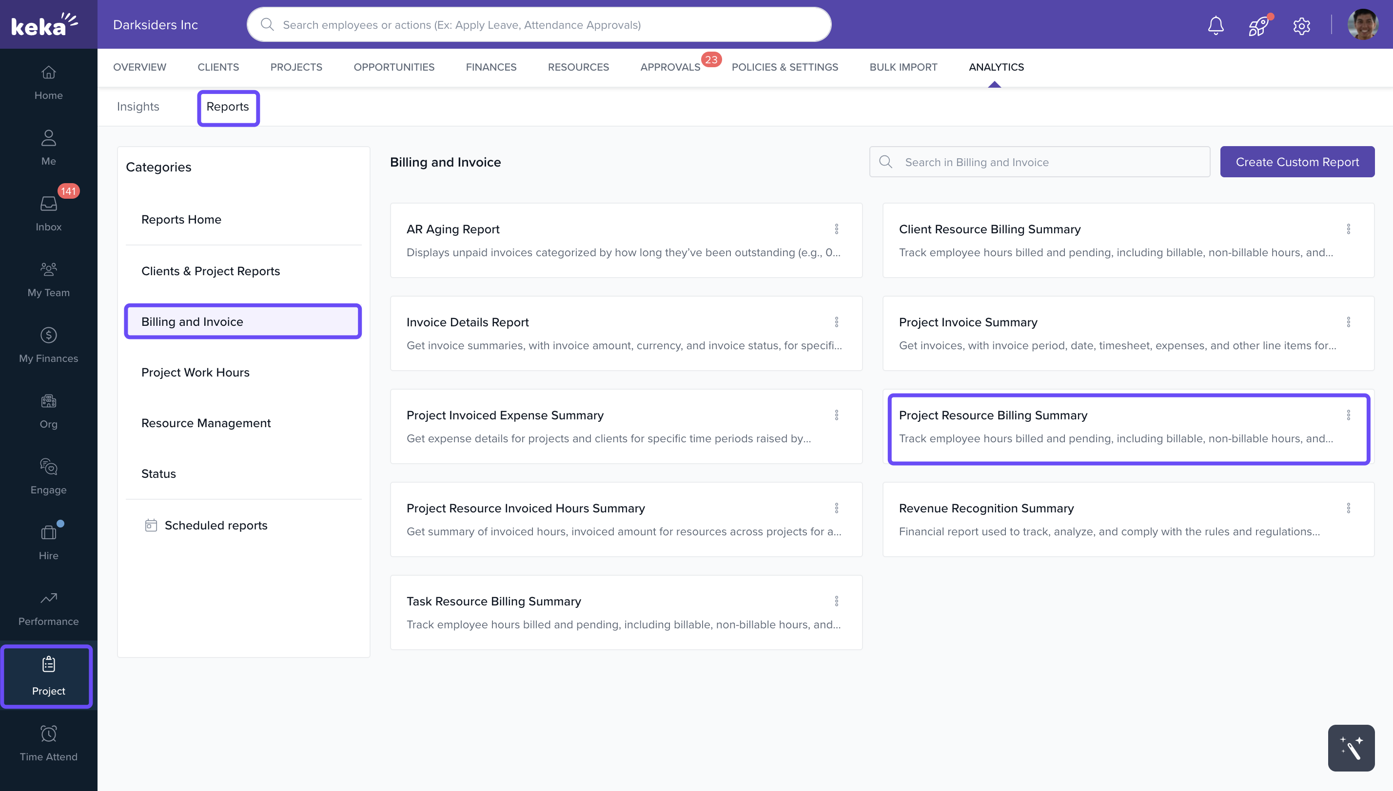 - Scroll down to the Billing and Invoice section and click on Project Resource Billing Report.