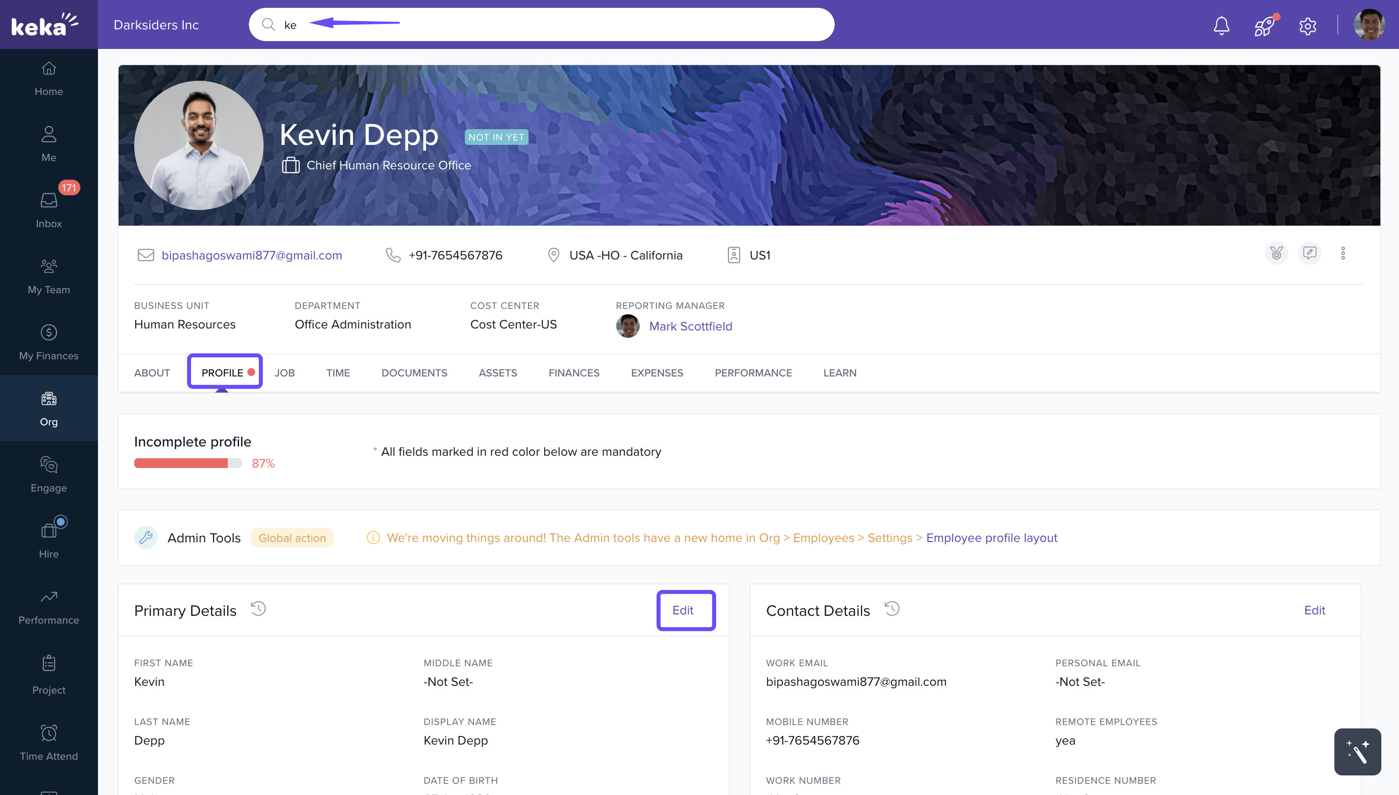 - Go to the Global Search Bar in the Keka Portal and search for the employee. Open their Profile.