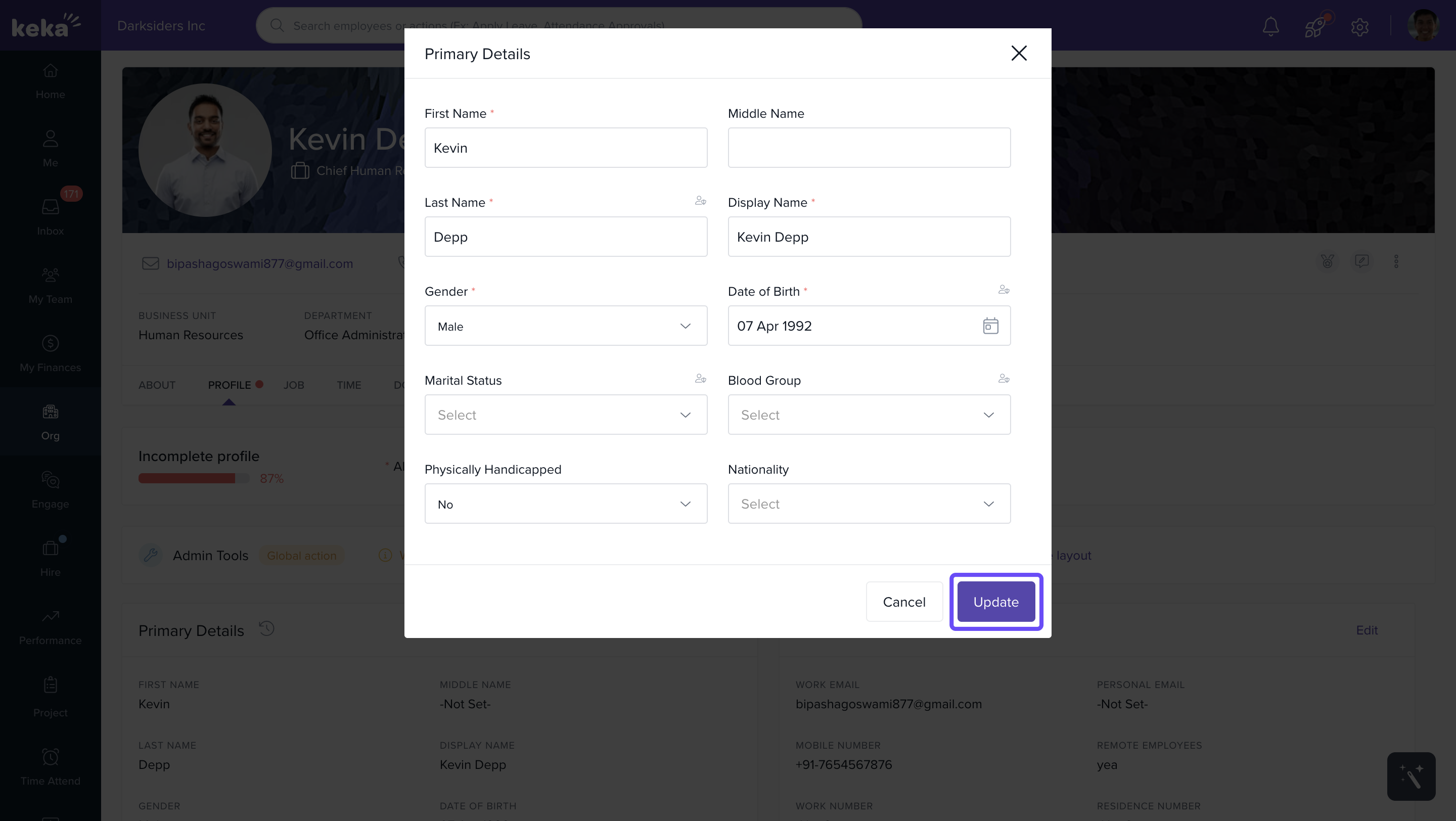 - Update the necessary information such as Name, Gender, Date of Birth, Marital Status, Blood Group, or Physical Handicap status.