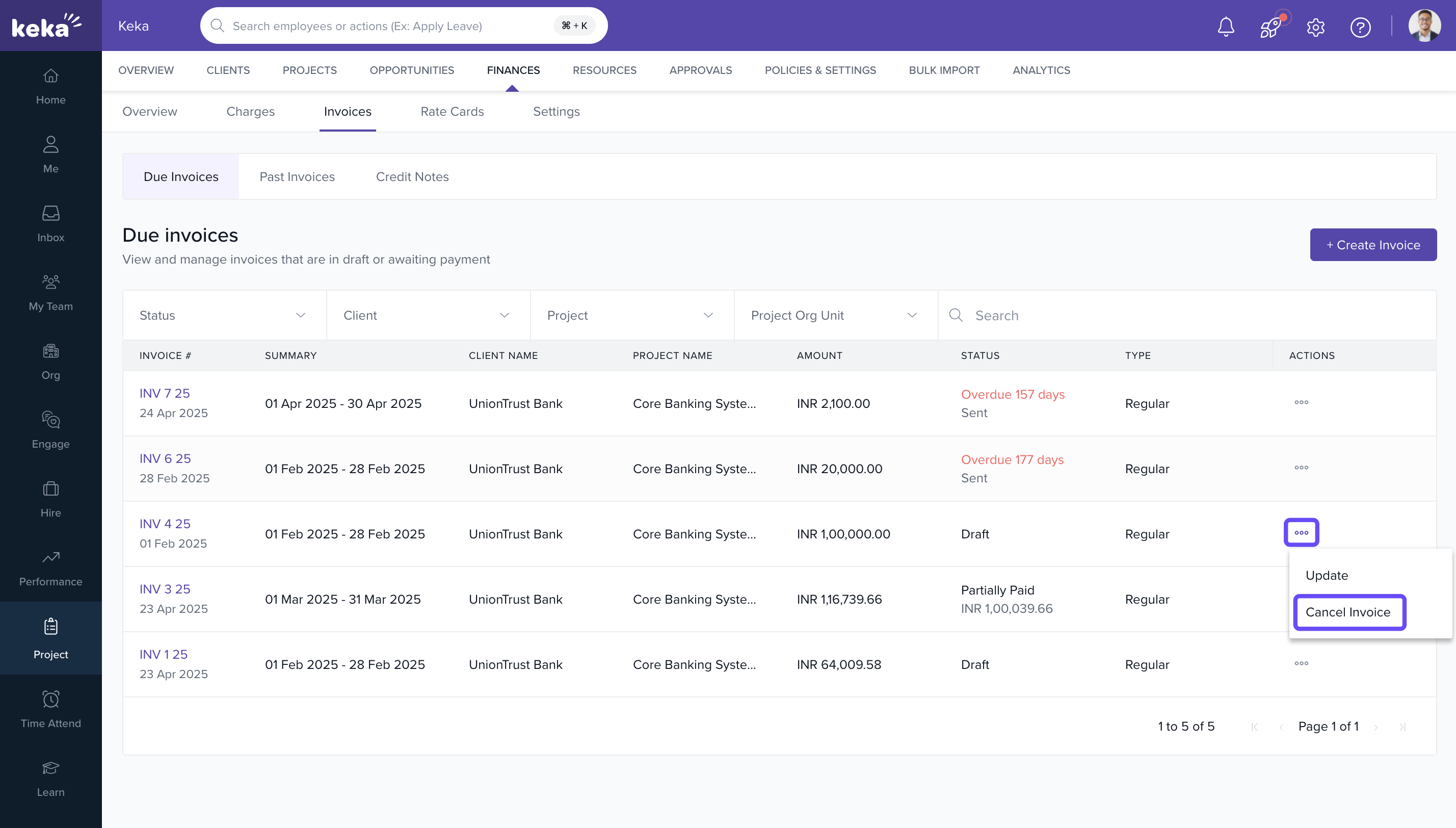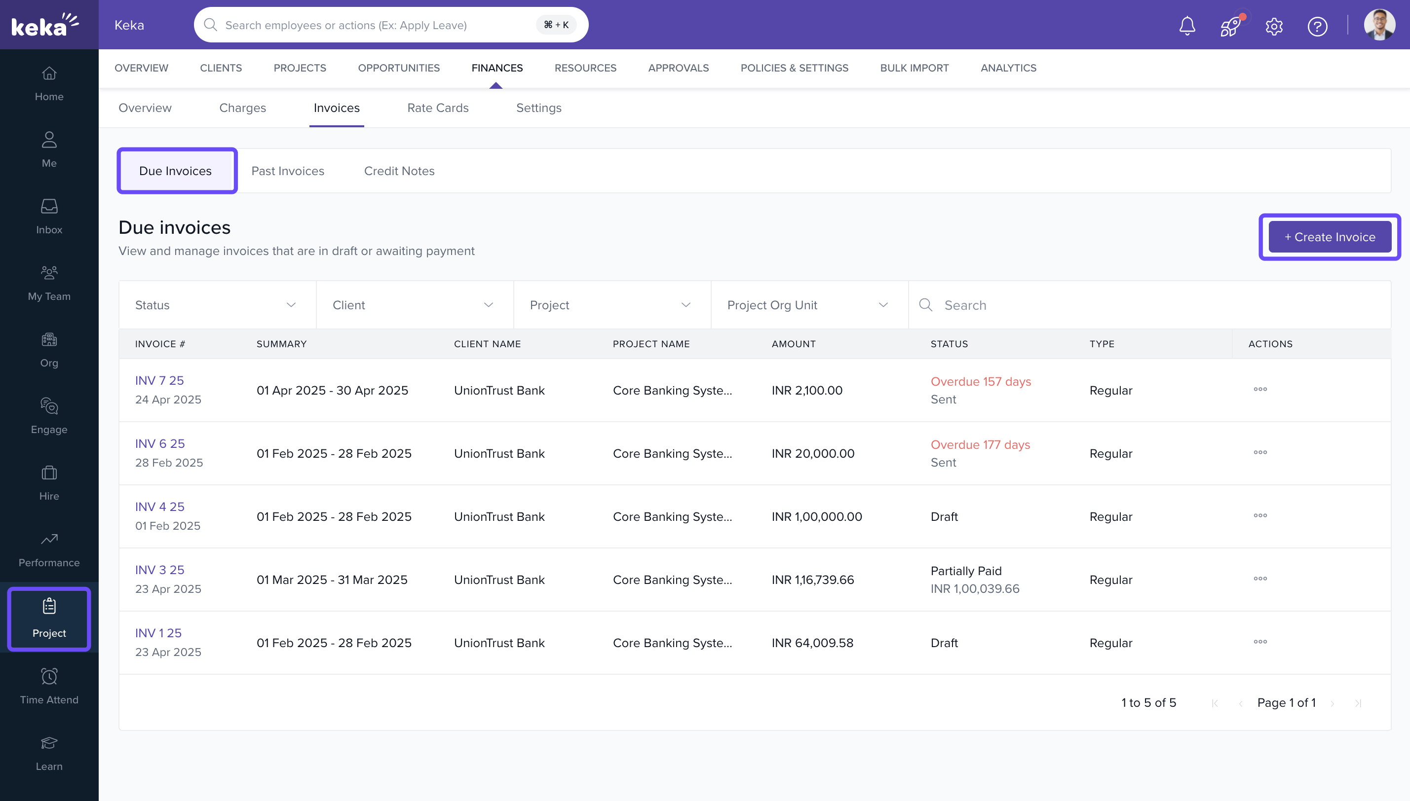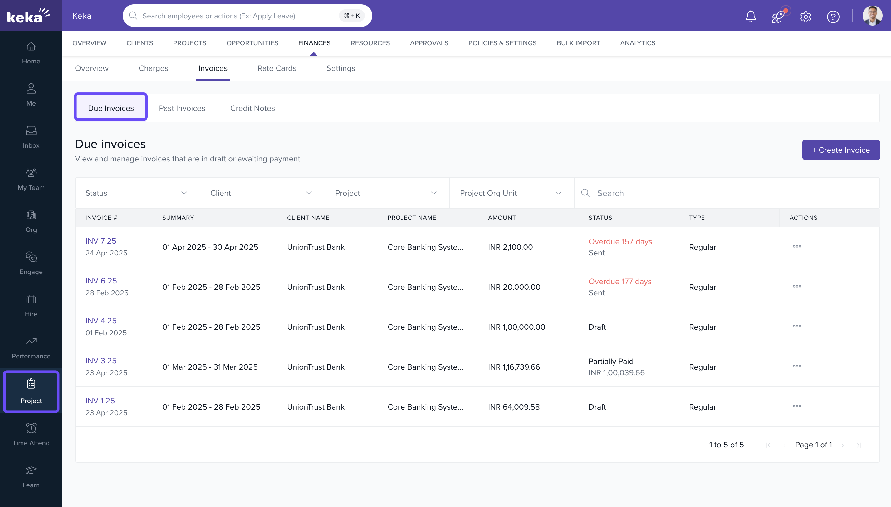 This article explains how to create and manage invoices in Keka PSA. You’ll learn how to generate new invoices, customize line items, apply taxes and discounts, edit draft invoices, and finalize billing for clients and projects. Proper invoice management ensures accurate revenue tracking, simplifies financial operations, and maintains compliance with client agreements.