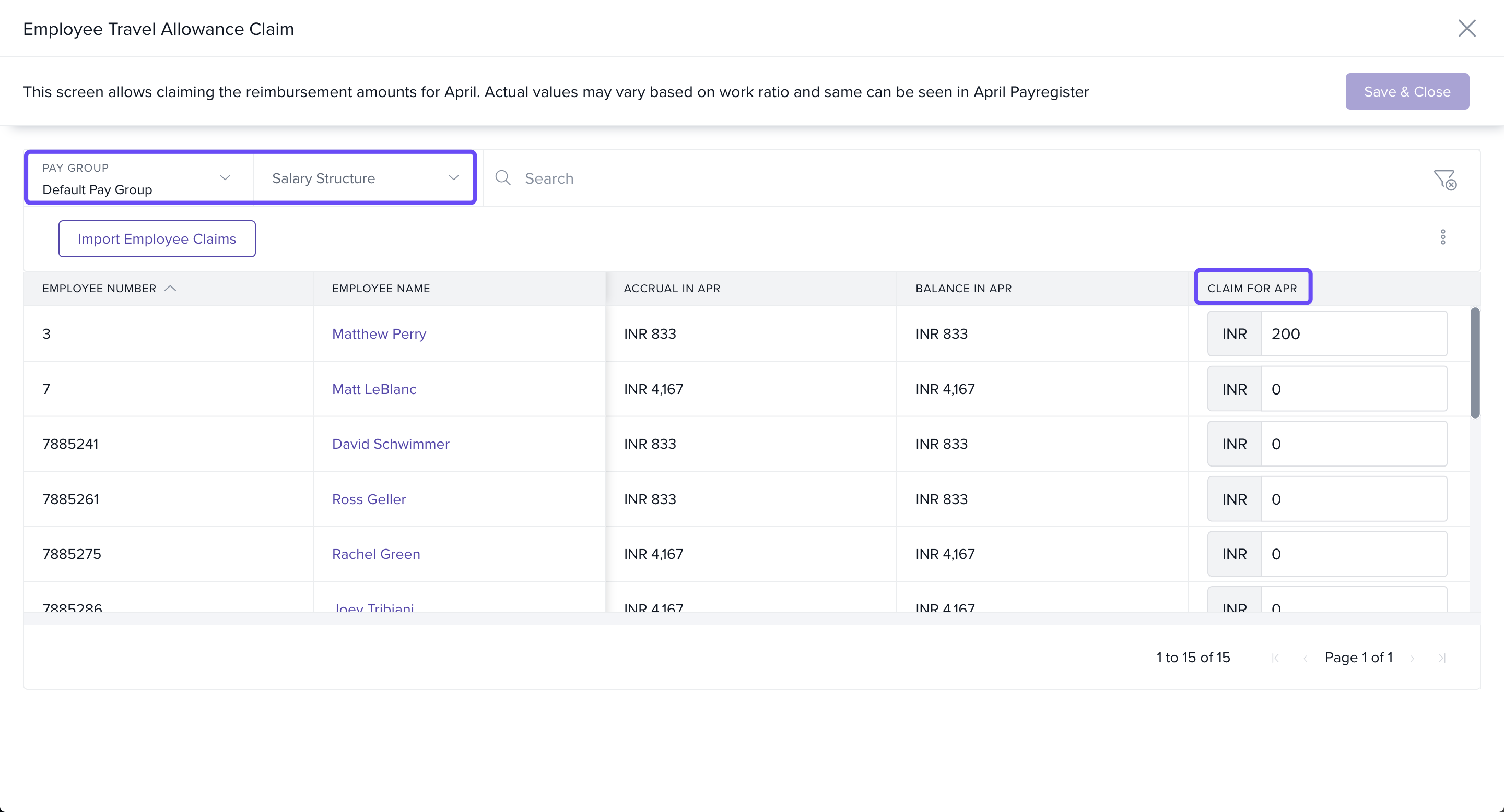 - On the Reimbursement Claim screen, select a Pay Group and Salary Structure to filter the employee list.