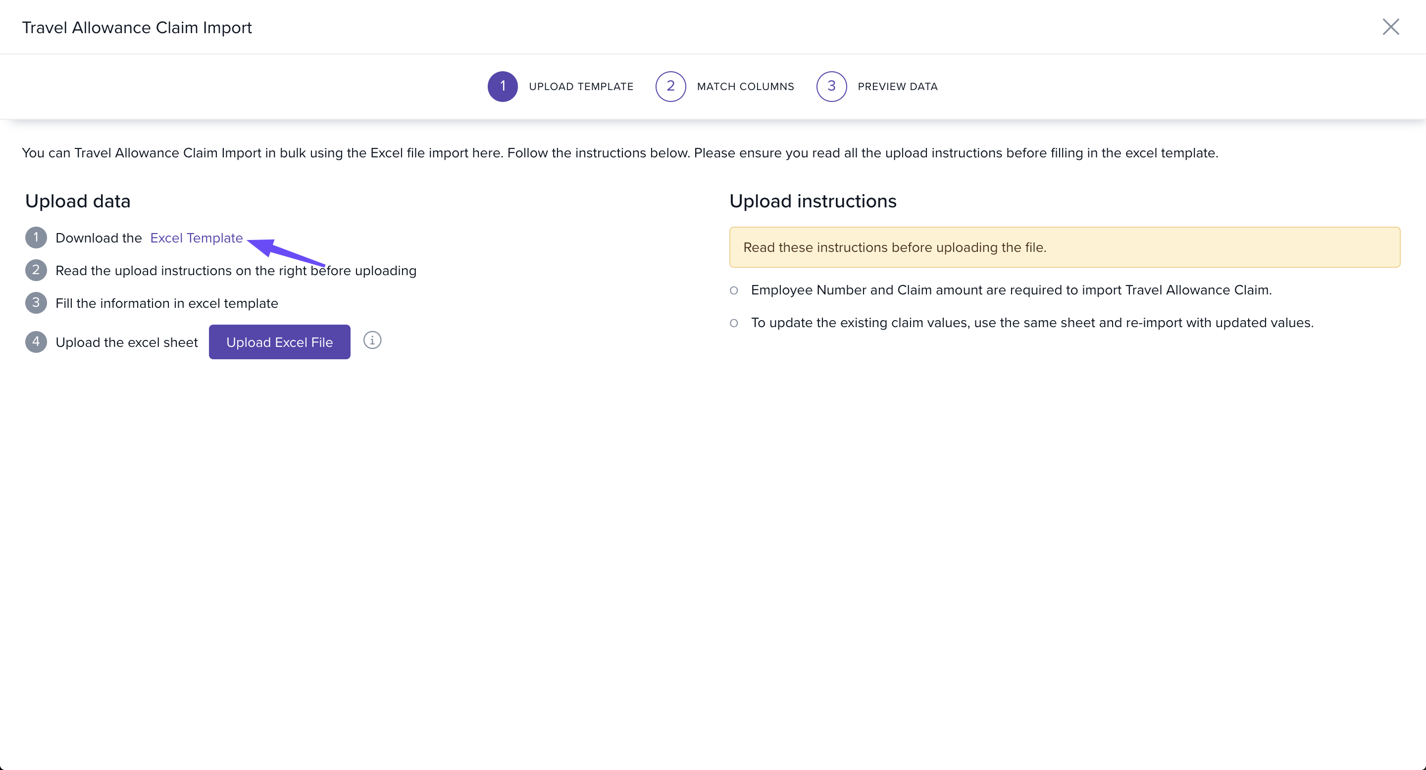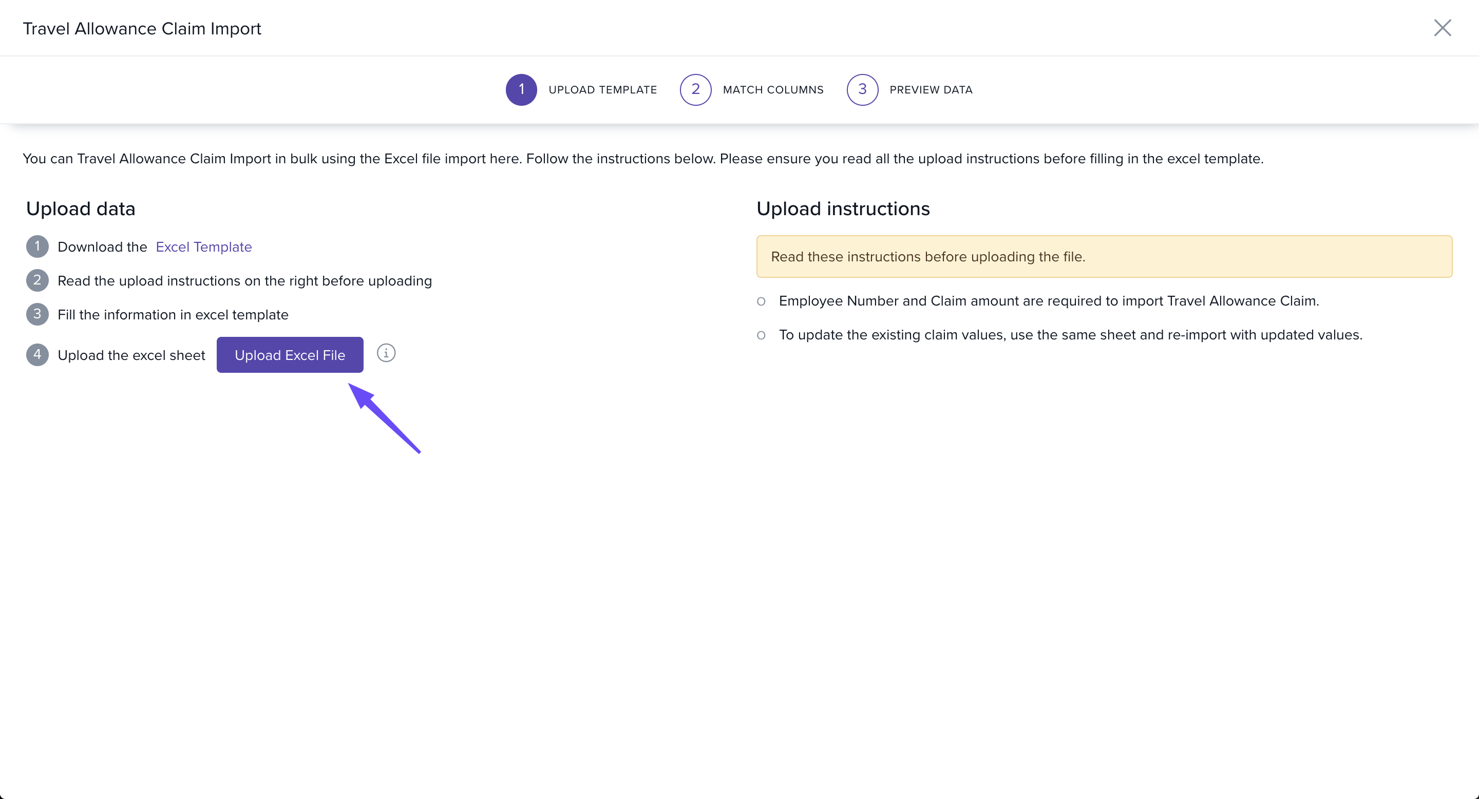 - Click Upload Excel File and select your saved template.