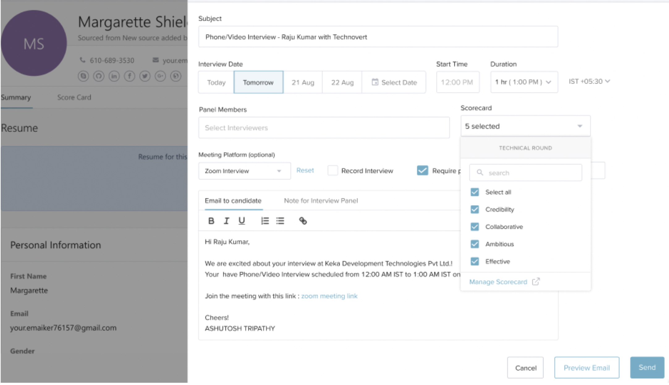 Interviewers can click the email link to access the Candidate Profile > Scorecard section and submit their feedback.