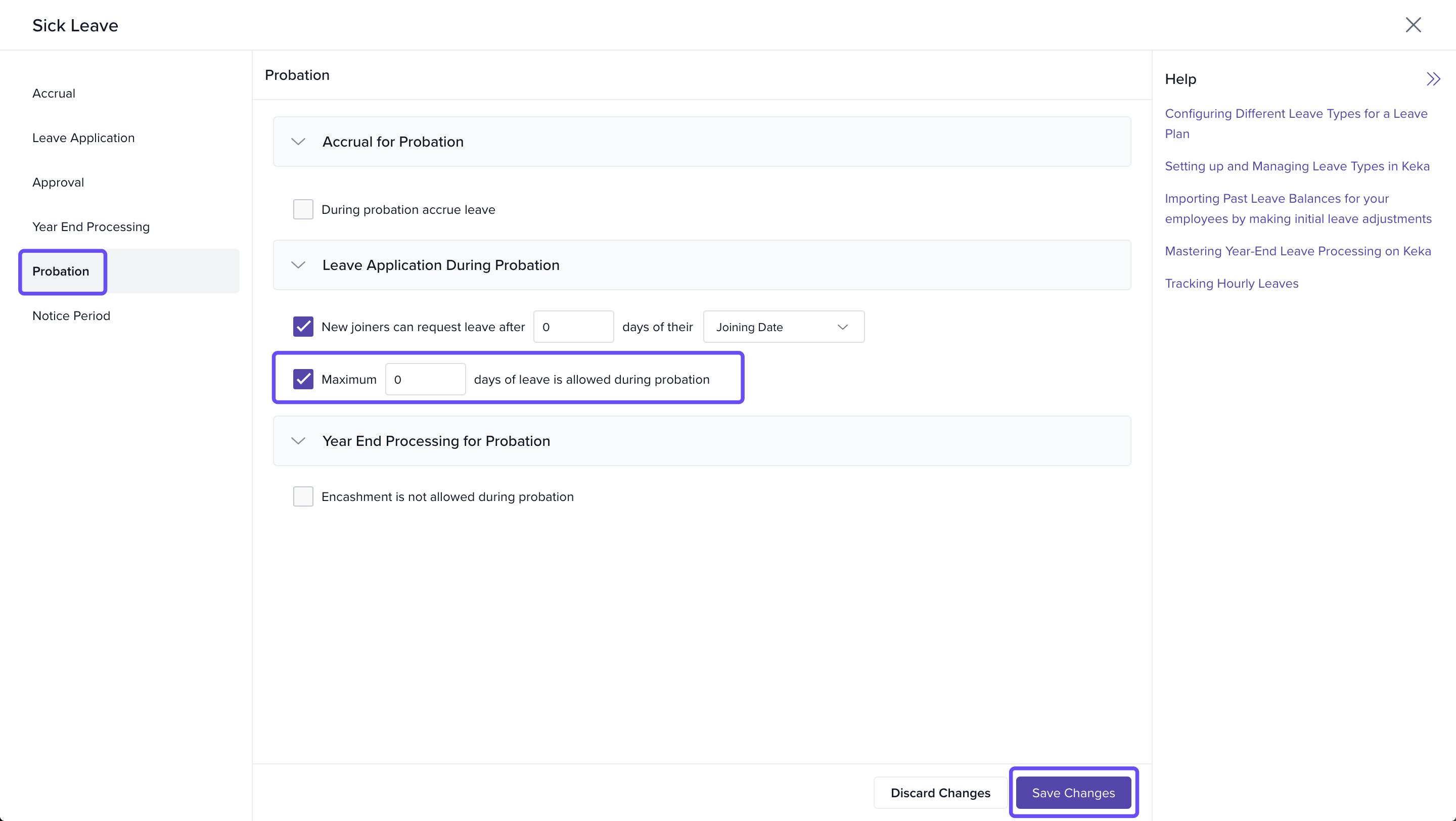 This will restrict employees on probation from applying for leave, or allow a specified number of leave days if needed.