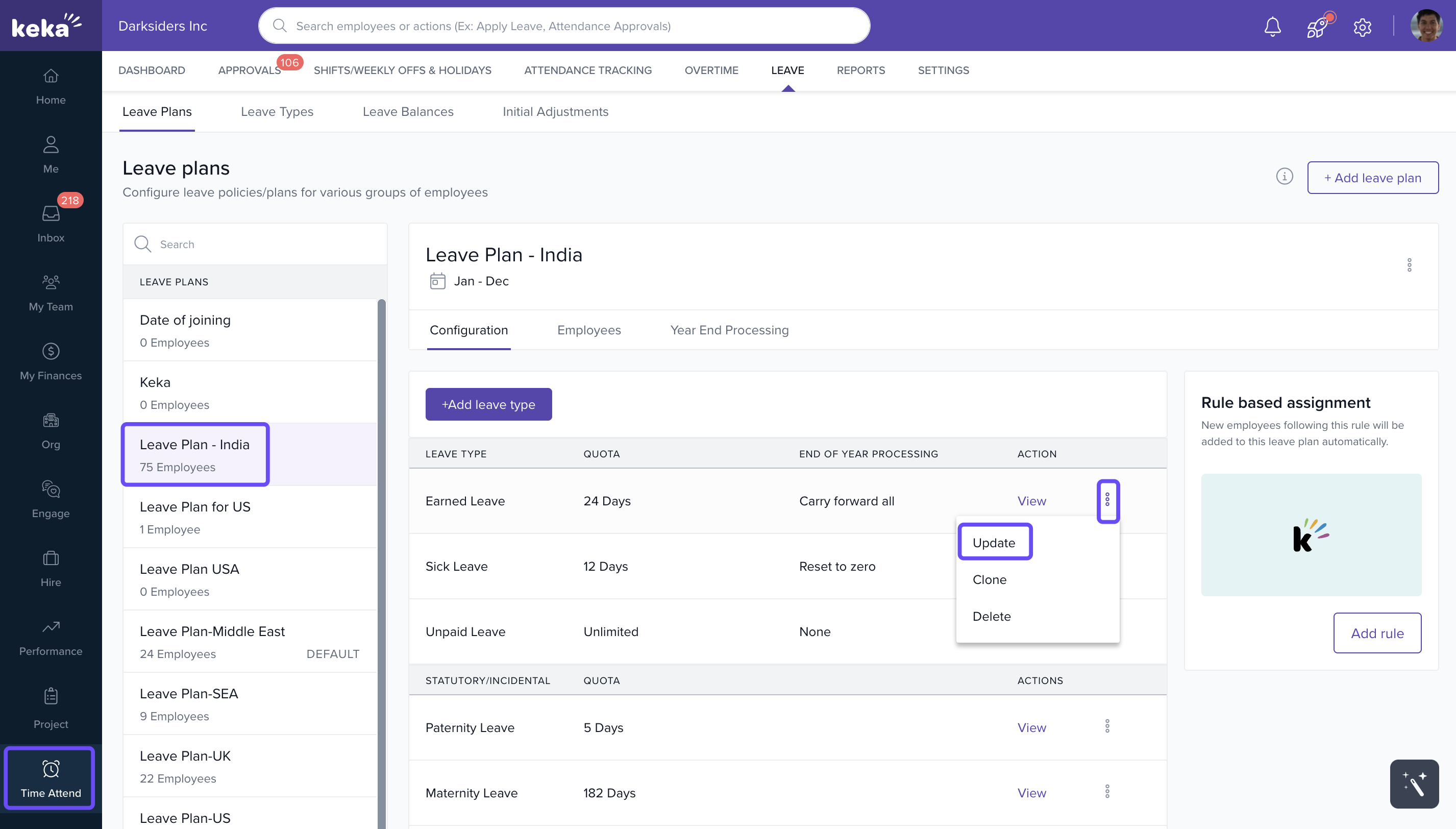 - Click on the Three Dots beside the Leave Type you want to allow employees to apply for in the next year, then click on update.