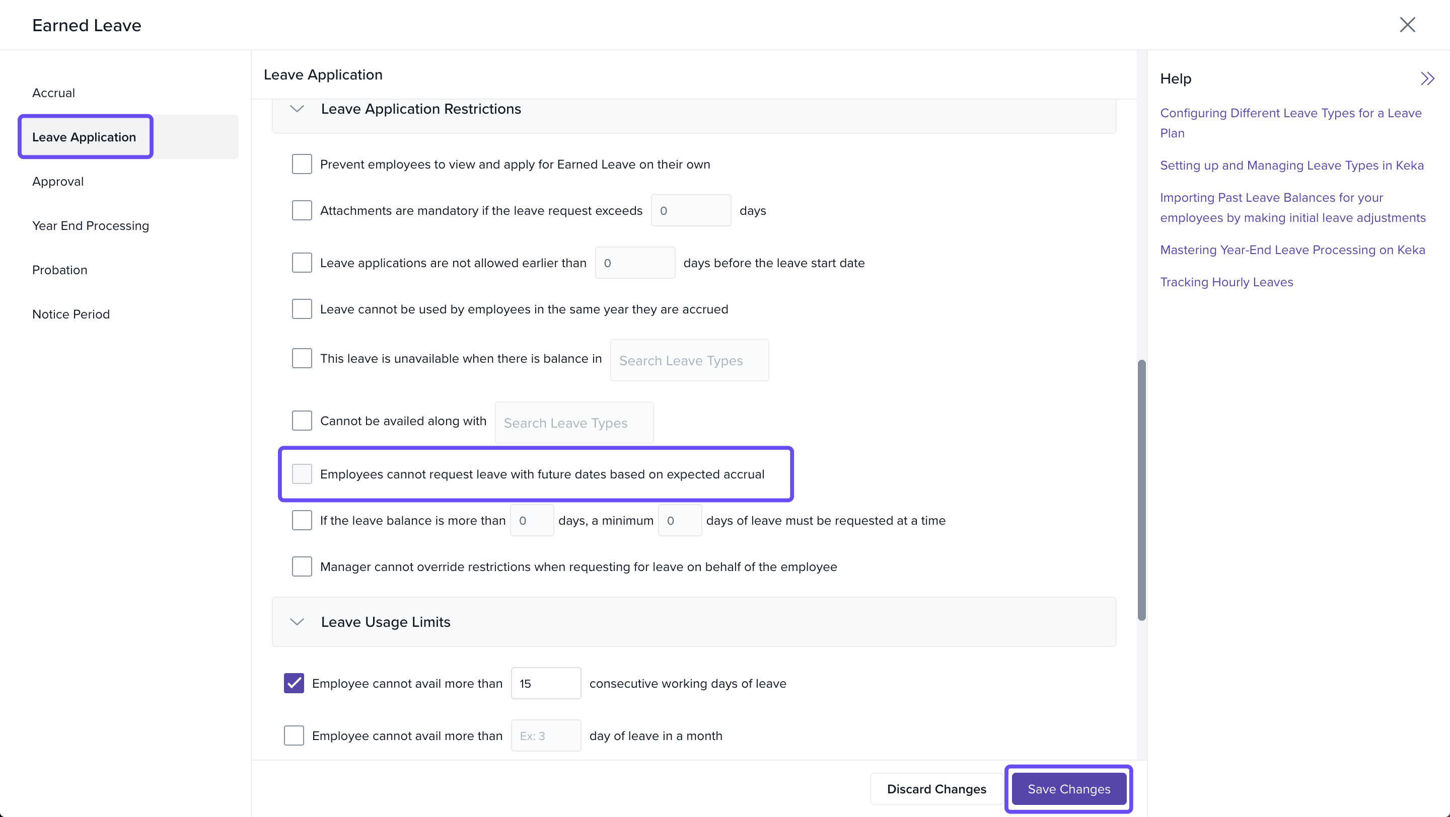 - Find the option "Employee cannot request leave with future dated leave based on expected accrual" and uncheck it.