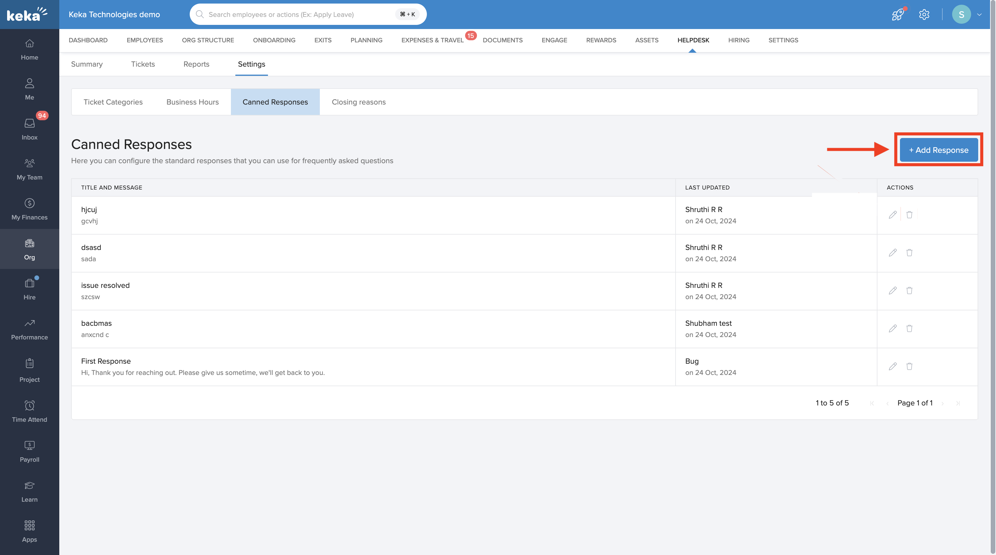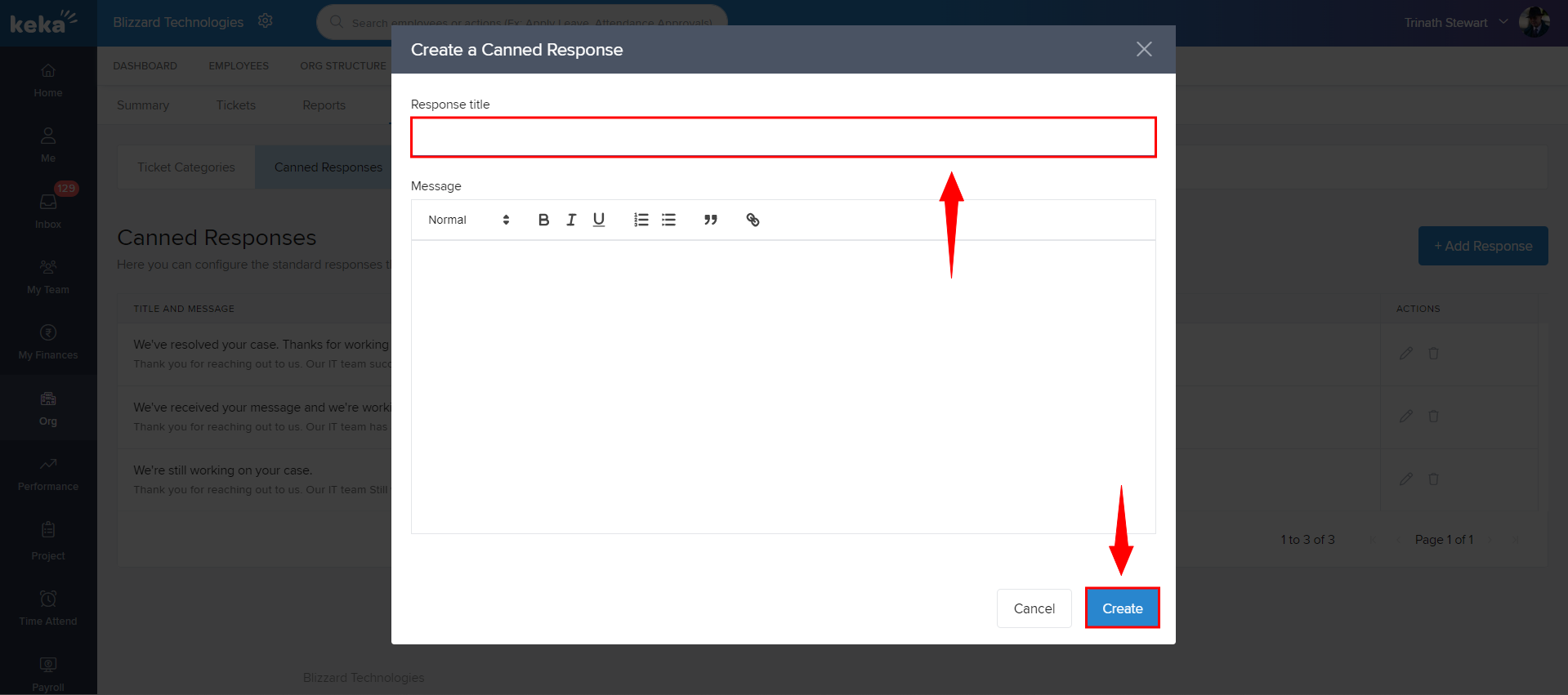 In Keka's helpdesk module, you can up your productivity game by using canned responses. These are pre-written answers that save you the hassle of typing out the same responses again and again. Here's how you can set these up in the helpdesk module: