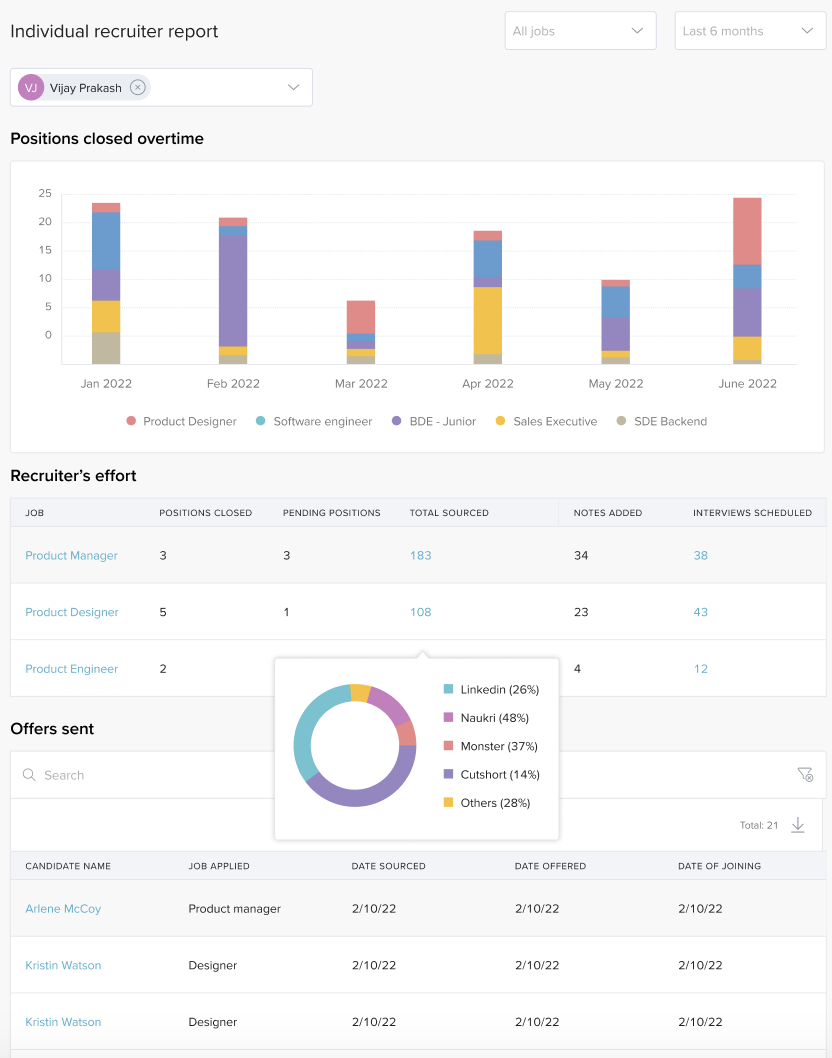- Offer acceptance rate: Indicates the total offers accepted out of total offer sent. This KPI talks about hiring efficiency and brand value.