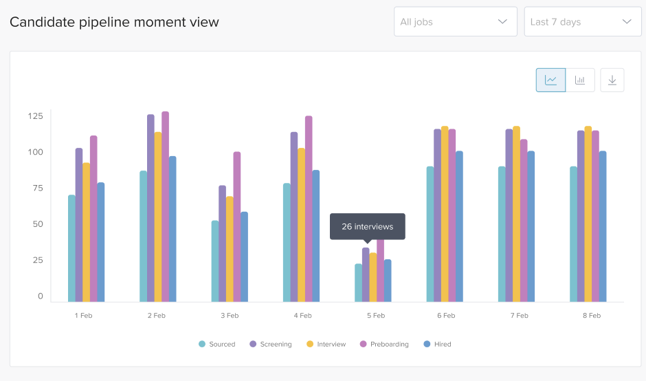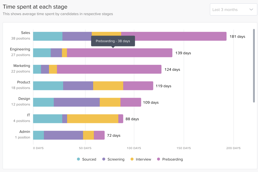 This widget is helpful in identifying bottlenecks in hiring process, it gives detail breakdown of main stages for jobs and departments.