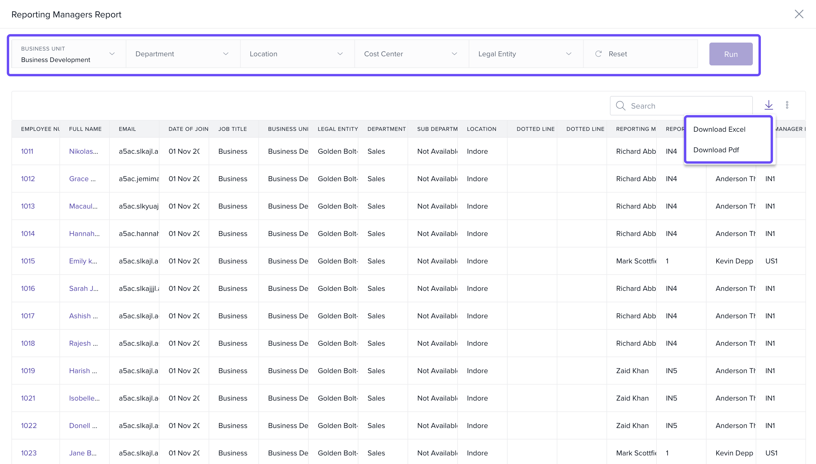 - Once the report appears, you can view the list of employees and their reporting managers, and click on the Download icon to export it in Excel or PDF format.