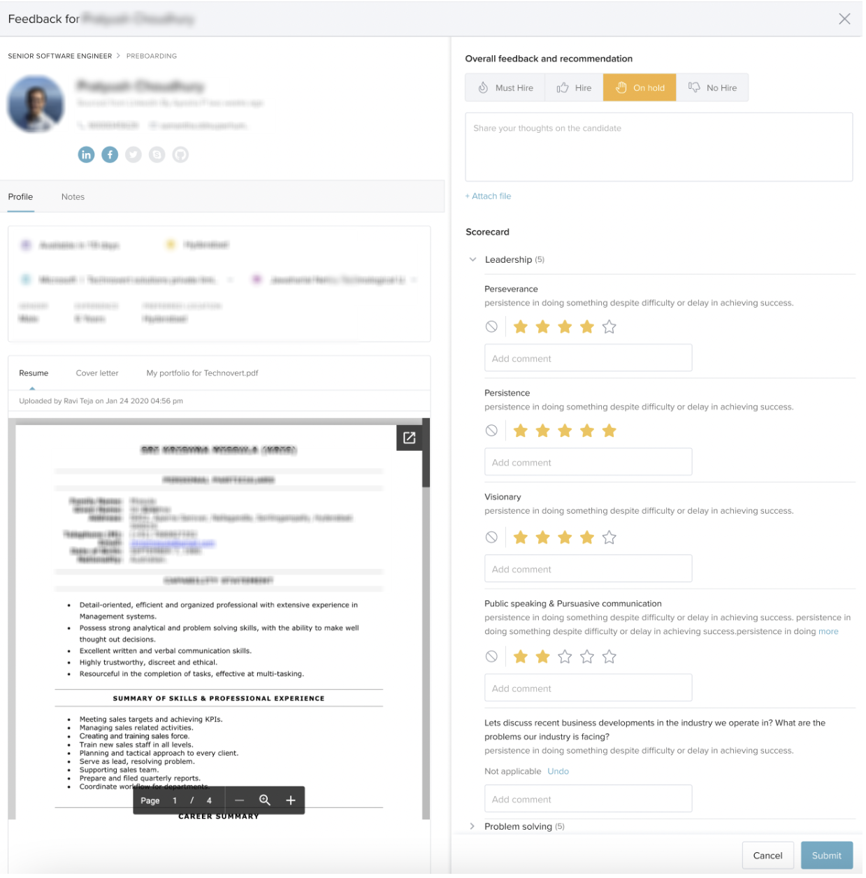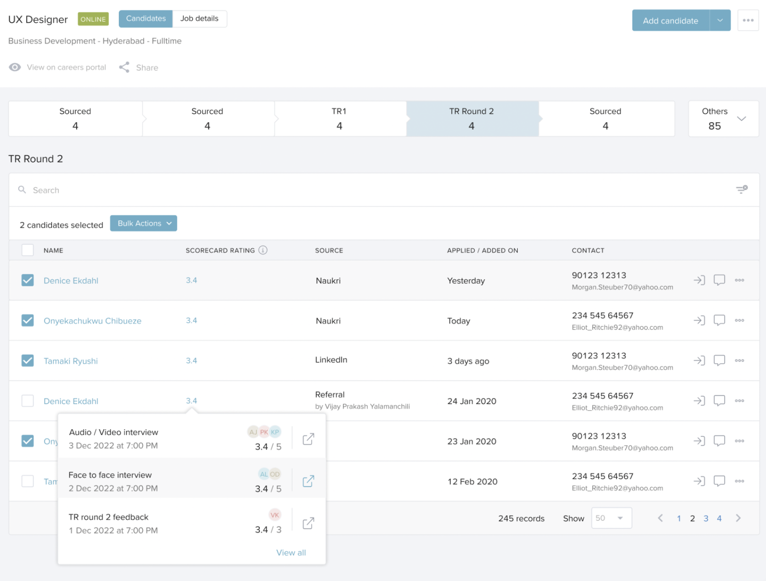 Using scorecards, recruiters and interviewers can assess candidates based on predefined competencies and questions. Ratings are then averaged across sections, interviewers, and interview rounds to support better hiring decisions.