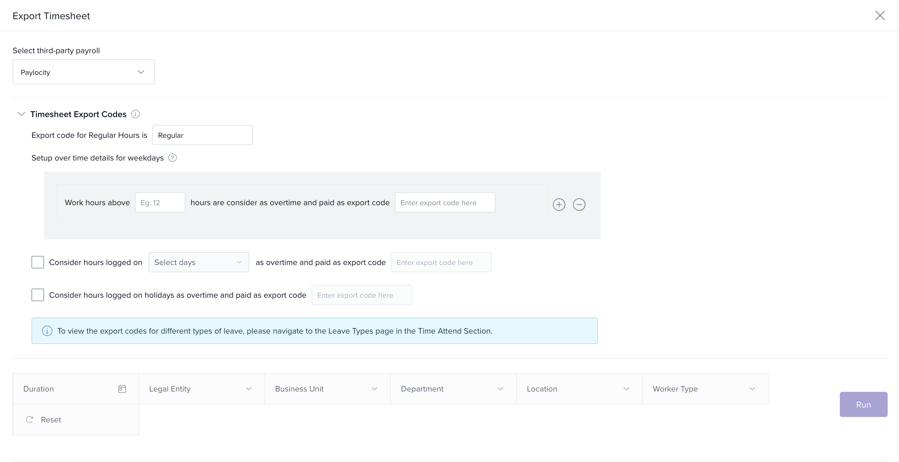 - Weekly Offs: Check the box, specify the day(s), and enter an export code