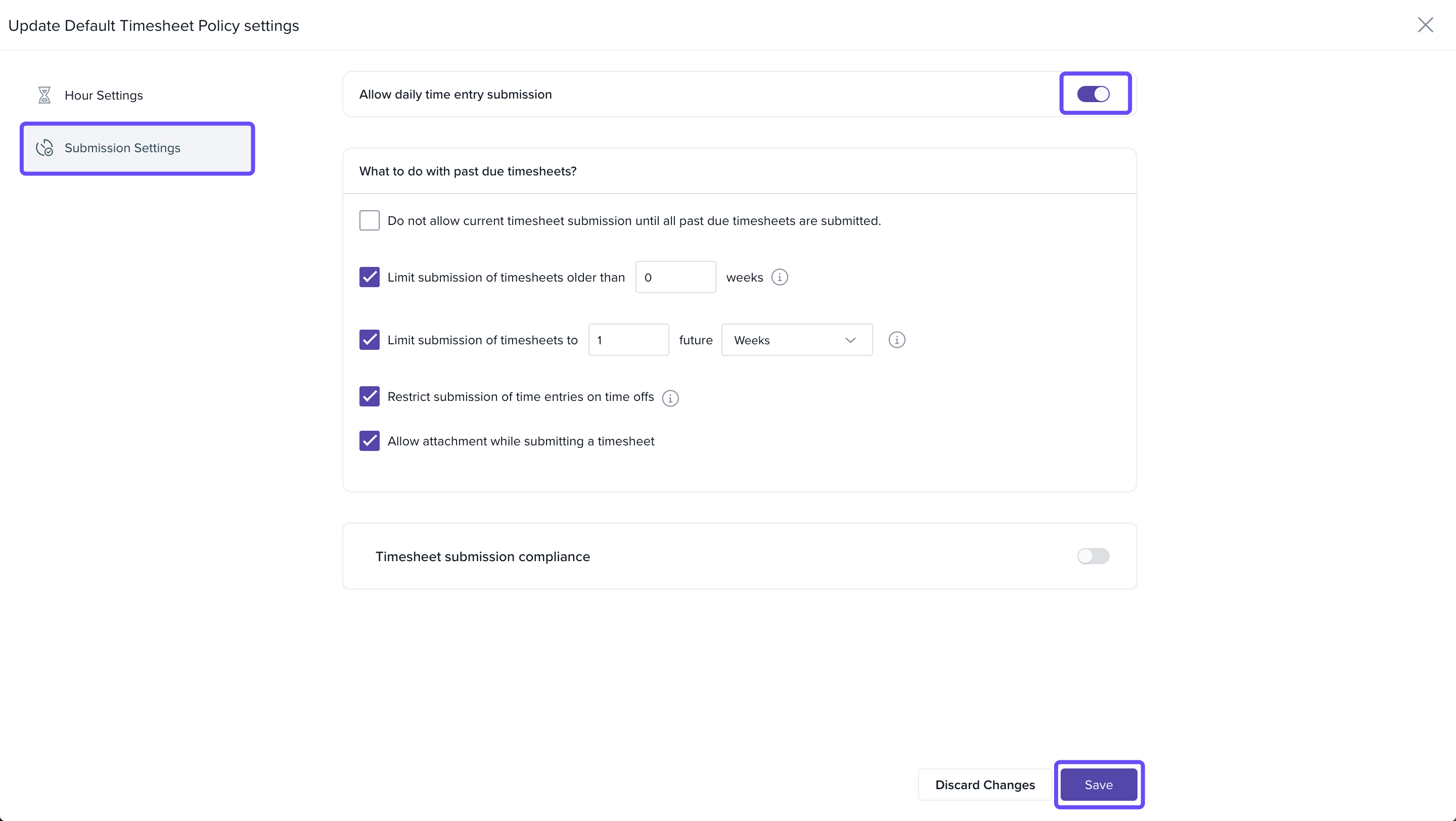 In the Submission Settings section, check the box for Allow Daily Timesheet Submission.